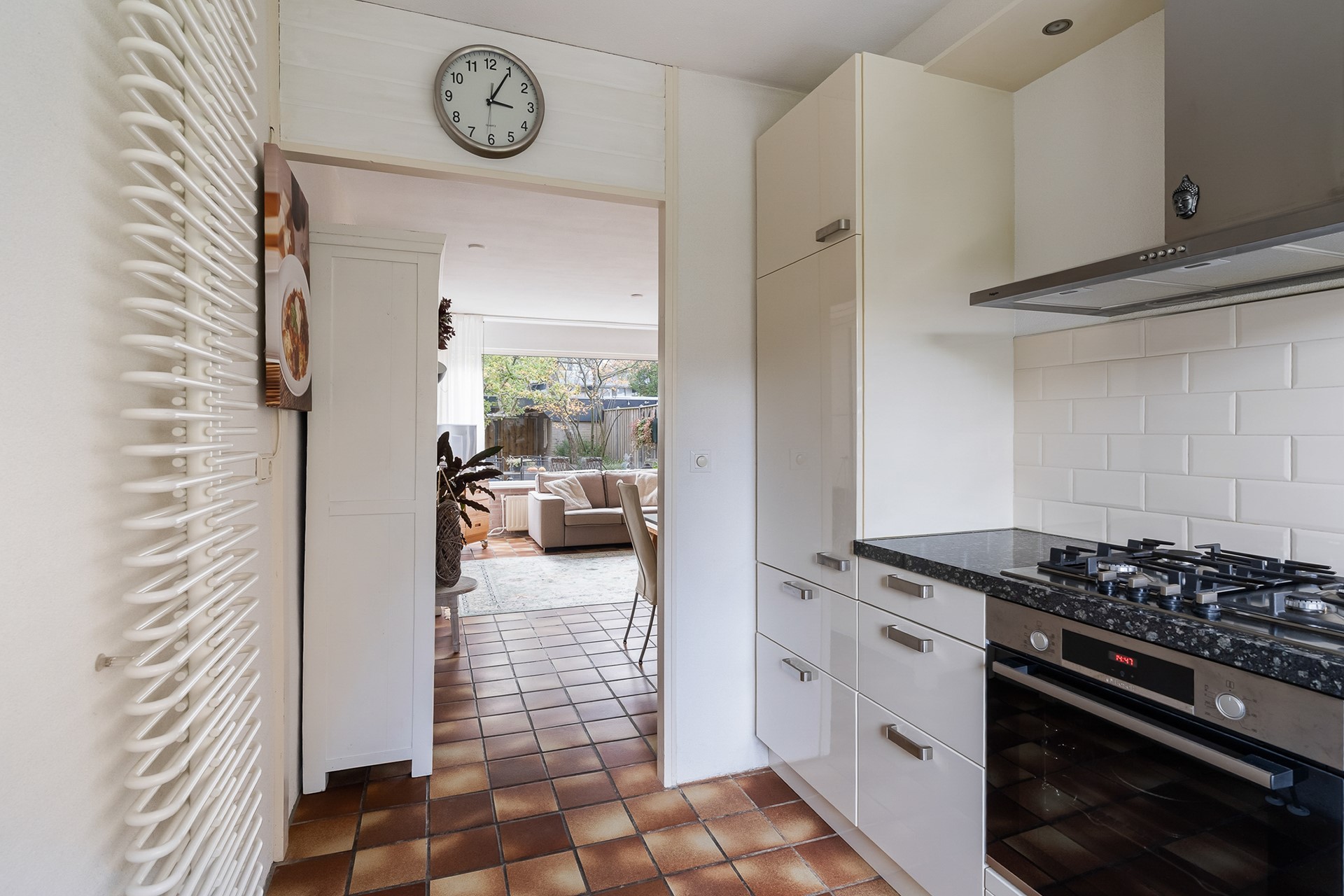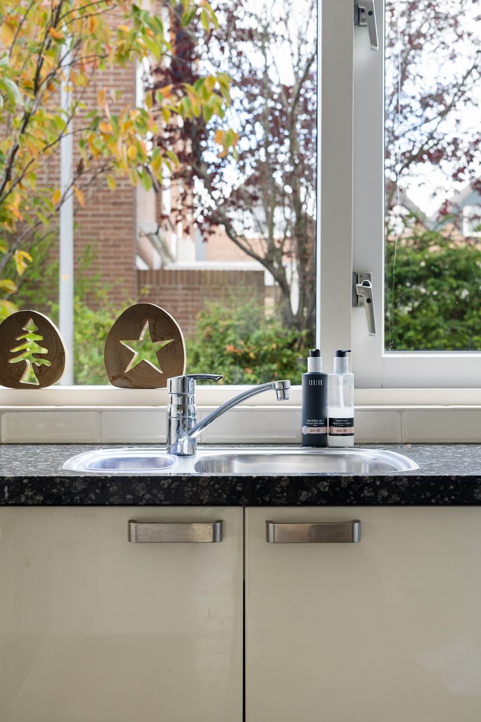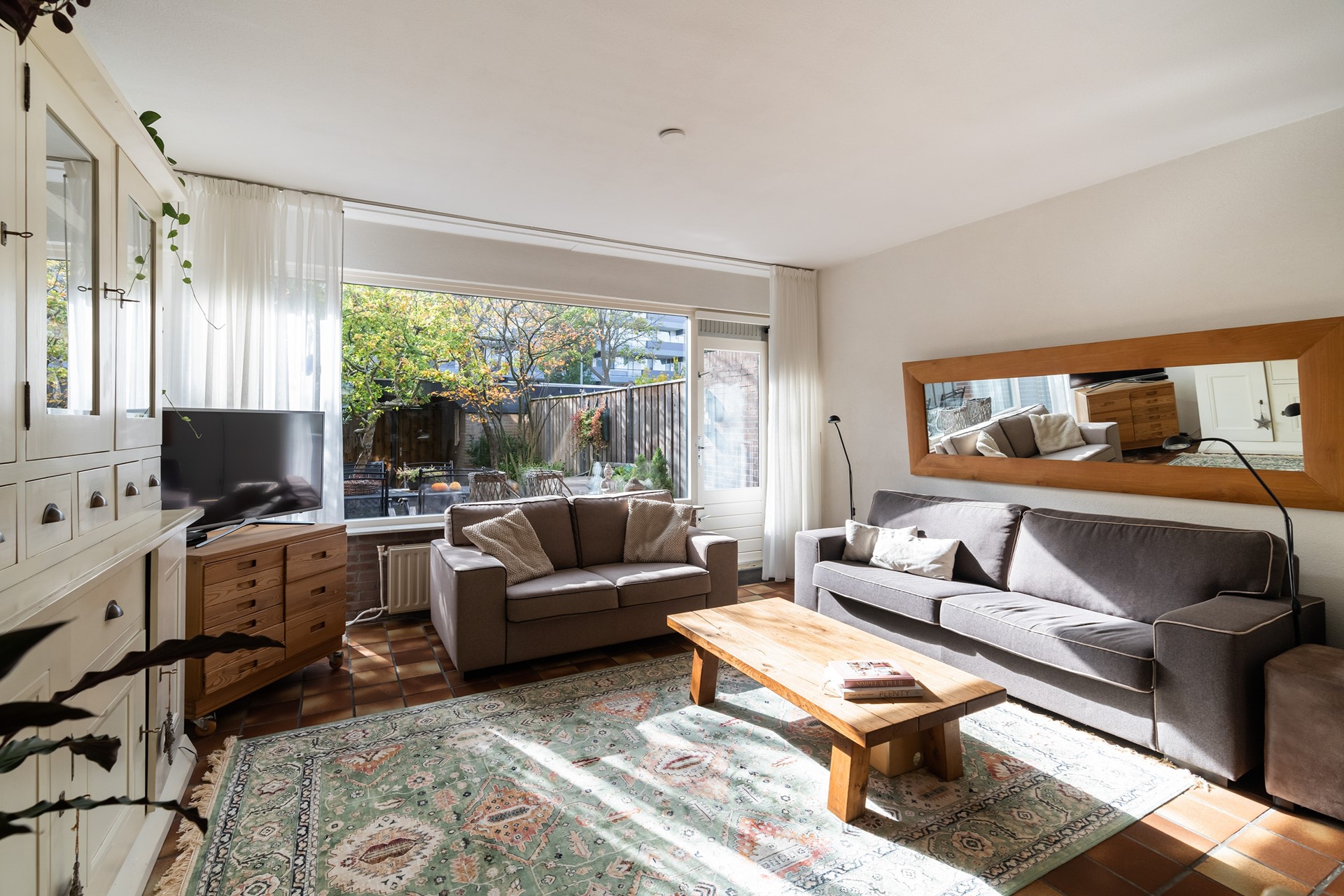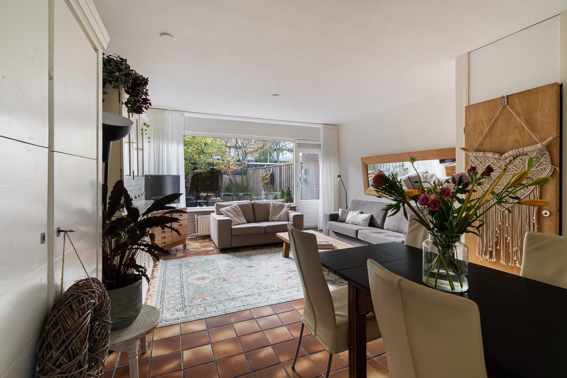 Zodra je de voordeur opent, valt het daglicht je al tegemoet in de ruime hal. Hier zit alles slim ingedeeld: aan de ene kant vind je praktische zaken als de meterkast en het moderne toilet, aan de andere kant leidt de trap naar boven, en uiteraard is er toegang tot de woonkamer. Die woonkamer is écht het kloppende hart van het huis. Bijzonder detail: de authentieke vloertegeltjes herinneren nog aan het bouwjaar, maar verder is het strak en eigentijds. Dankzij de grote raampartijen – met dubbel glas! – valt het zonnetje royaal naar binnen en zorgt voor een prettige sfeer. De zithoek aan de tuinzijde nodigt uit om te ontspannen met uitzicht op het groen. Ook in de zomer zit je hier goed, want het nieuwe zonnescherm houdt de warmte buiten en het leven binnen lekker koel.