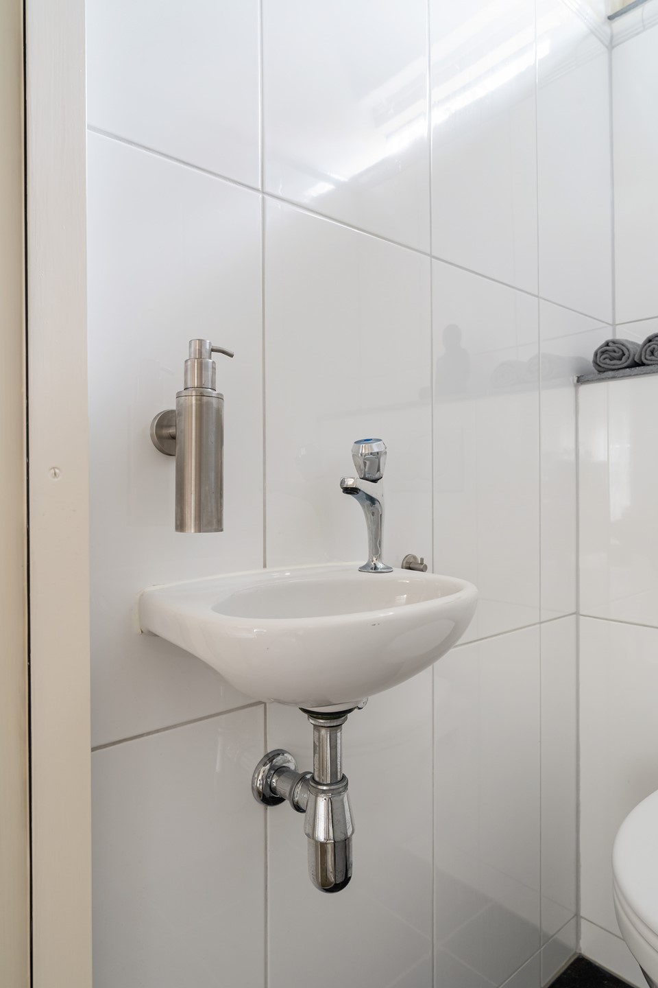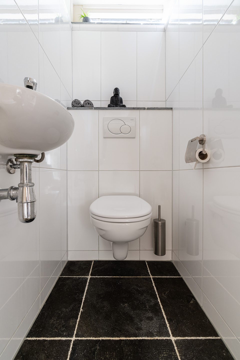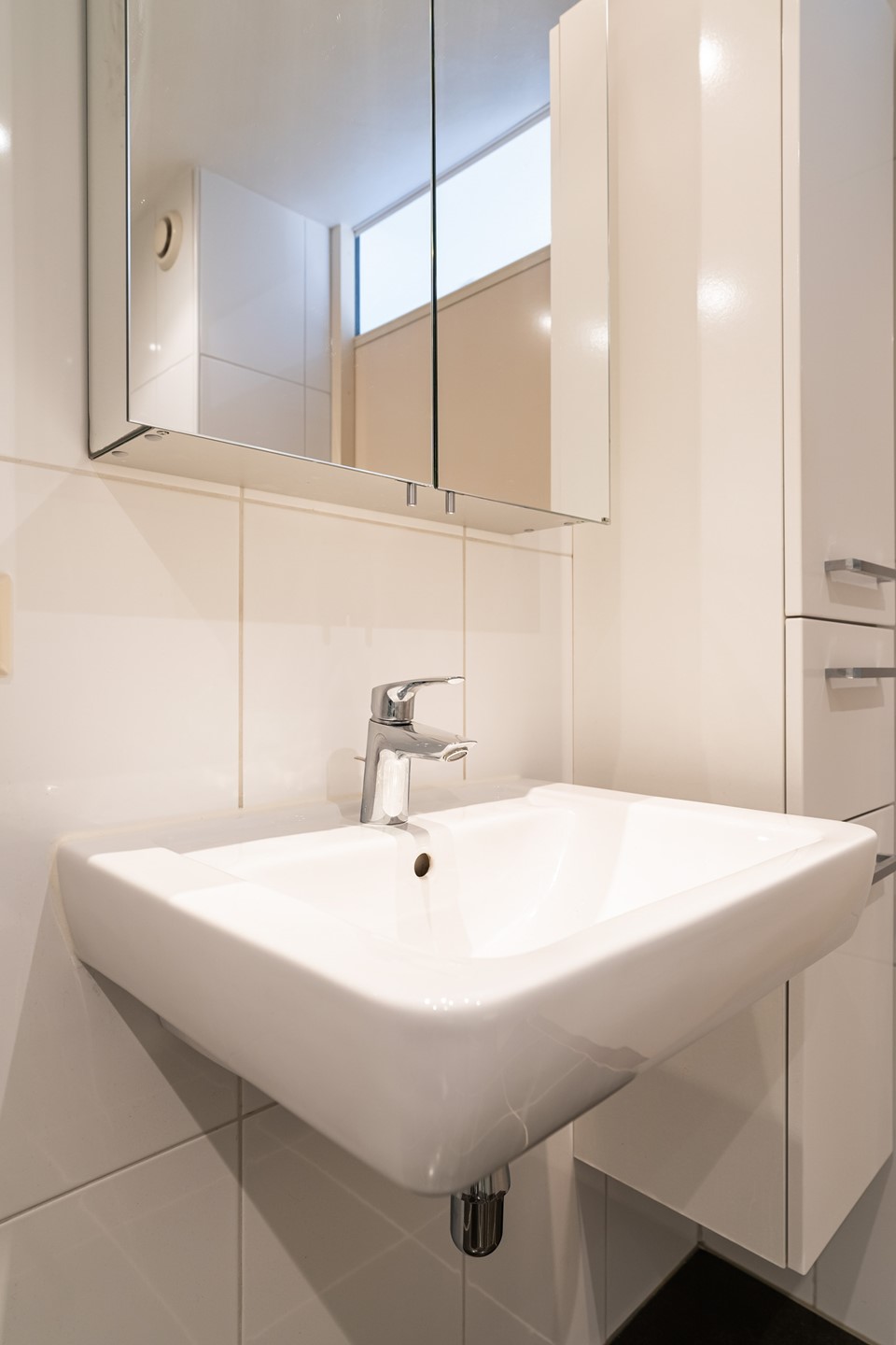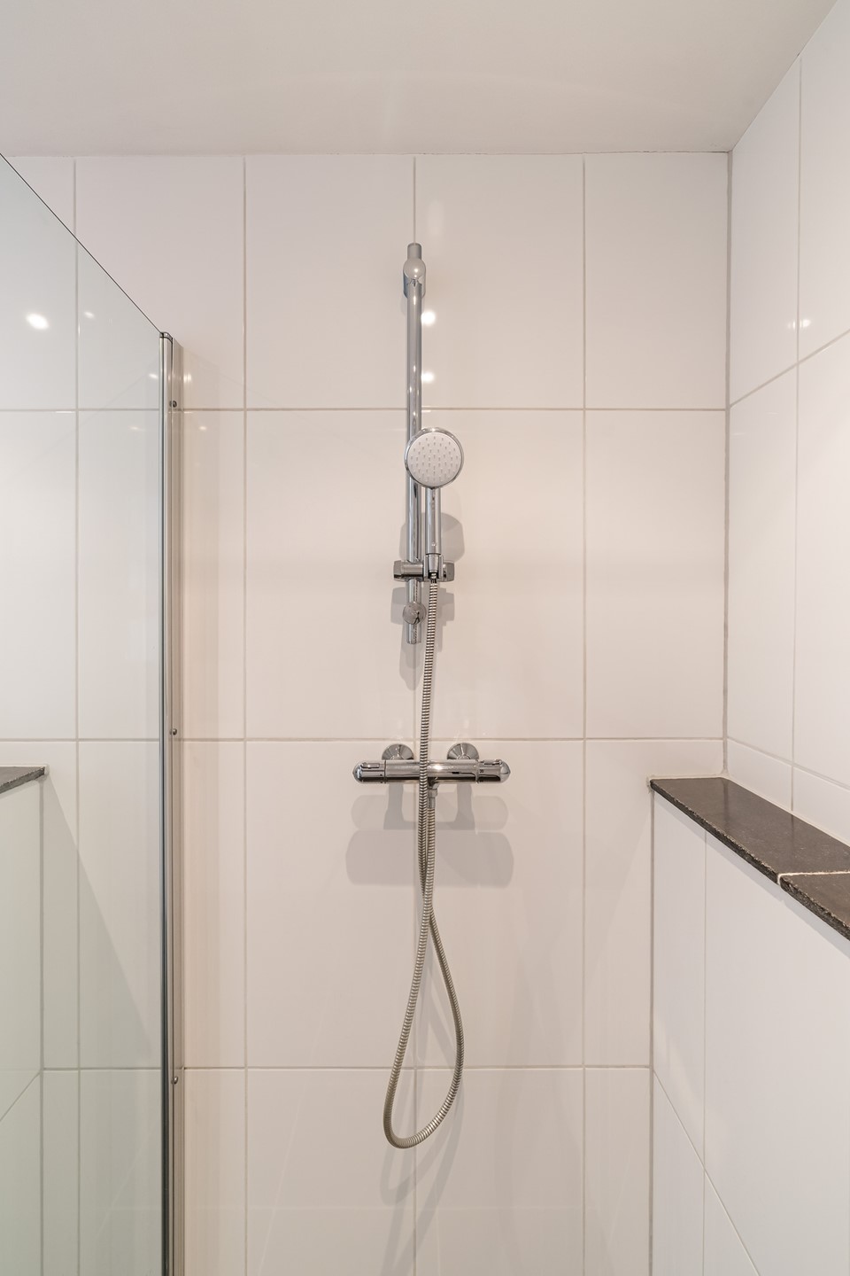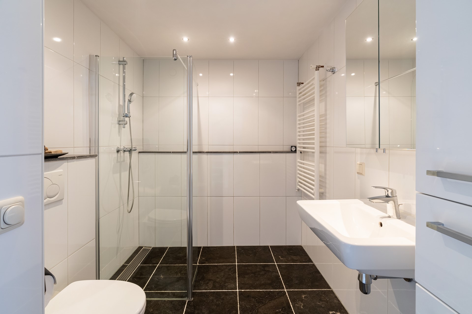 De moderne badkamer is tot in de puntjes verzorgd, met een strak wastafelmeubel, inloopdouche, comfortabele handdoekradiator en een fraai zwevend toilet. Je begint je dag goed met een verfrissende douche is in deze badkamer.
