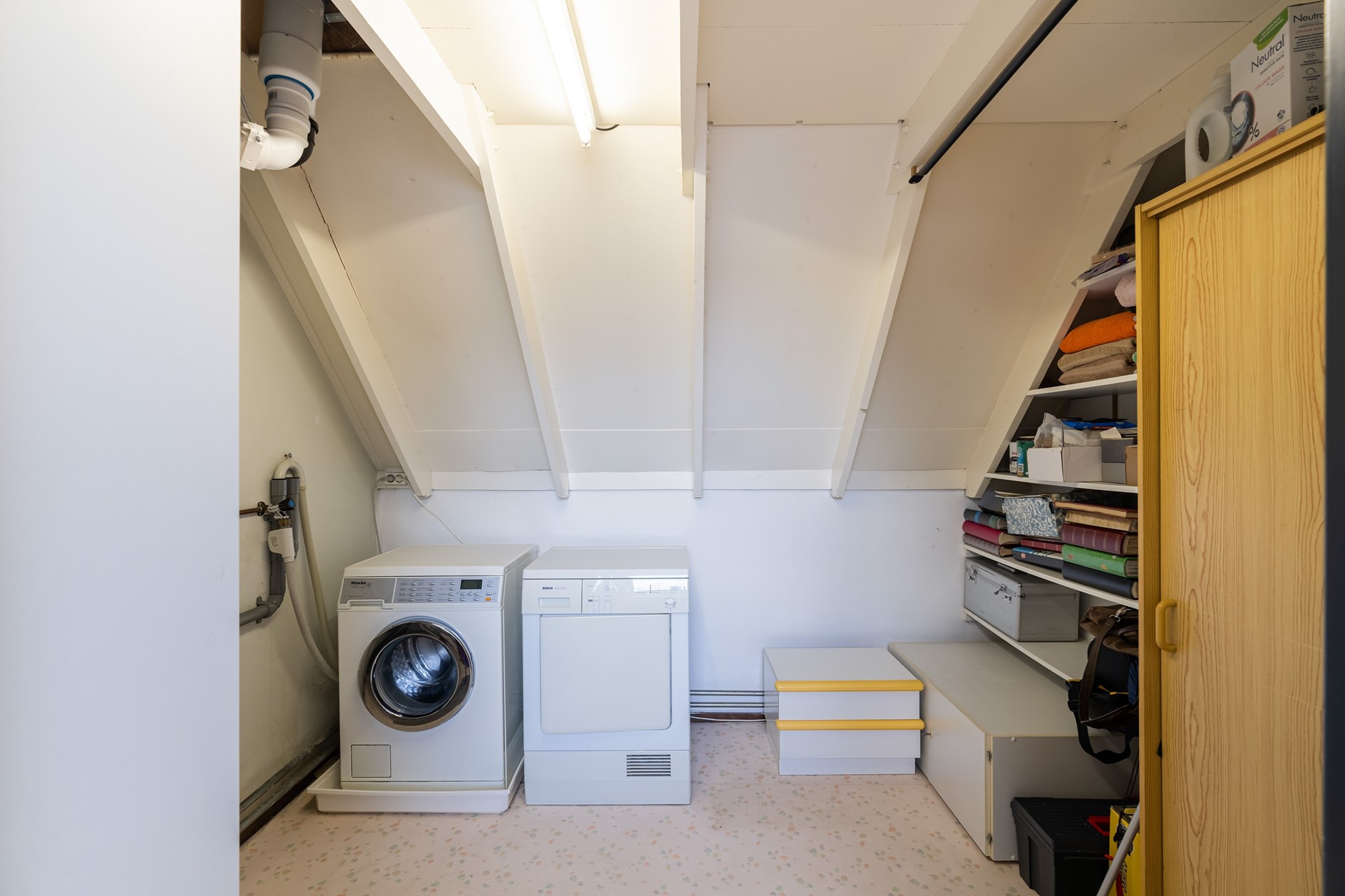 In het midden, slim weggewerkt, vind je de ruimte voor wasmachine, droger en cv-ketel. Zelfs dan blijft er nog bergruimte over voor koffers, dozen en wat je verder nog uit het zicht wilt plaatsen.