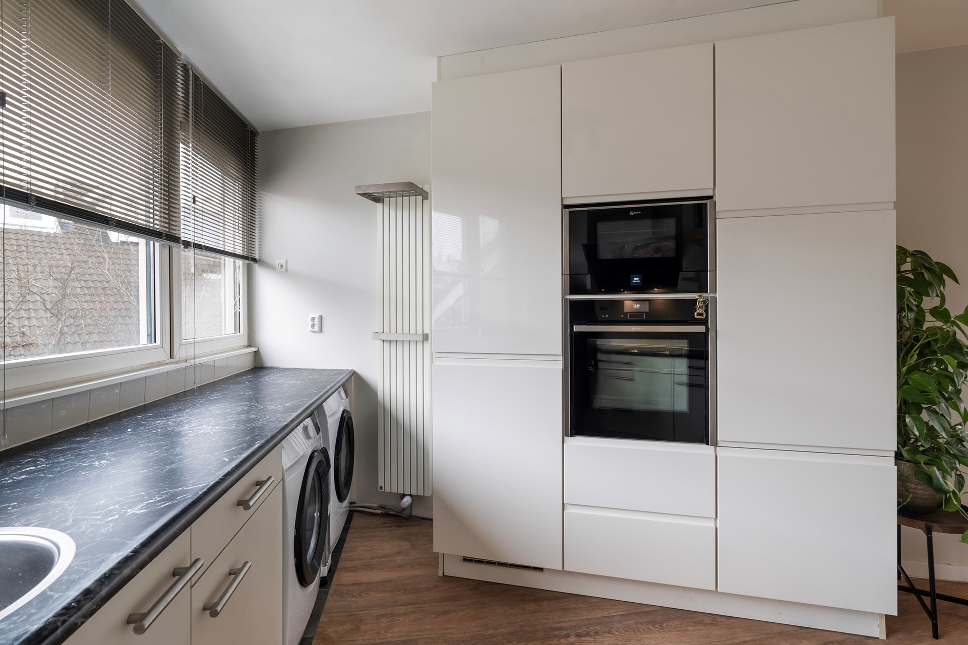 De eyecatcher is de moderne witte keuken met stoere zwarte details, compleet met hoogwaardige inbouwapparatuur (o.a. 5-pits inductie) en een slimme opstelling voor de wasmachine en droger. De volledige woning is voorzien van kunststof kozijnen met HR++ glas en dakisolatie, wat zorgt voor rust en een lage energierekening.