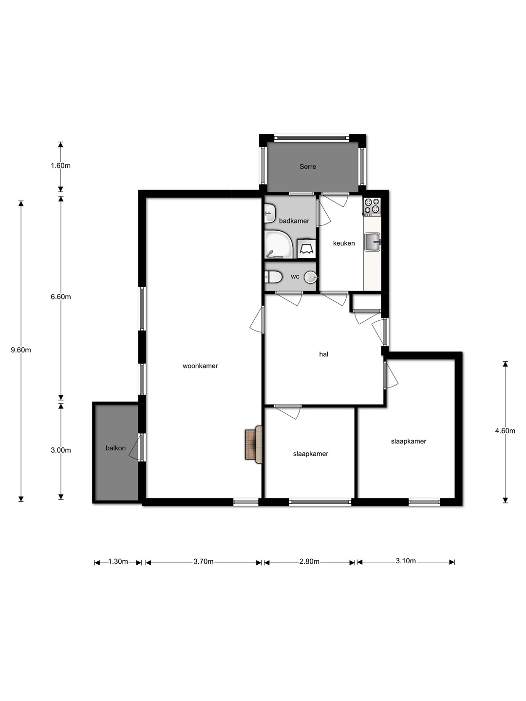 De gesloten keuken is praktisch ingericht met onder- en bovenkasten, gaskookplaat, afzuigkap en oven. Vanuit de keuken bereik je de serre (ca. 7 m²) die een verlengstuk vormt van de leefruimte en in elk seizoen te gebruiken is.