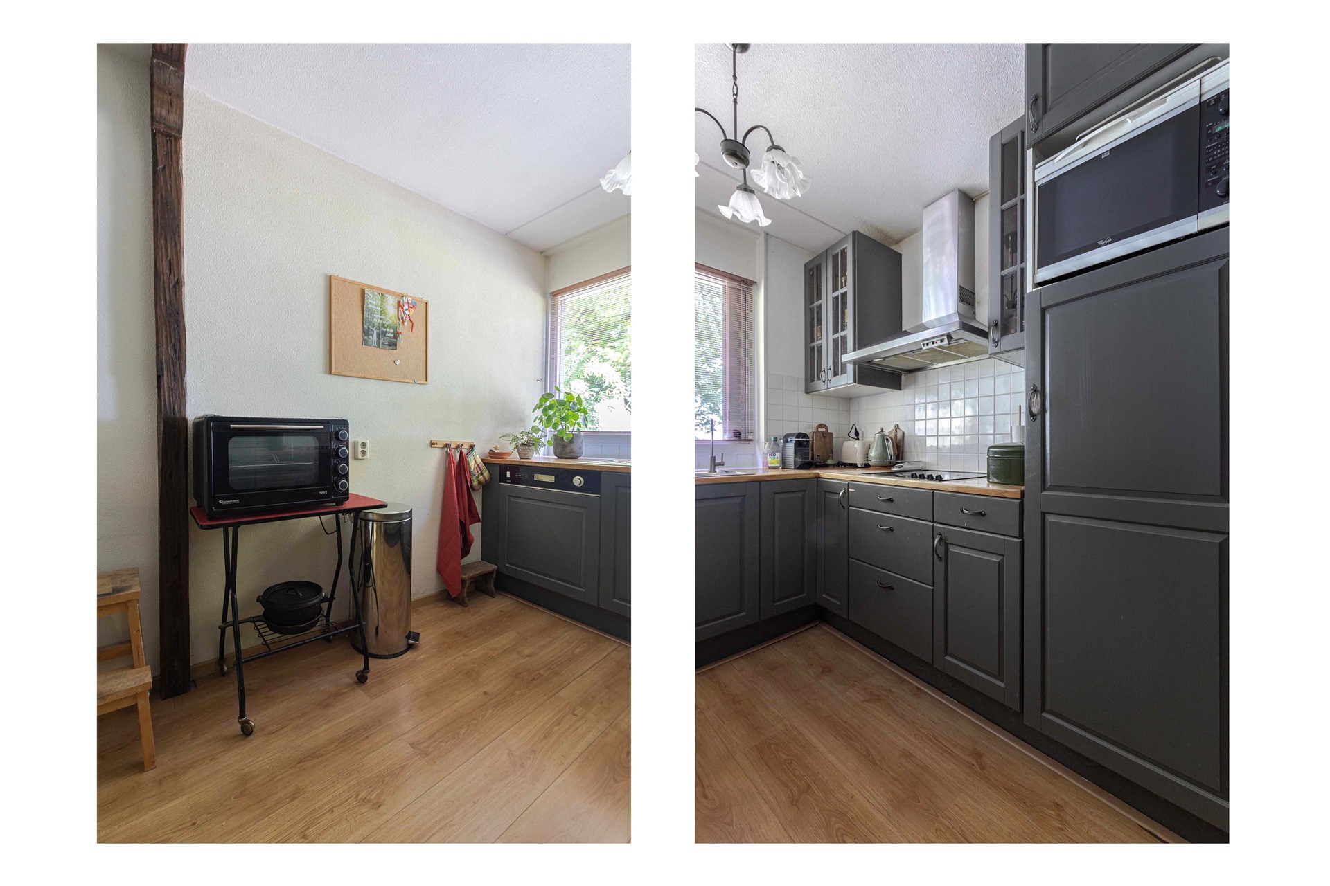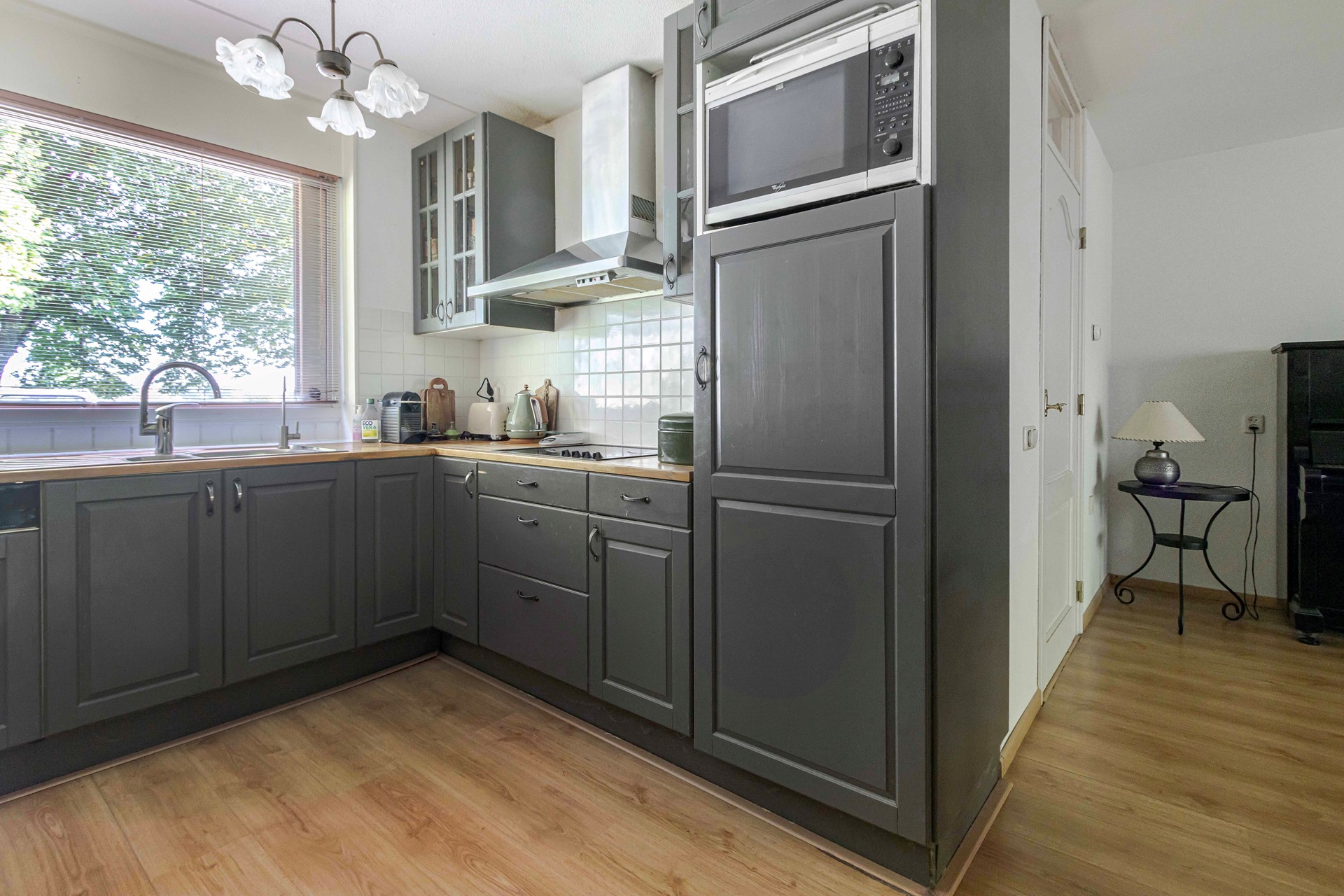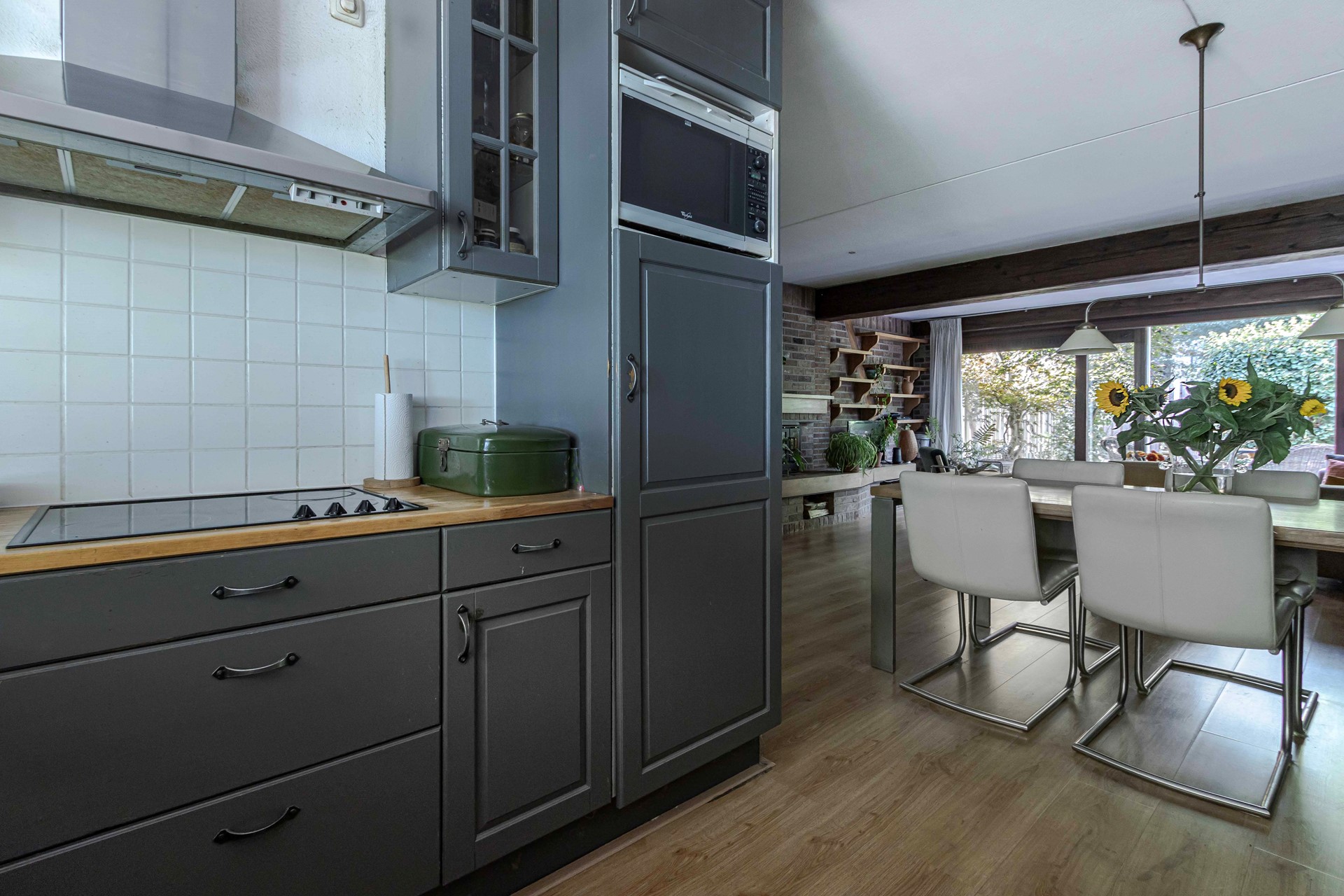 Aan de voorkant van de woning ligt een half open keuken in een hoekopstelling.