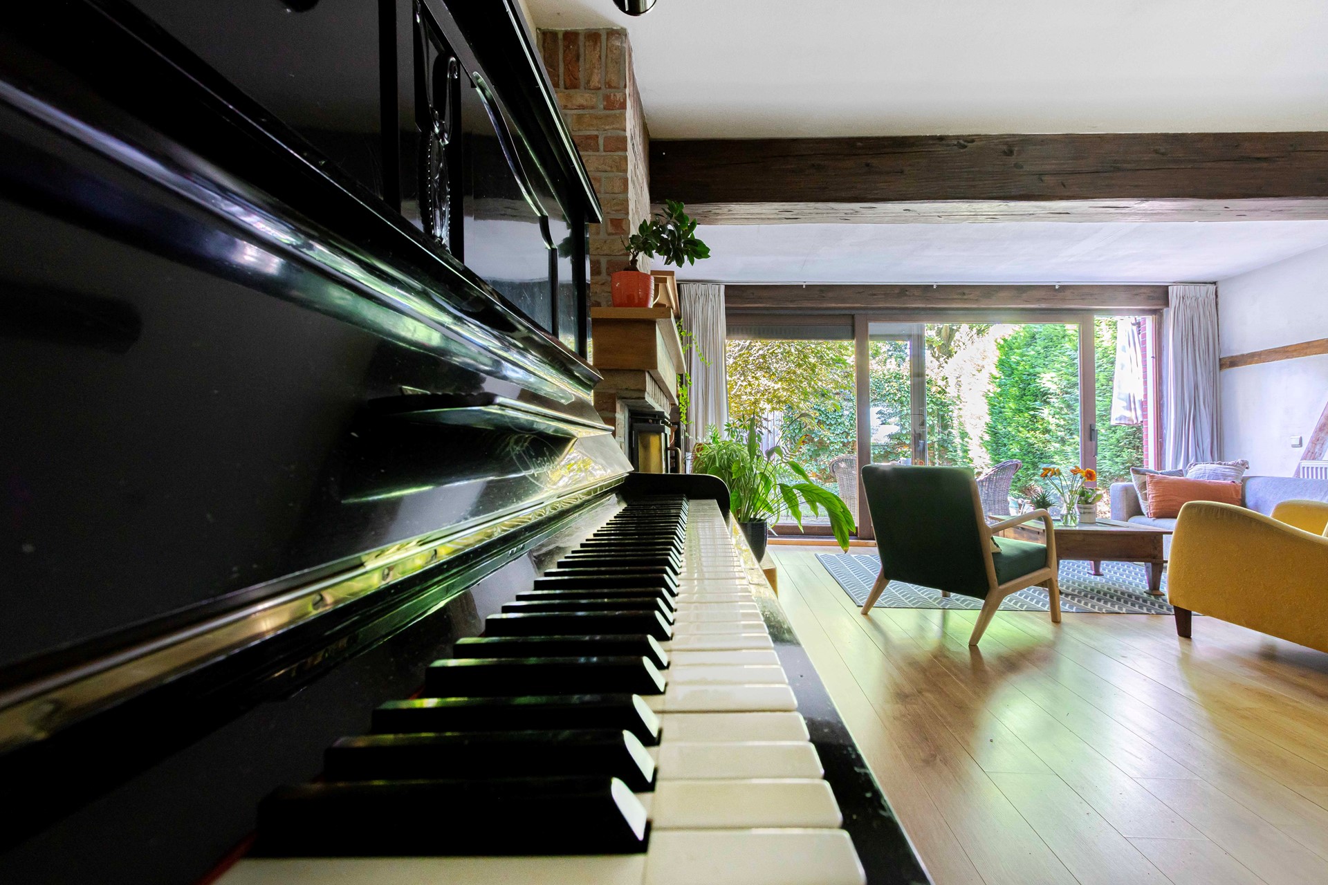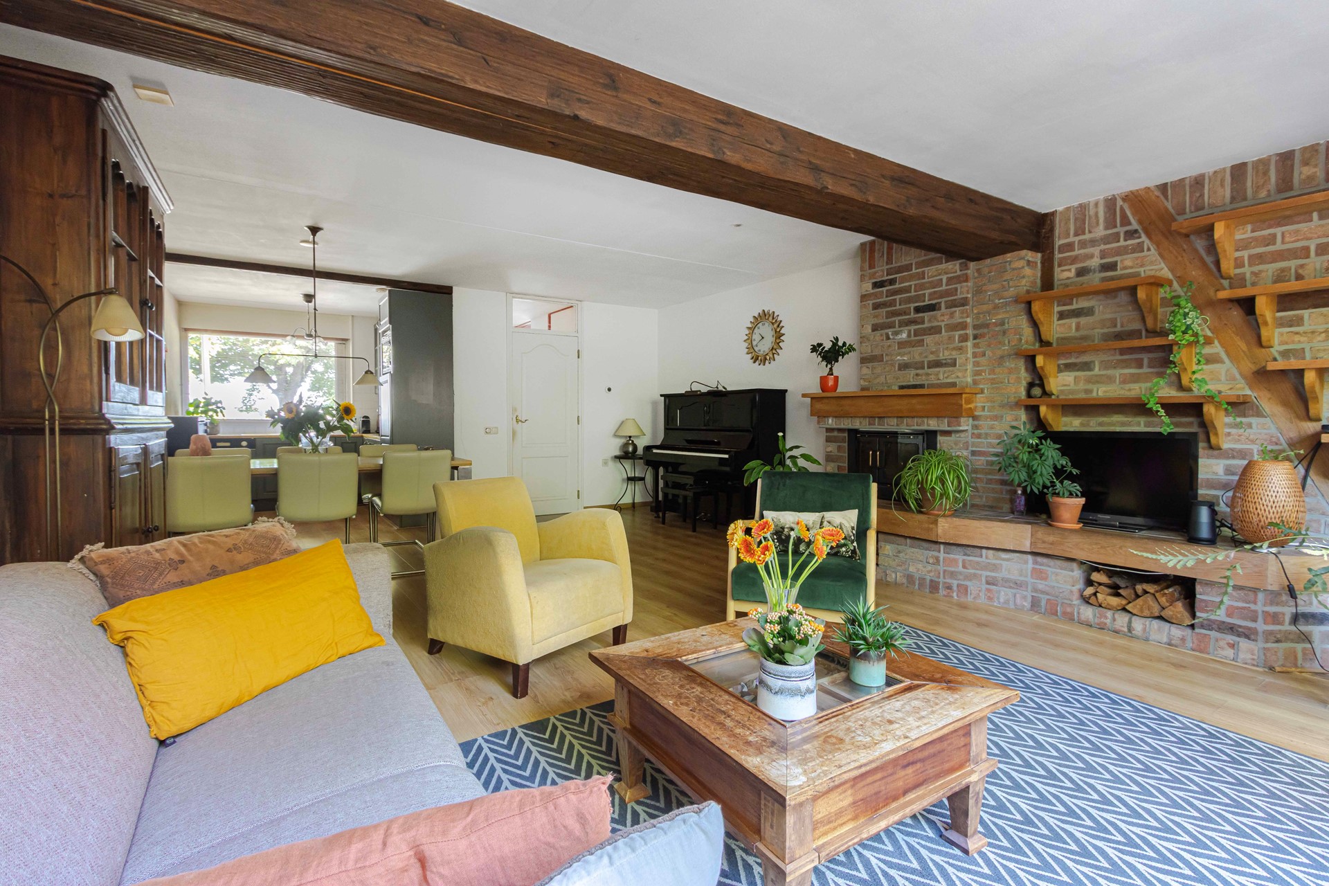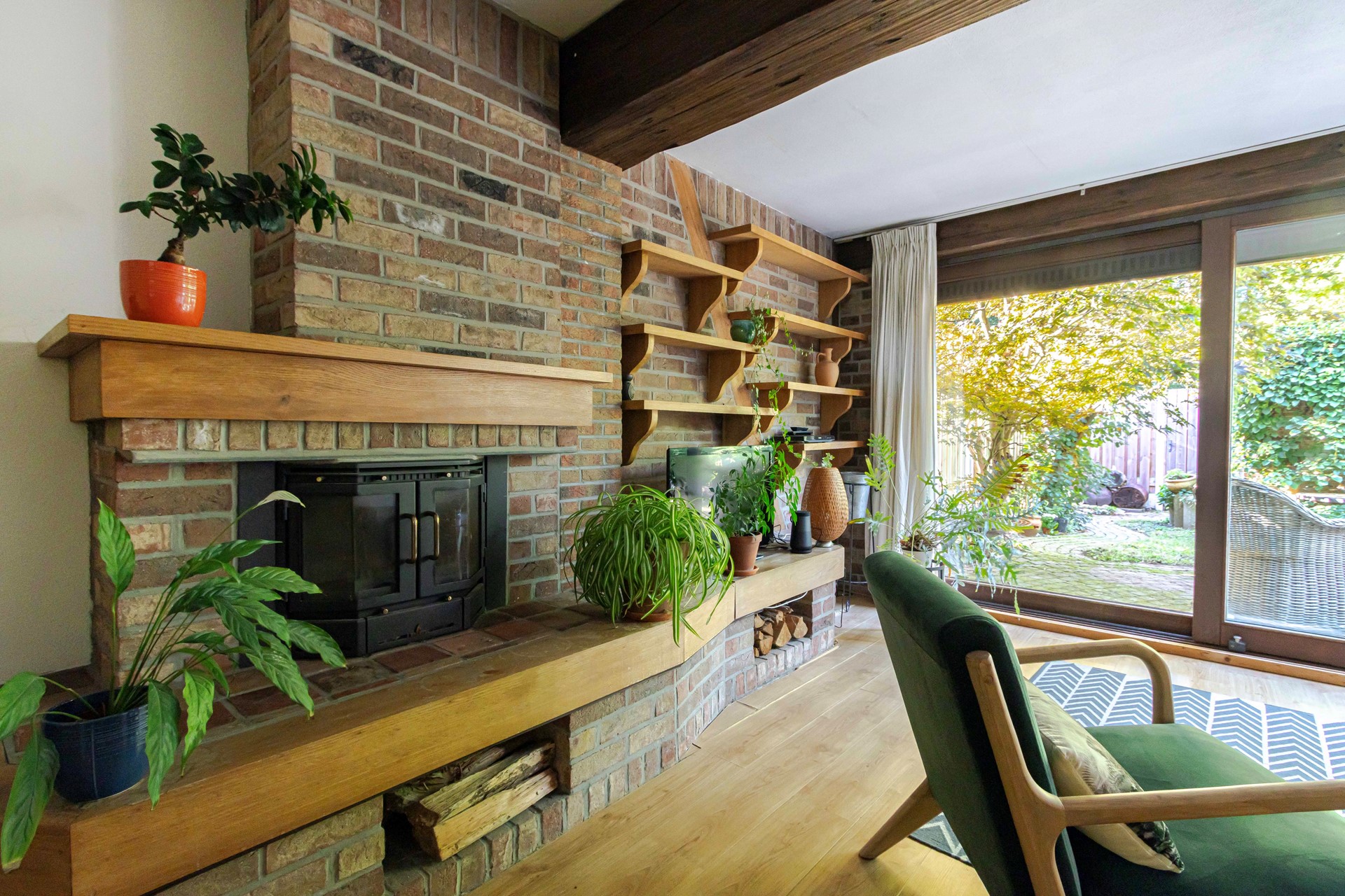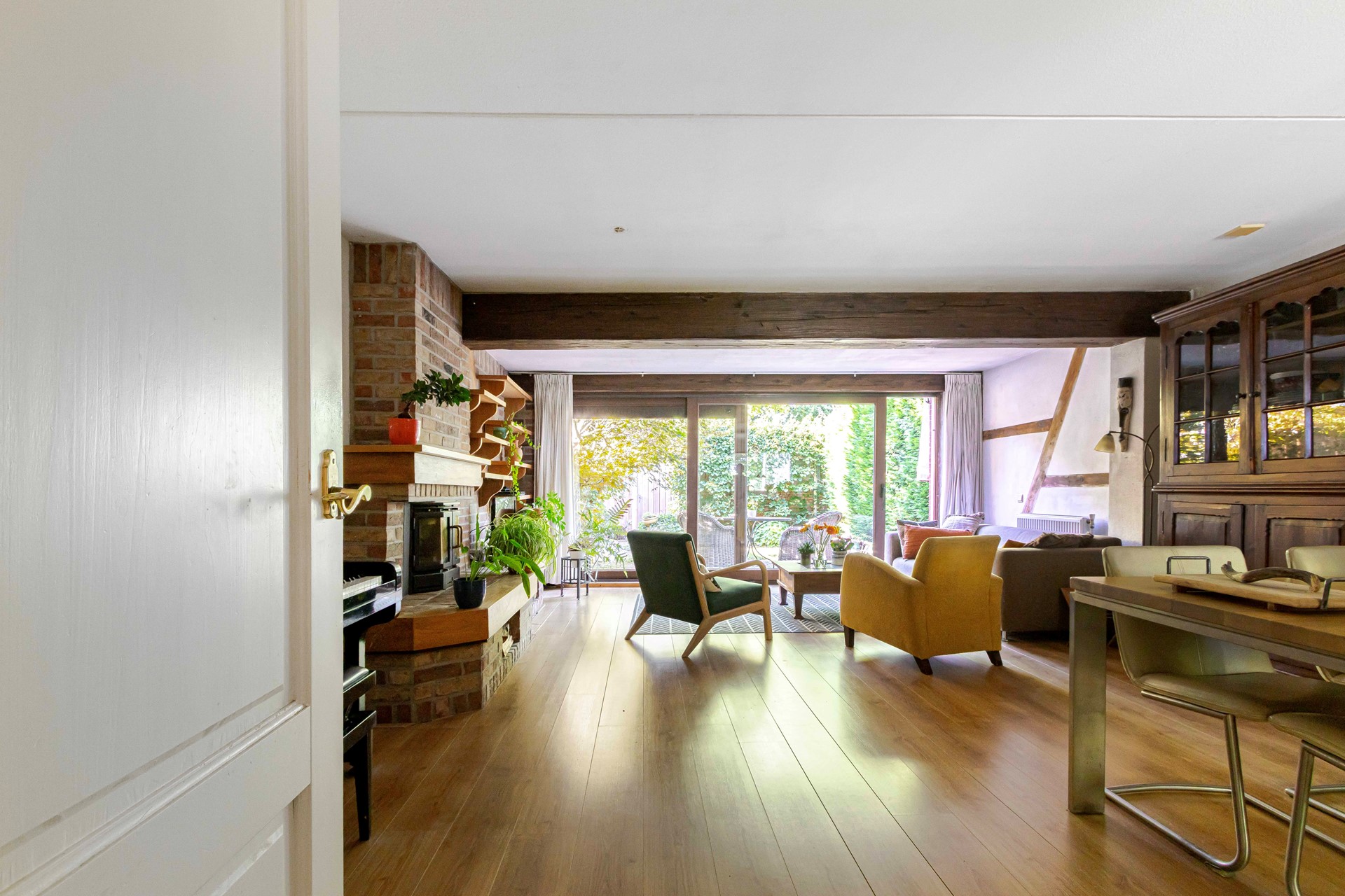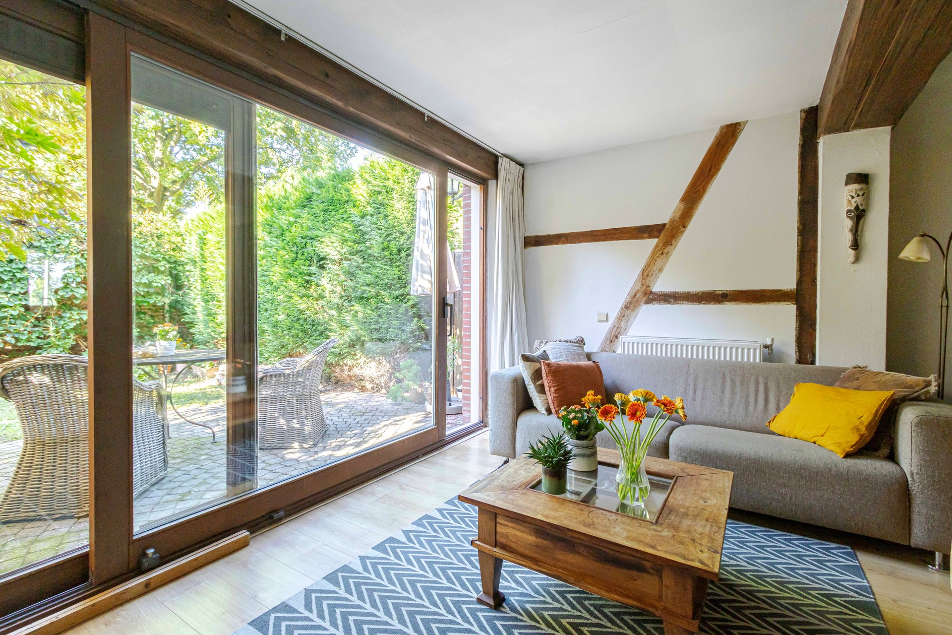 De woonkamer met aanbouw over de gehele breedte en met unieke details, geeft toegang tot de achtertuin gelegen op zuid-west, met een handige tuinberging en een achteringang.