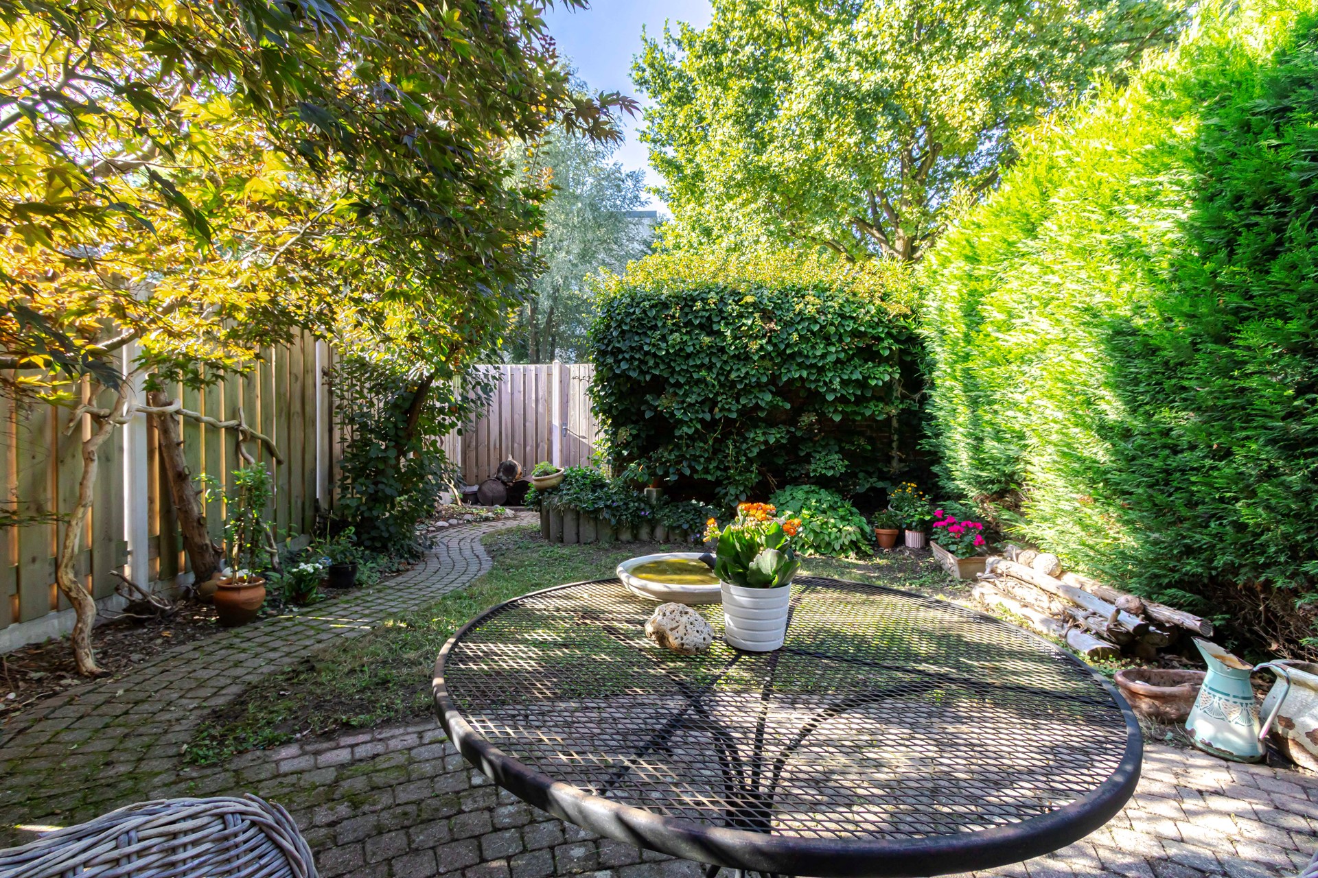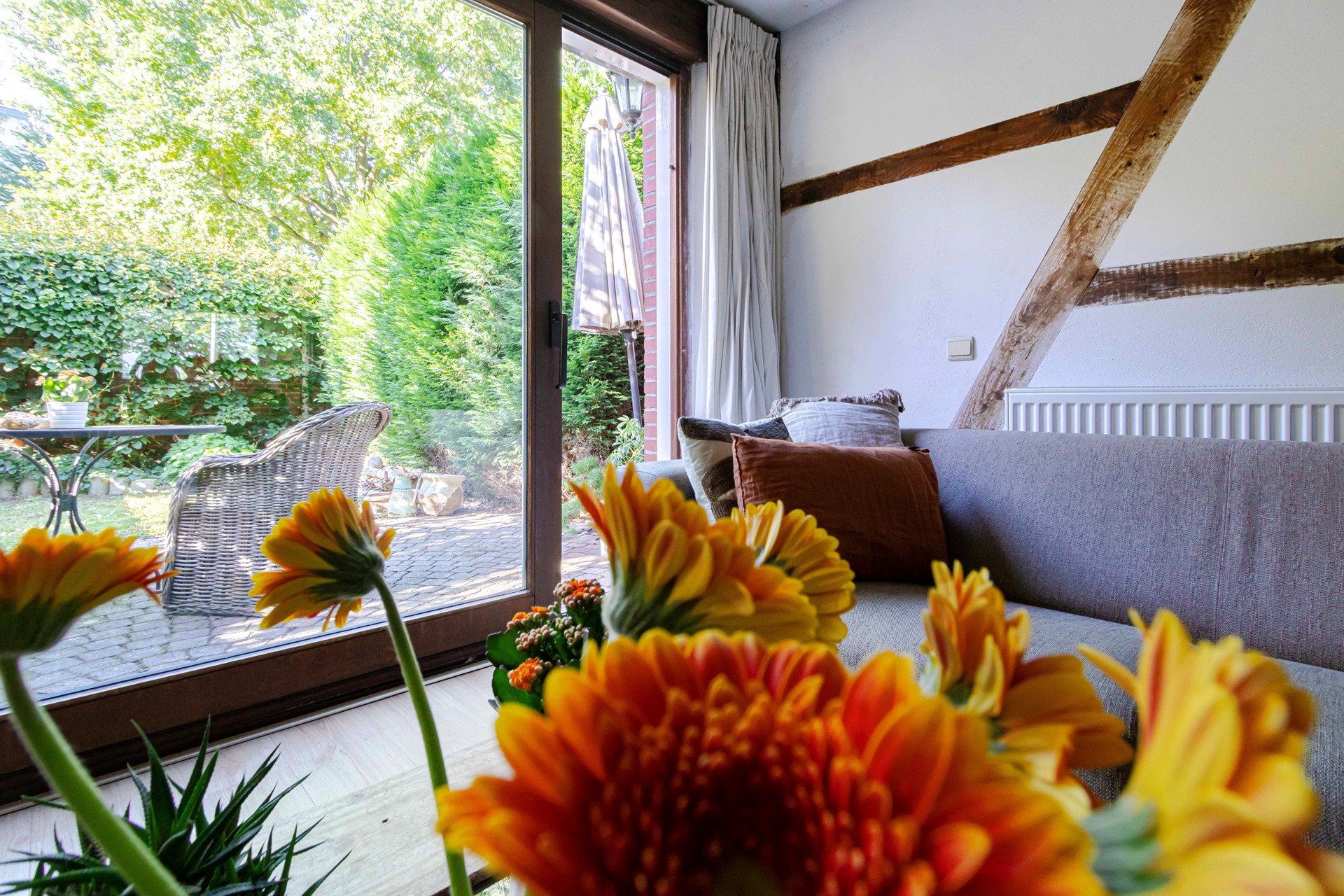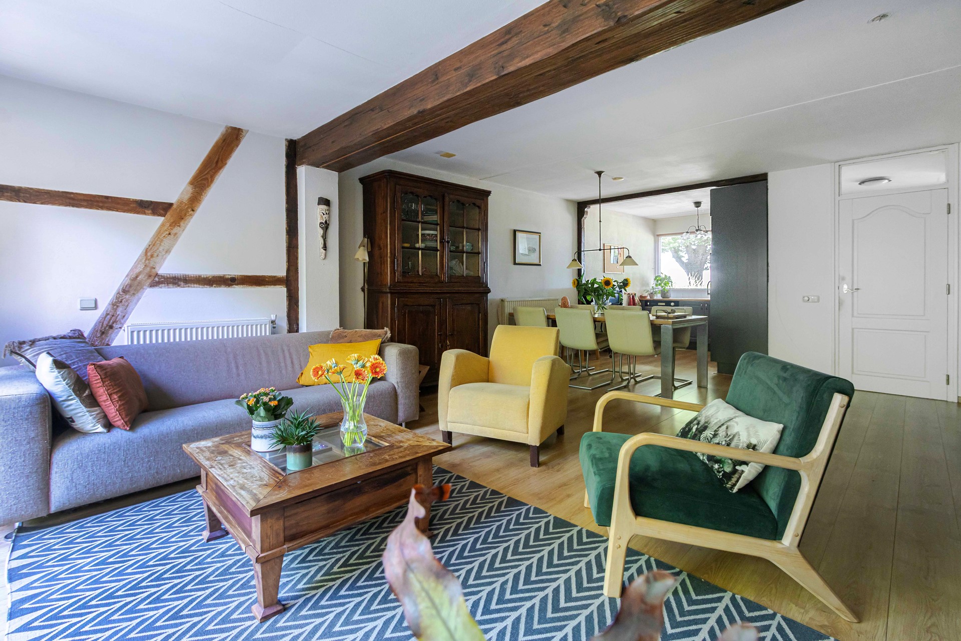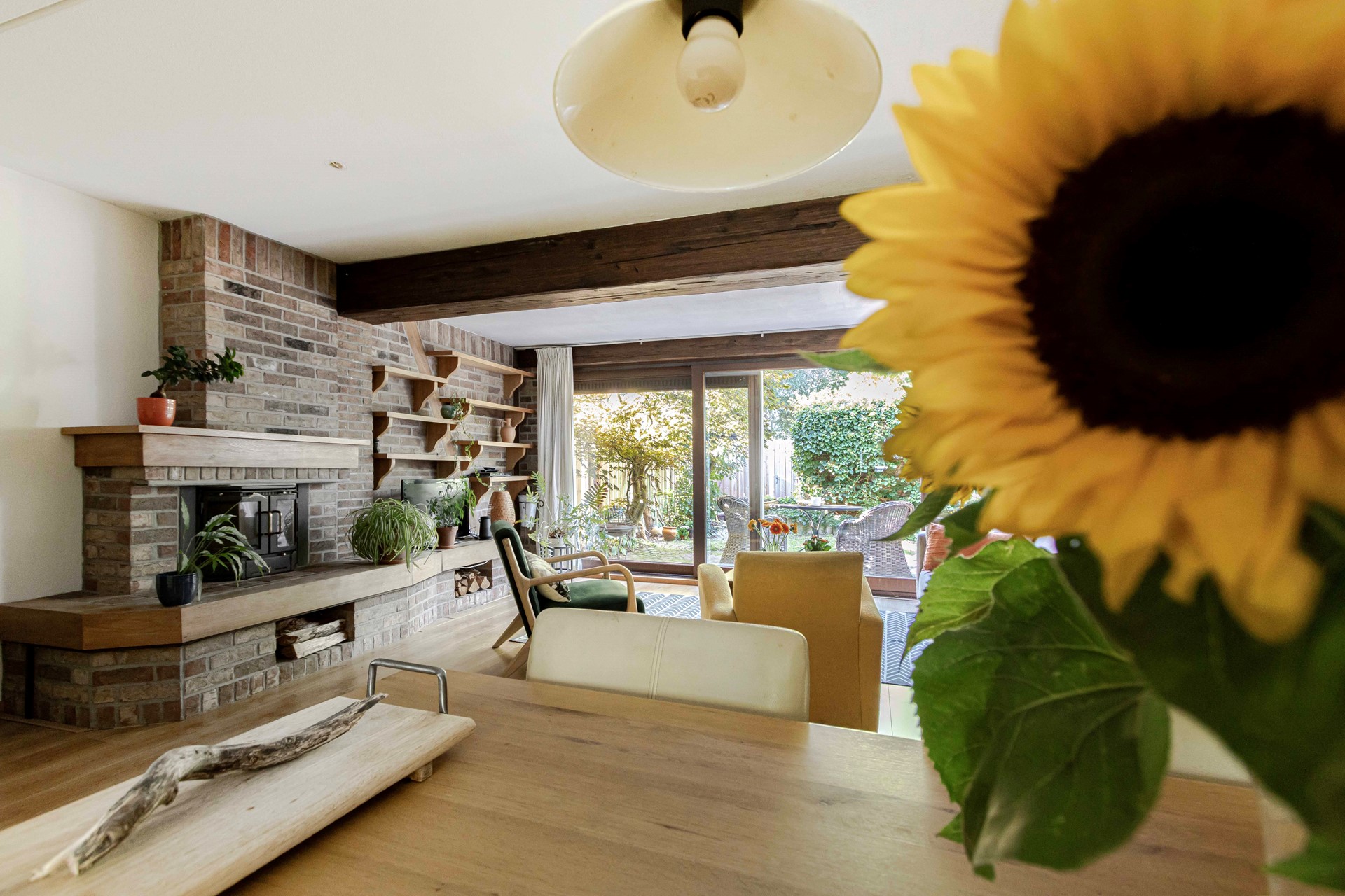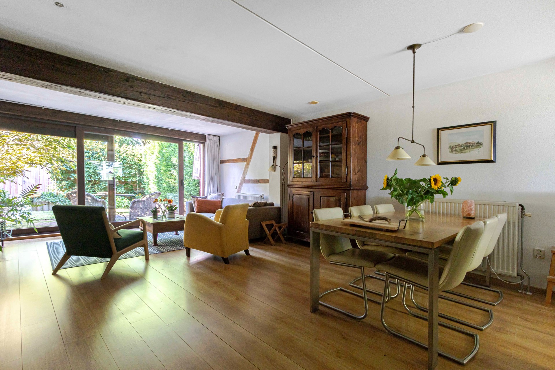 De woonkamer met aanbouw over de gehele breedte en met unieke details, geeft toegang tot de achtertuin gelegen op zuid-west, met een handige tuinberging en een achteringang.