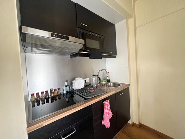 Om de hoek van de woonkamer zit een compacte keukenblok met alles wat je nodig hebt.