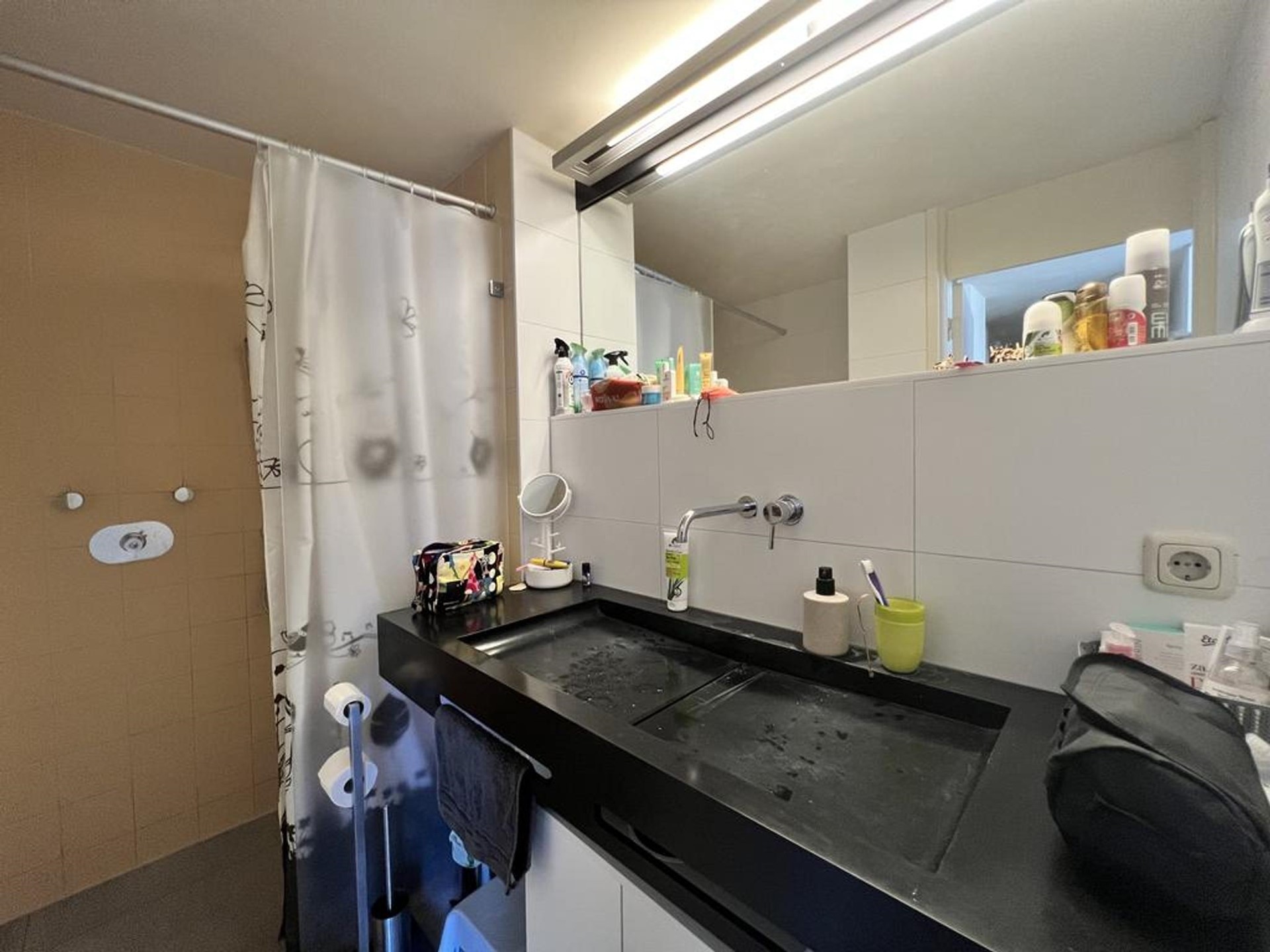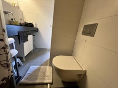 Fraaie badkamer met inloopdouche, hangend toilet en ruime hardstenen wastafel met grote spiegel.