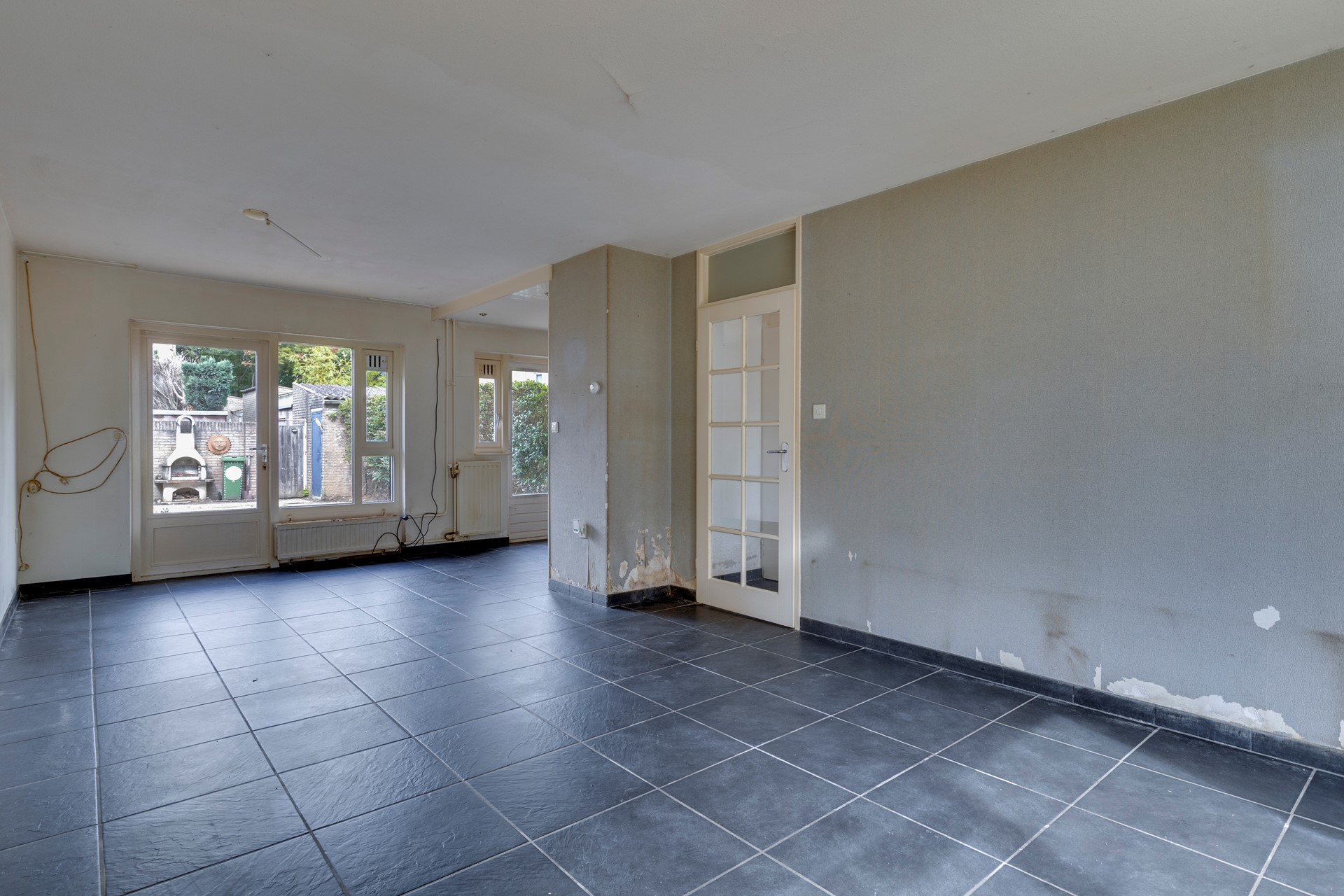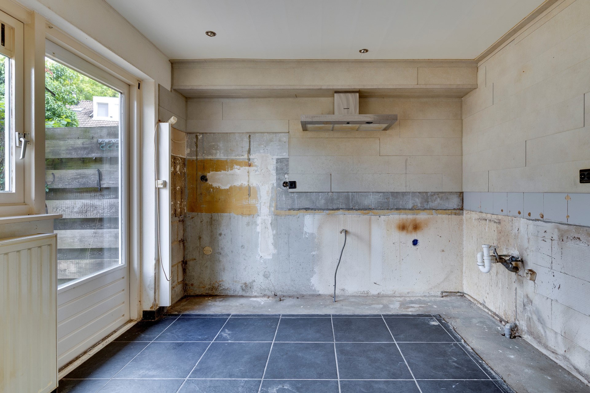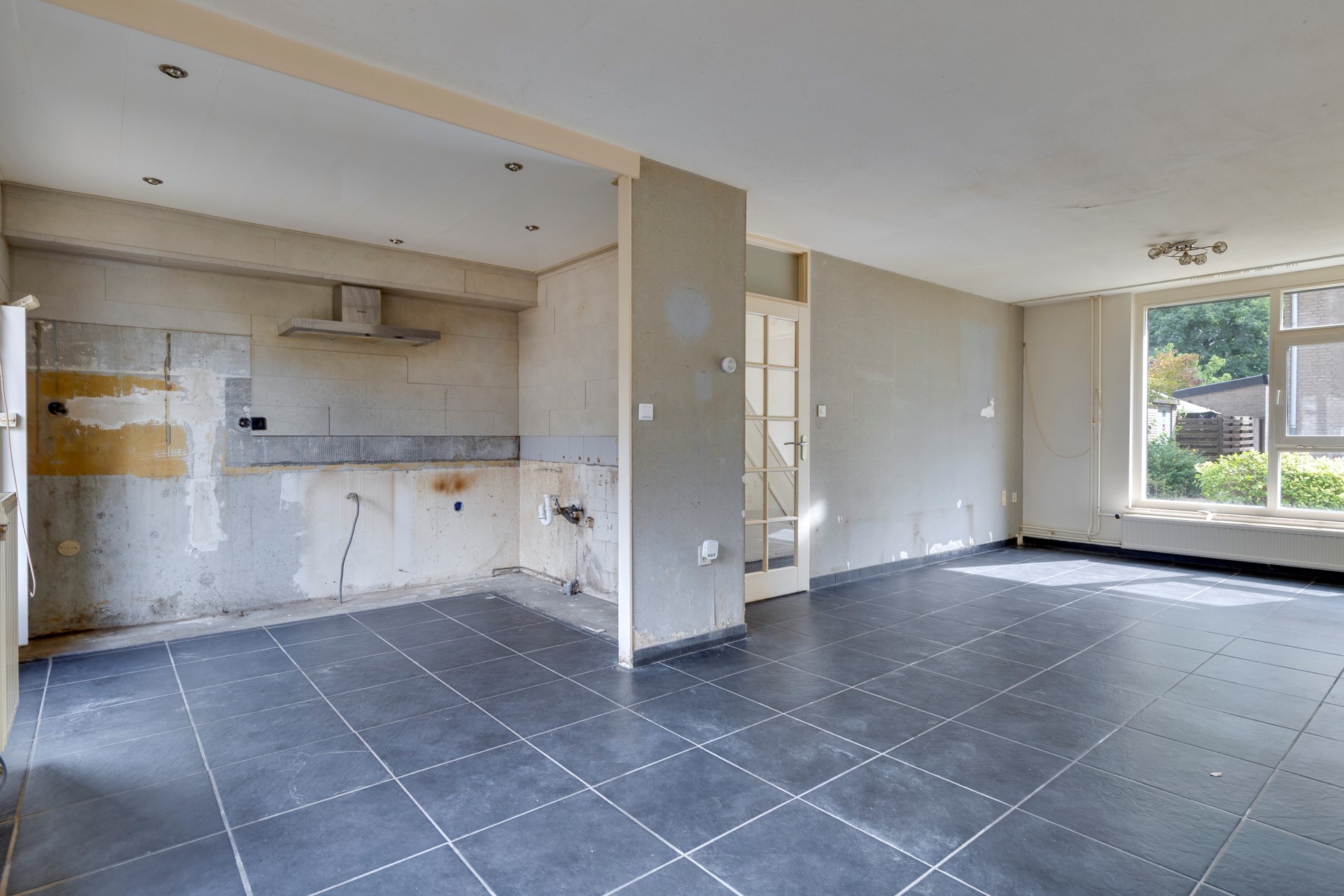 Vanaf de straatzijde kom je binnen via een kleine voortuin. De hal biedt toegang tot het toilet met hangtoilet, een praktische bergruimte onder de trap en de trapopgang naar de eerste verdieping. Vanuit de hal loop je de woonkamer ca. 27 m² in, die in open verbinding staat met de keukenruimte ca. 7,5 m² . De keuken is momenteel verwijderd, waardoor je hier alle vrijheid hebt om een moderne keukenopstelling te realiseren. Zowel vanuit de woonkamer als vanuit de keuken heb je toegang tot de achtertuin.