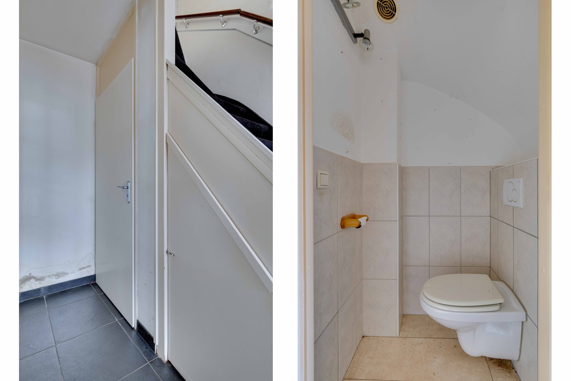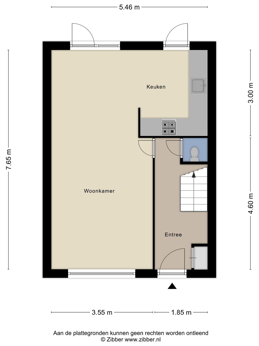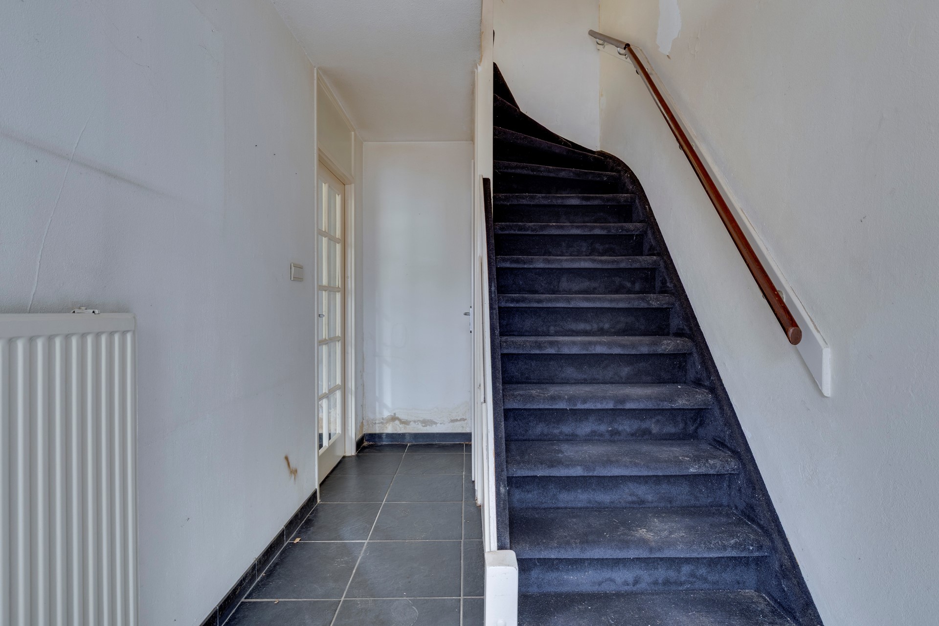 Vanaf de straatzijde kom je binnen via een kleine voortuin. De hal biedt toegang tot het toilet met hangtoilet, een praktische bergruimte onder de trap en de trapopgang naar de eerste verdieping. Vanuit de hal loop je de woonkamer ca. 27 m² in, die in open verbinding staat met de keukenruimte ca. 7,5 m² . De keuken is momenteel verwijderd, waardoor je hier alle vrijheid hebt om een moderne keukenopstelling te realiseren. Zowel vanuit de woonkamer als vanuit de keuken heb je toegang tot de achtertuin.