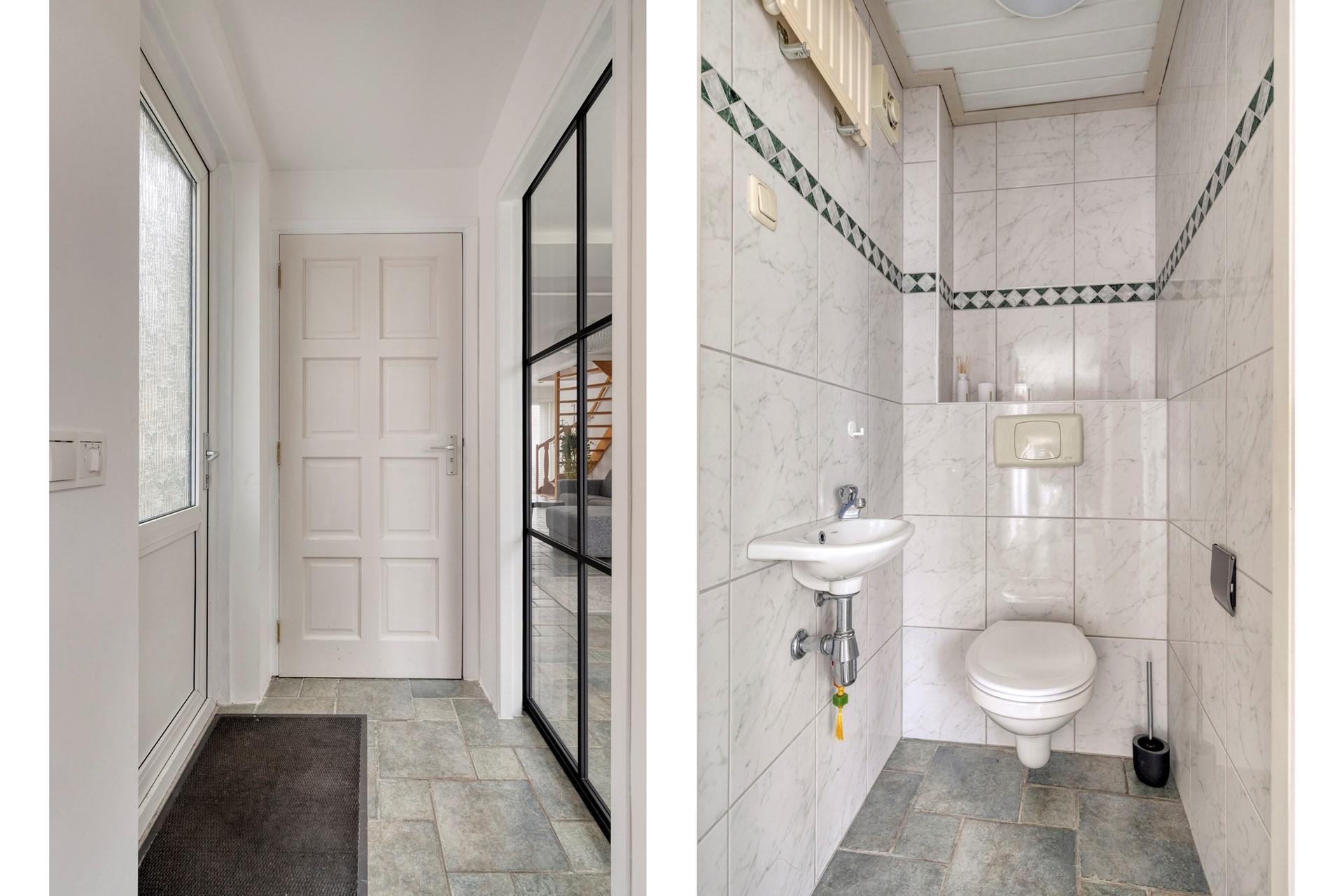 Via de zij-ingang betreed je de woning en kom je in de hal / entree. Vanuit hier zijn de toilet, keuken, woonkamer, bijkeuken, badkamer, en slaapkamer / werkkamer te bereiken.