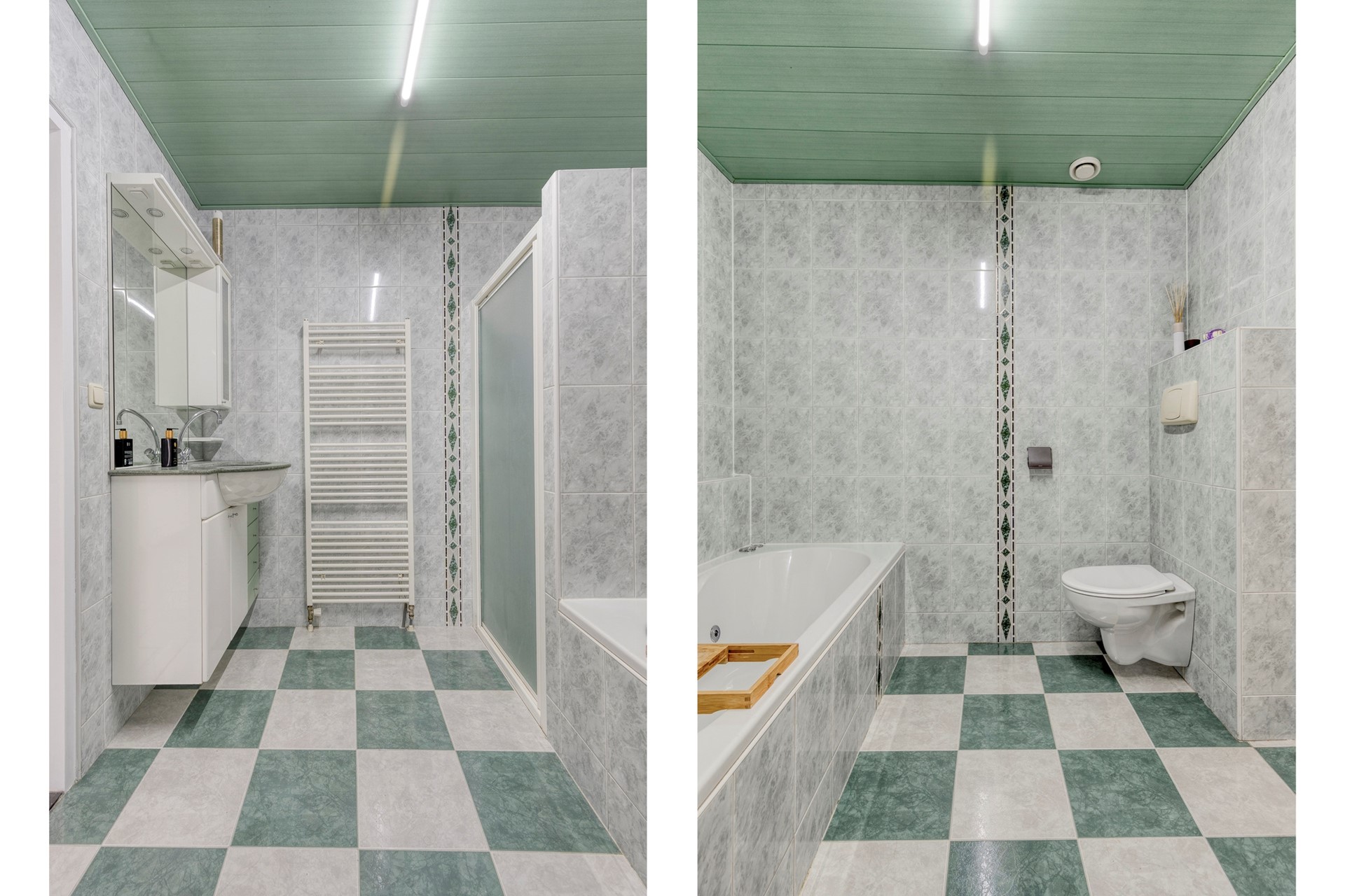 De complete badkamer is voorzien van toilet, ligbad, inloopdouche en wastafelmeubel.
