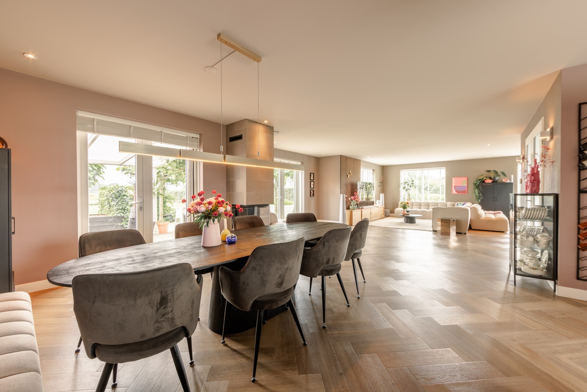 Via de fraai aangelegde voortuin, met twee parkeerplaatsen, bereik je de entree van de woning. De L-vormige woonkamer heeft een visgraatvloer, een houtkachel en vloerverwarming over de gehele begane grond. Er zijn maar liefst drie openslaande deuren naar de tuin. En die tuin mag er zijn! 50 meter diep en 23 meter breed. In totaal maar liefst 1.460 m² eigen grond. Met een prachtig ruim uitzicht. Verder is er een nieuwe veranda, een terras en een vrijstaande, geïsoleerde berging. Natuurlijk kun je ook achterom.