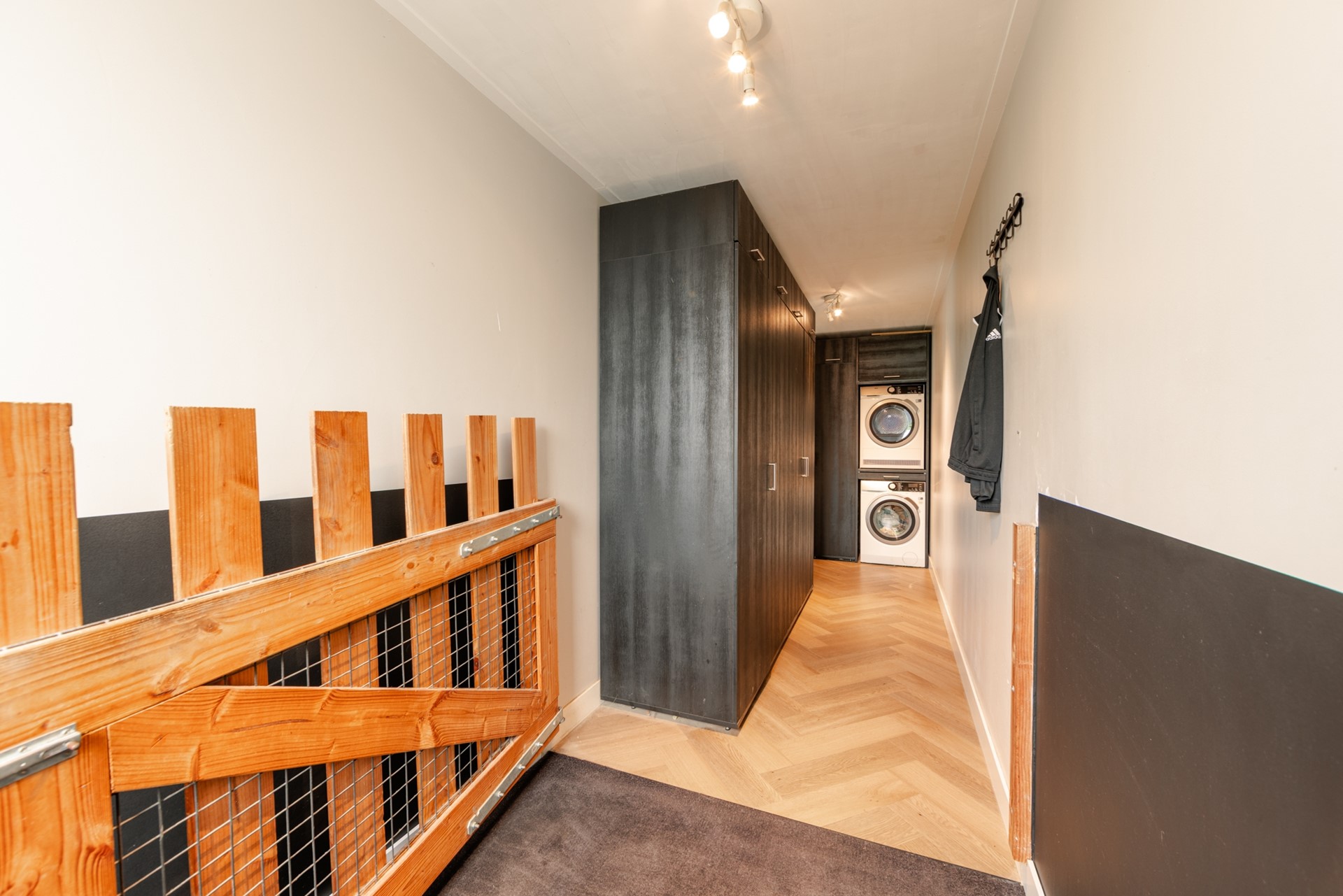 De moderne, luxe halfopen woonkeuken is voorzien van diverse inbouwapparatuur. Daarnaast is er een bijkeuken met een aansluiting voor de wasmachine.