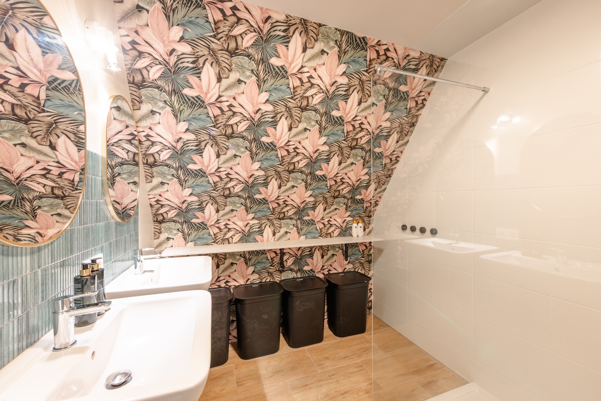 Op de eerste verdieping vind je een royale overloop met toegang tot de badkamer, voorzien van een inloopdouche, dubbele wastafel en vloerverwarming. Er zijn drie slaapkamers, waarvan één met een kleedkamer en een tweede badkamer met ligbad, inloopdouche, wastafelmeubel en ook vloerverwarming.