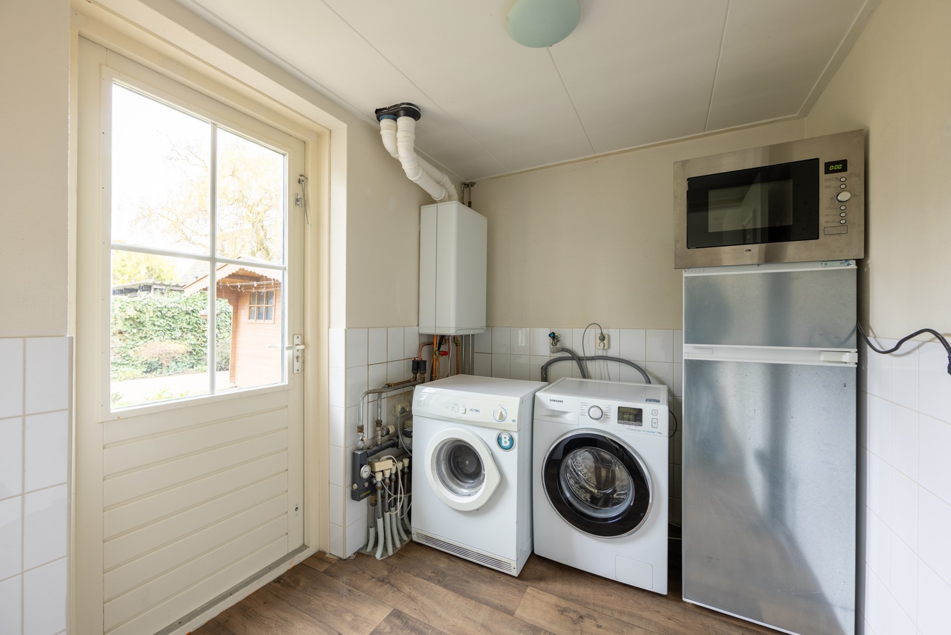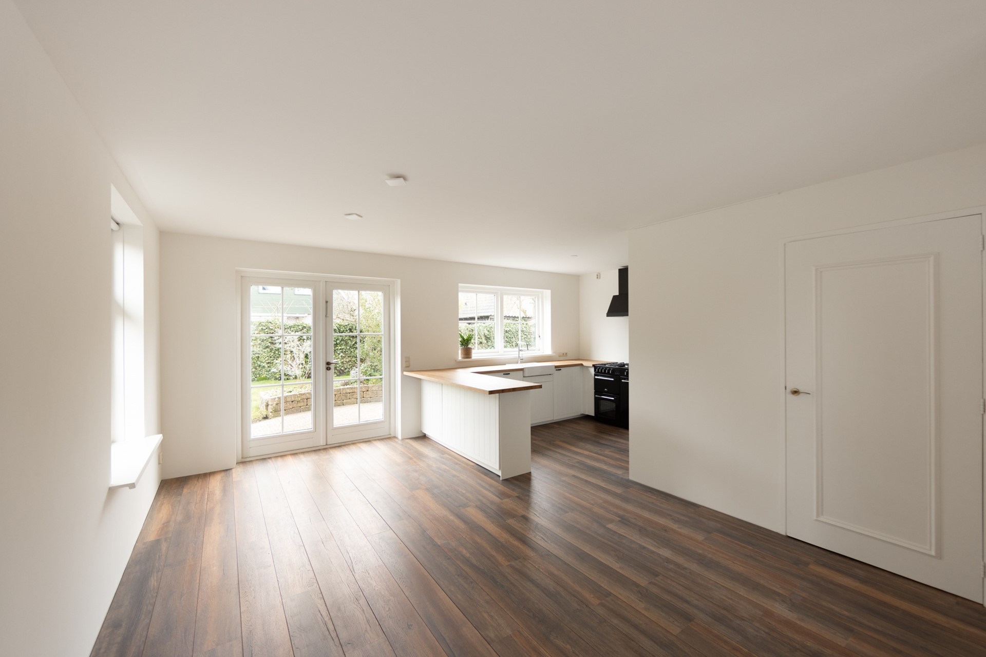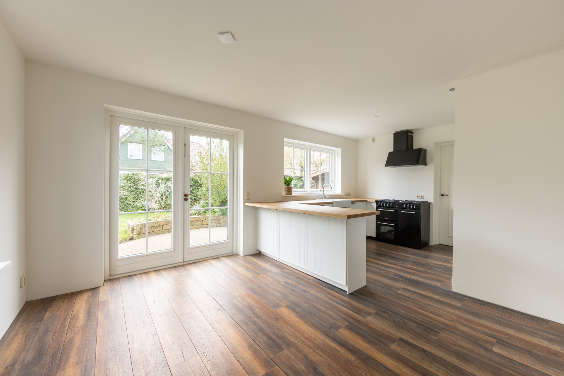 De L-vormige woonkamer heeft een mooie nieuwe laminaatvloer, geschikt voor de vloerverwarming die eronder zit. Er is een houtkachel en er zijn openslaande deuren naar de tuin. De gloednieuwe halfopen keuken heeft een vaatwasser en een farmhouse-fornuis. Er is een bijkeuken met de wasmachineaansluiting en ook een deur naar de tuin. De fraai aangelegde tuin met een vrijstaande houten schuur en een achterom is 10 meter diep en maar liefst 17 meter breed. Dus altijd wel een plekje in de zon.