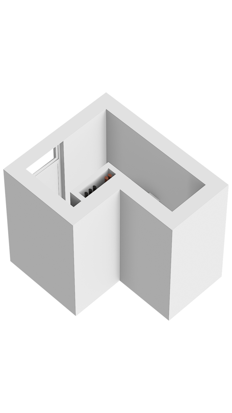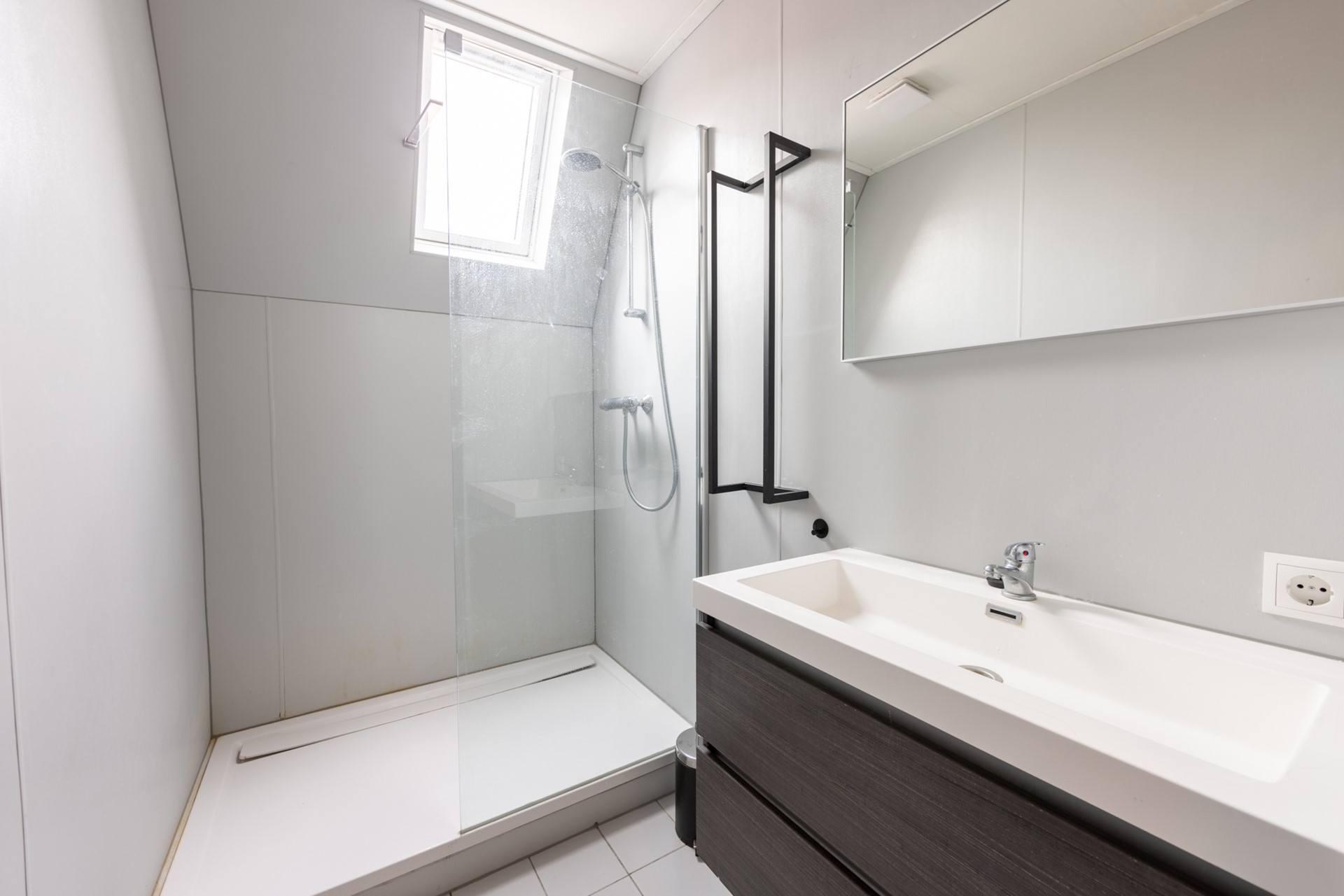 De moderne badkamer is voorzien van een ruime douche, een wastafelmeubel en een toilet. Naast de badkamer bevindt zich de slaapkamer.