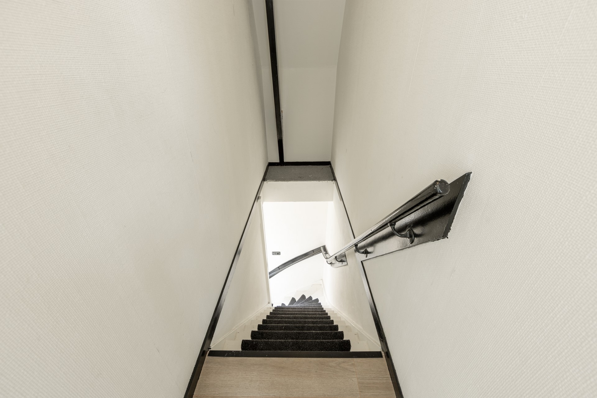 Op de begane grond heb je een eigen berging. Via een eigen opgang kom je in de gang, met een deur naar het zonnige dakterras op het oosten. Dit terras wordt binnenkort zelfs nog groter dan het nu is. Via dezelfde gang kom je ook bij de inpandige berging, met de cv-ruimte en de aansluiting voor de wasmachine.