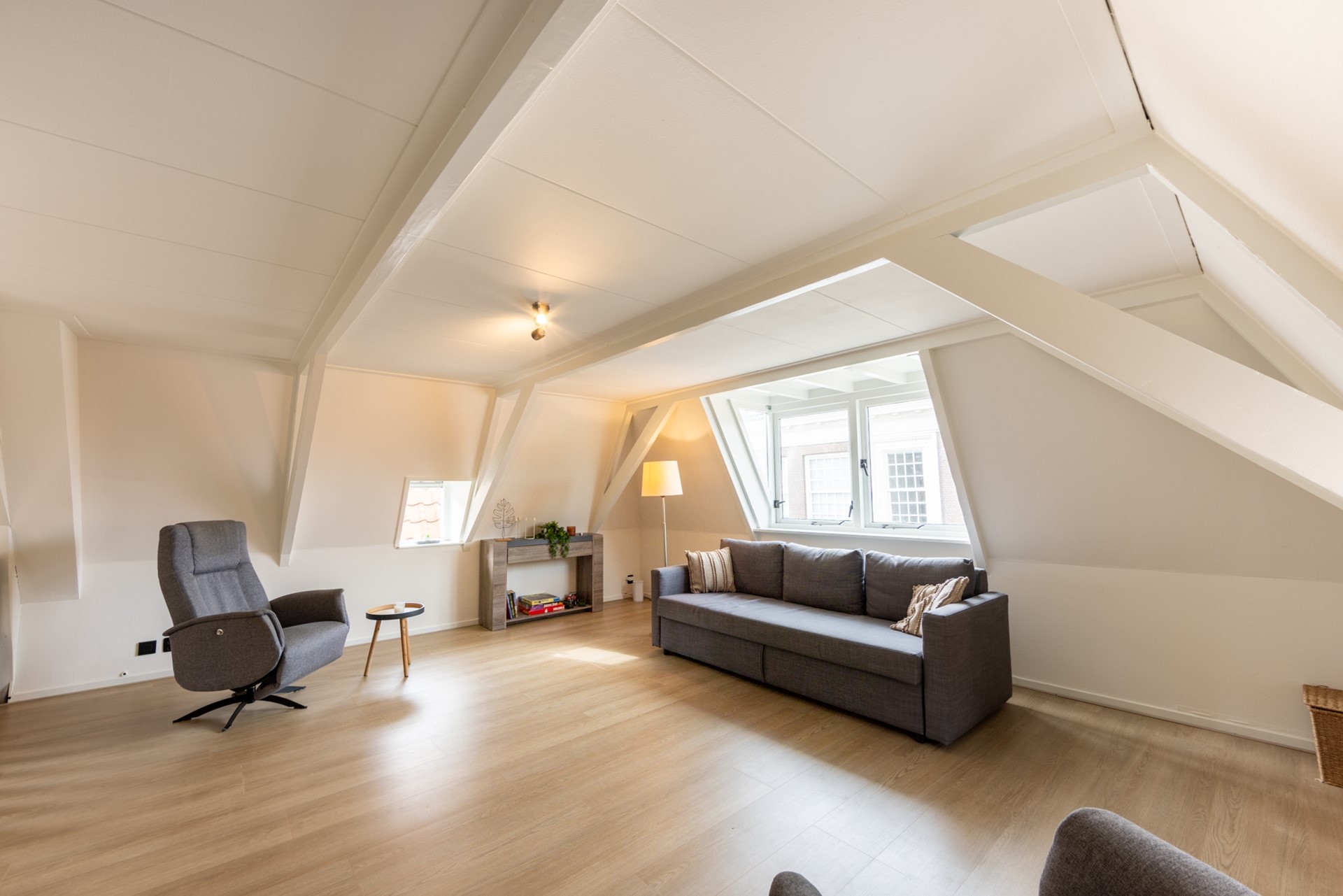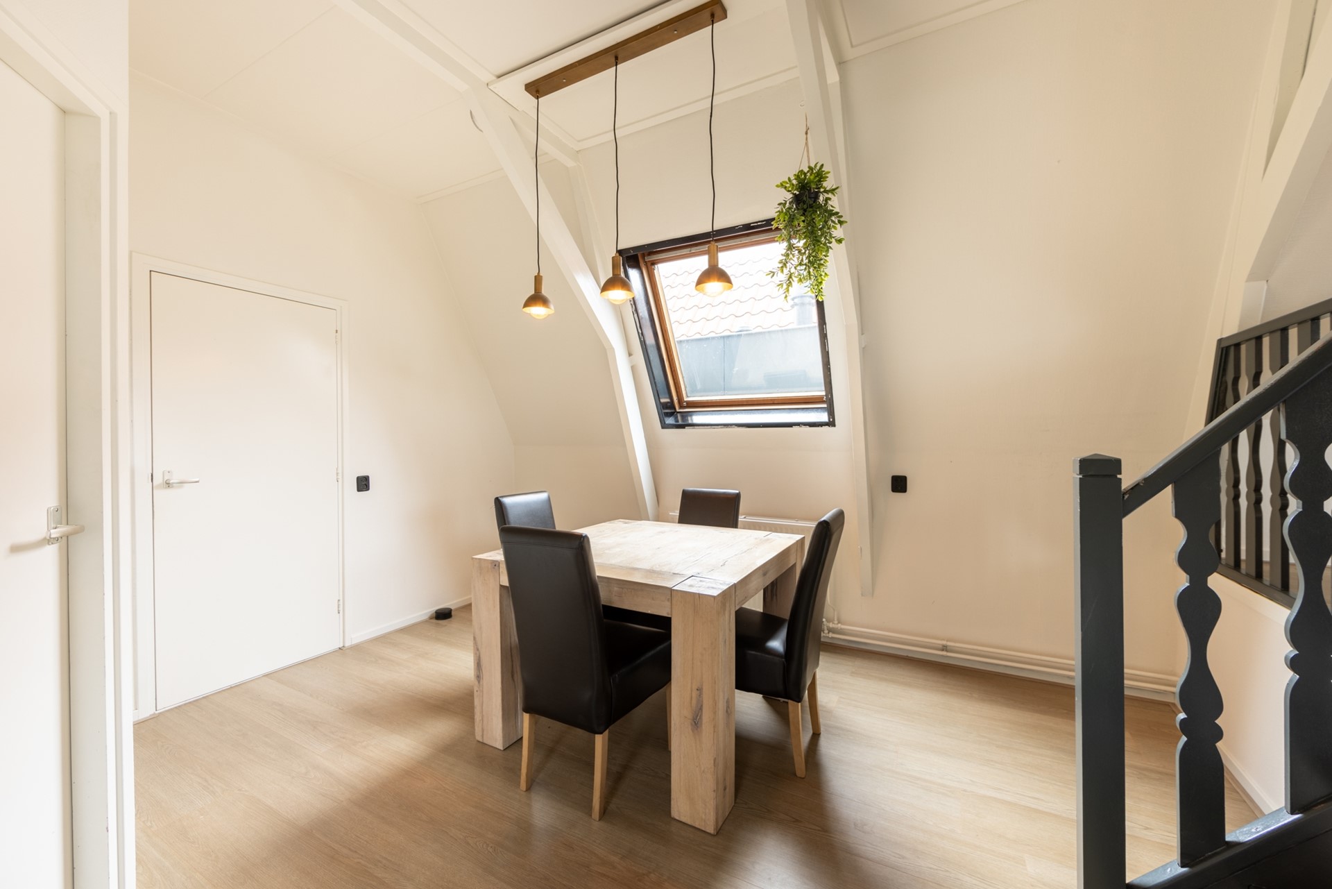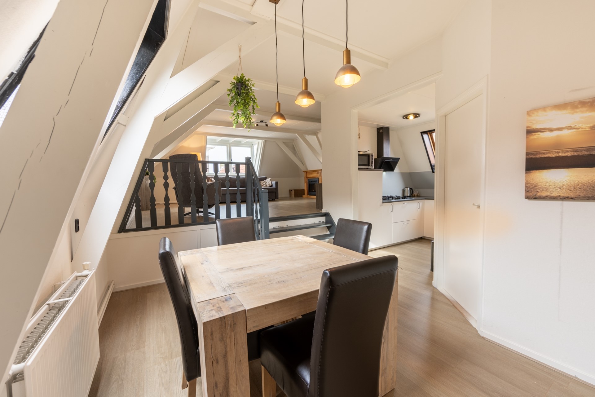 De ruime en gezellige woonkamer heeft een grote dakkapel en een eetgedeelte met een moderne, halfopen keuken met inbouwapparatuur.
