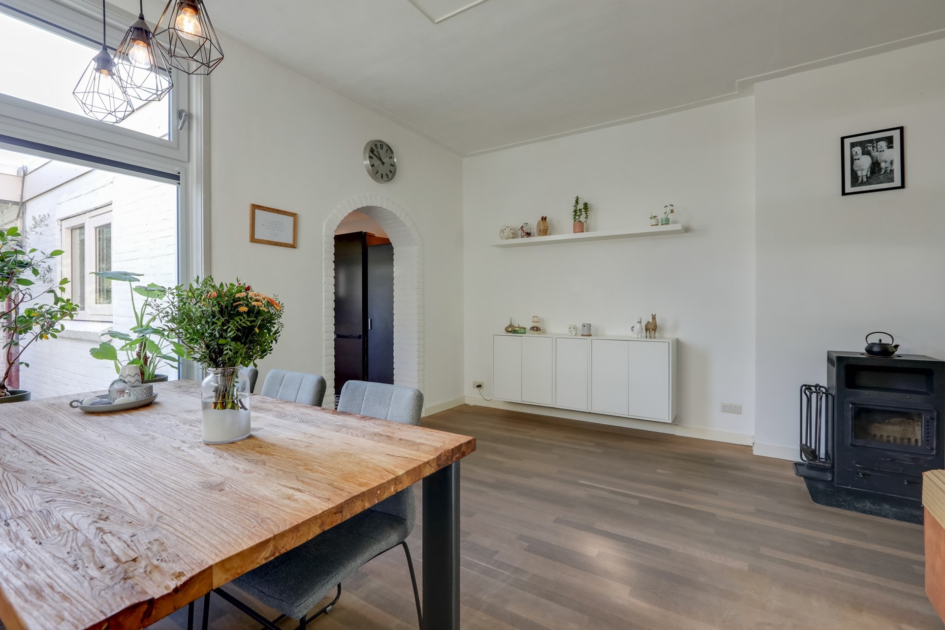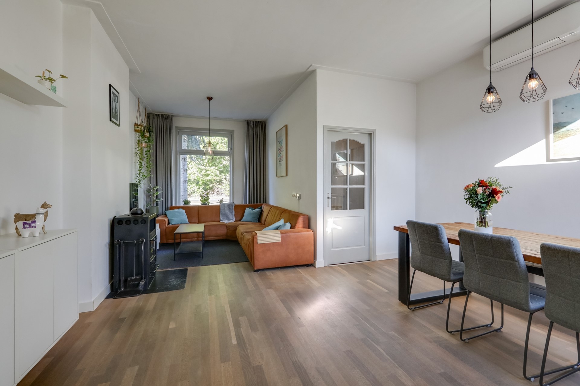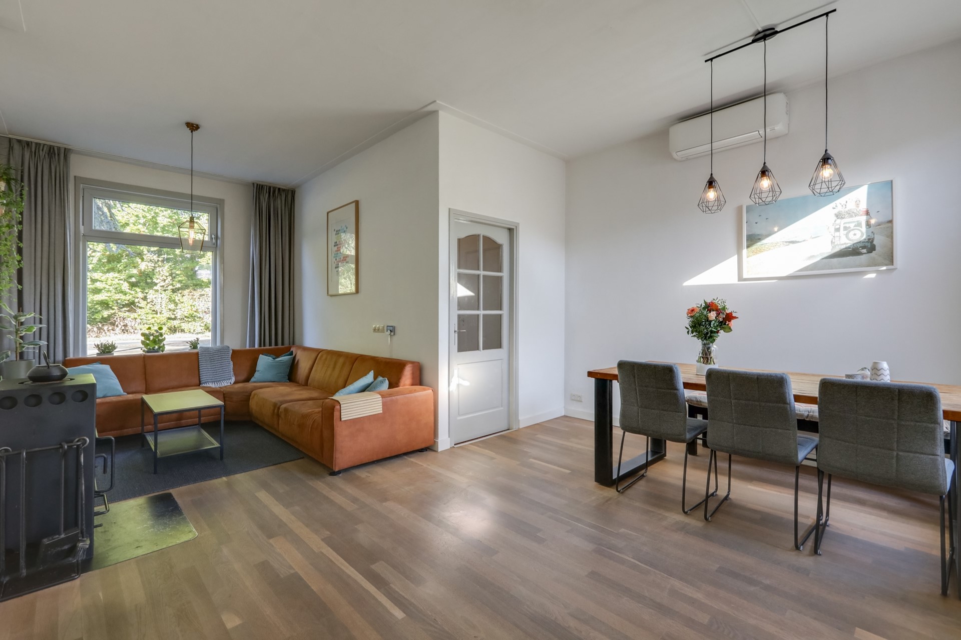Sfeervol betegelde entreehal voorzien van een granito vloer. Vanuit hier heb je de trap naar de eerste verdieping en toegang tot de kelder en de woonkamer. De lichte L-vormige woonkamer beschikt over een parketvloer, hoge plafonds en grote ramen (voorzien van kunststof kozijnen met triple glas) die zorgen voor veel natuurlijk lichtinval. Een gezellige houtkachel maakt de sfeer compleet en biedt extra warmte tijdens koude dagen. Airconditioning zorgt voor een aangename temperatuur door het hele jaar heen.