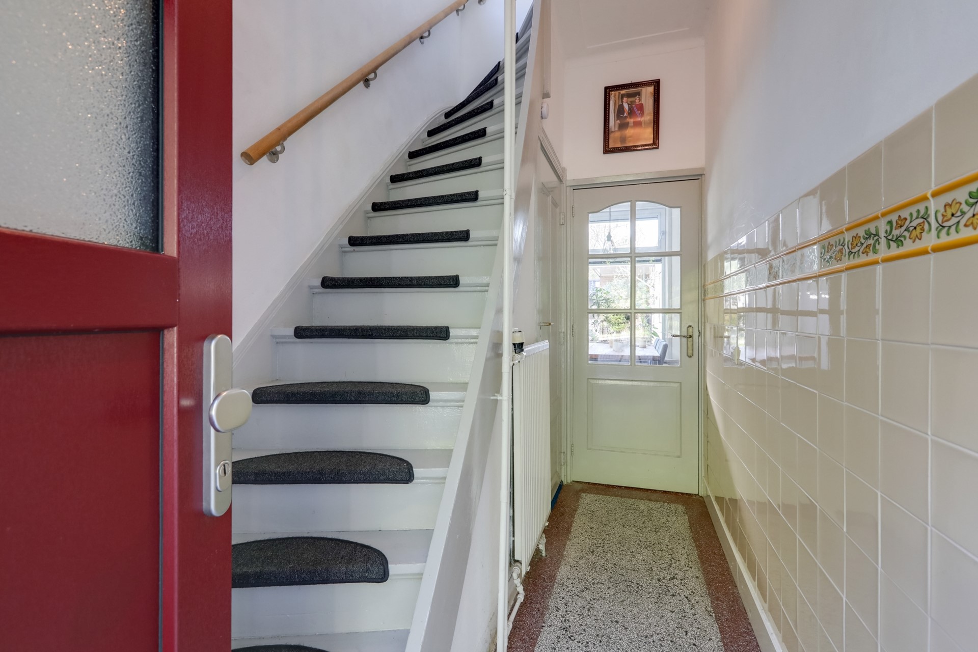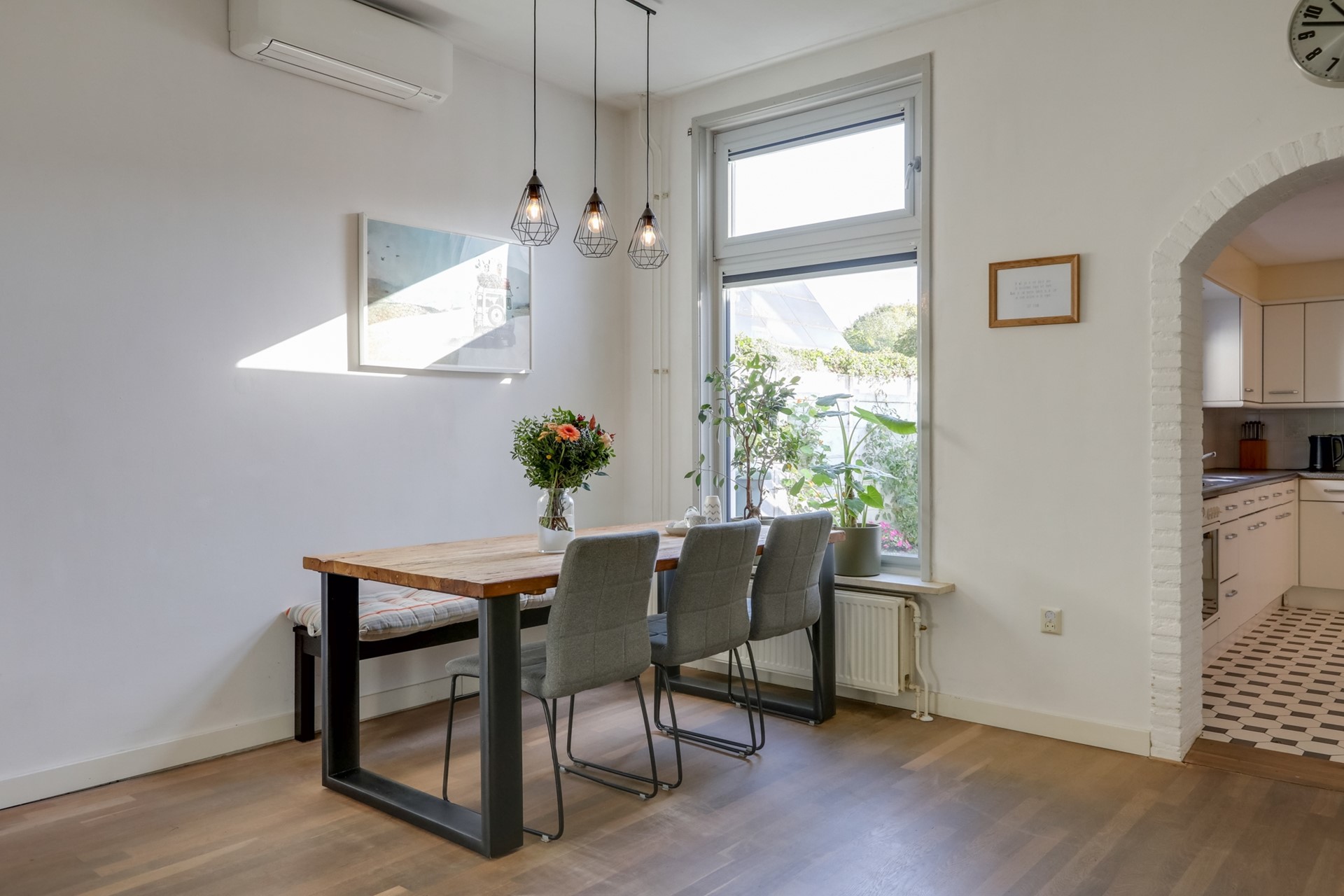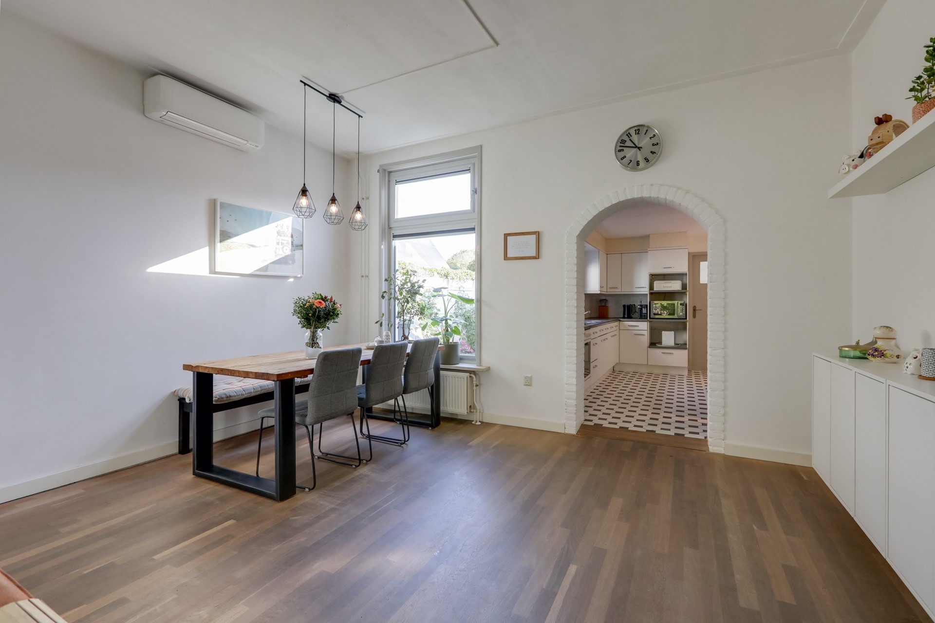 Sfeervol betegelde entreehal voorzien van een granito vloer. Vanuit hier heb je de trap naar de eerste verdieping en toegang tot de kelder en de woonkamer. De lichte L-vormige woonkamer beschikt over een parketvloer, hoge plafonds en grote ramen (voorzien van kunststof kozijnen met triple glas) die zorgen voor veel natuurlijk lichtinval. Een gezellige houtkachel maakt de sfeer compleet en biedt extra warmte tijdens koude dagen. Airconditioning zorgt voor een aangename temperatuur door het hele jaar heen.