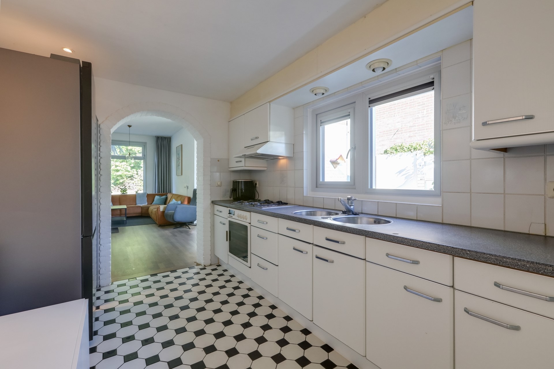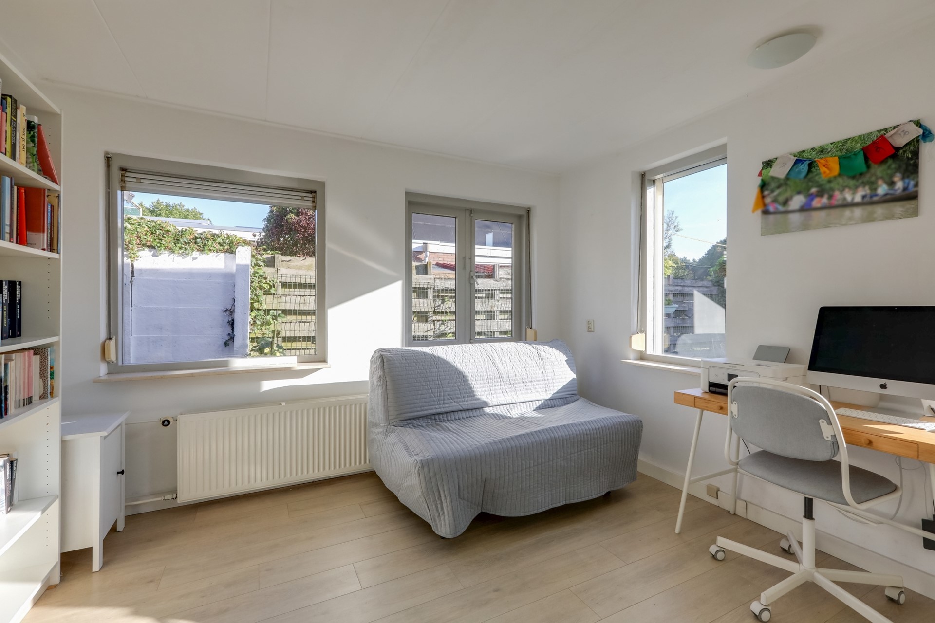 De keuken is functioneel uitgerust en biedt directe doorgang naar de bijkeuken. Hierin vind je een toilet en witgoedaansluitingen. Aan de bijkeuken grenst een royale werkkamer die ook kan dienen als slaapkamer of speelkamer voor de kinderen. Deze ruimte is voorzien van bergruimte, houten kozijnen met dubbel glas en rolluiken.