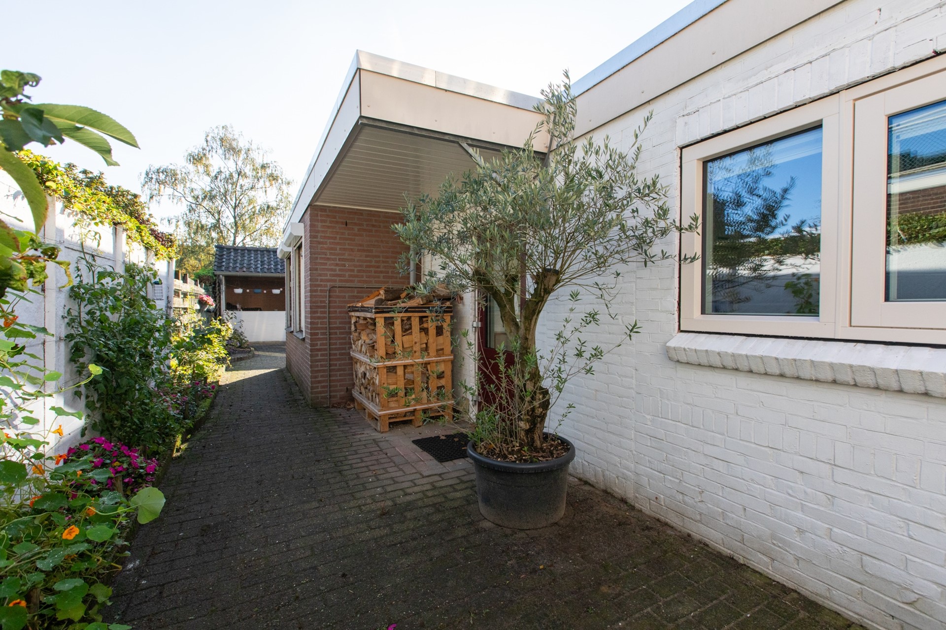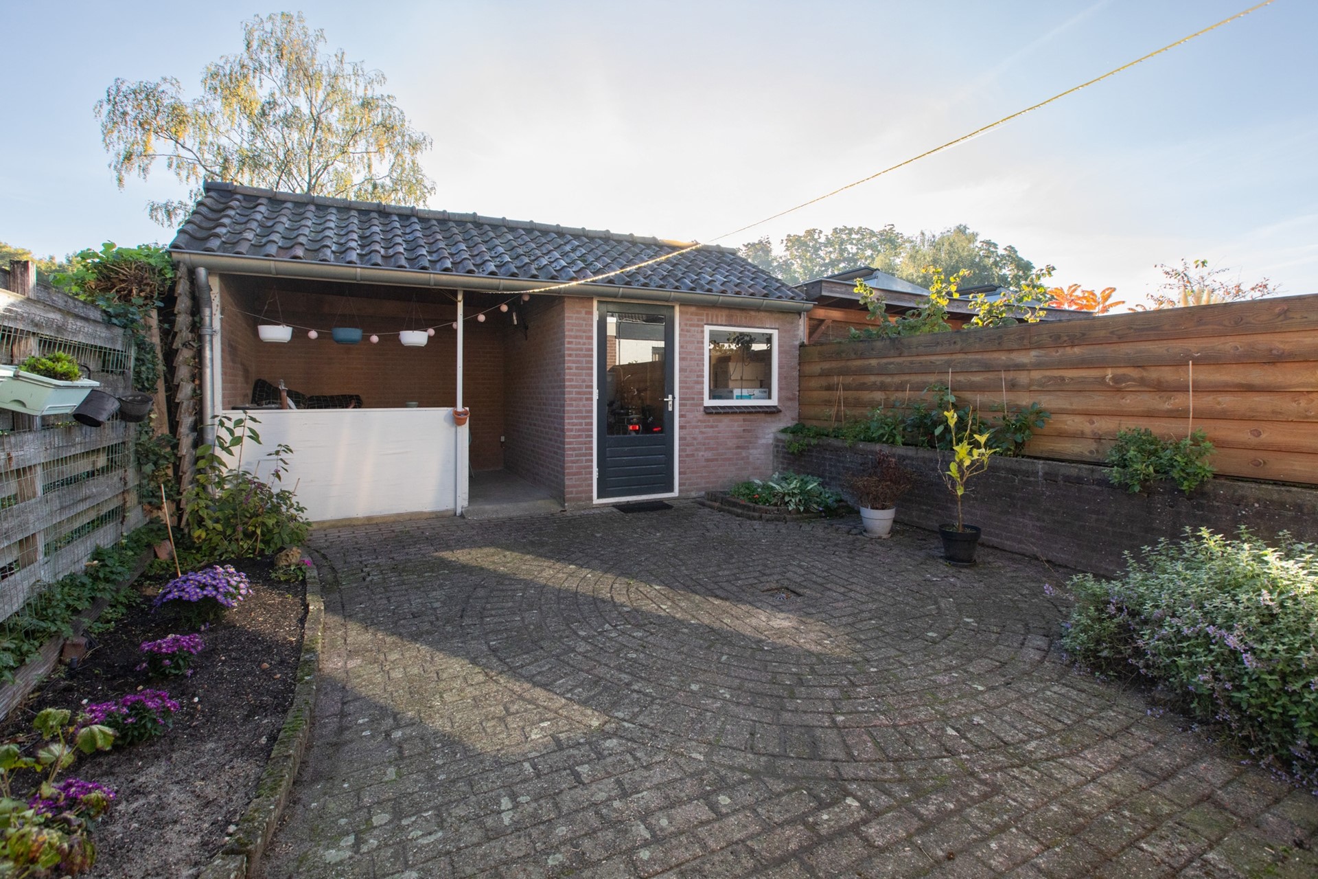 Aan de voorkant van de woning is er voldoende ruimte om twee auto’s te parkeren.. Via een poort aan de zijkant van het huis bereik je de achtertuin, die heerlijk beschut is. Hier vind je een berging met een gezellige overkapping. De borders met diverse groene beplanting zorgen voor een prettige uitstraling.