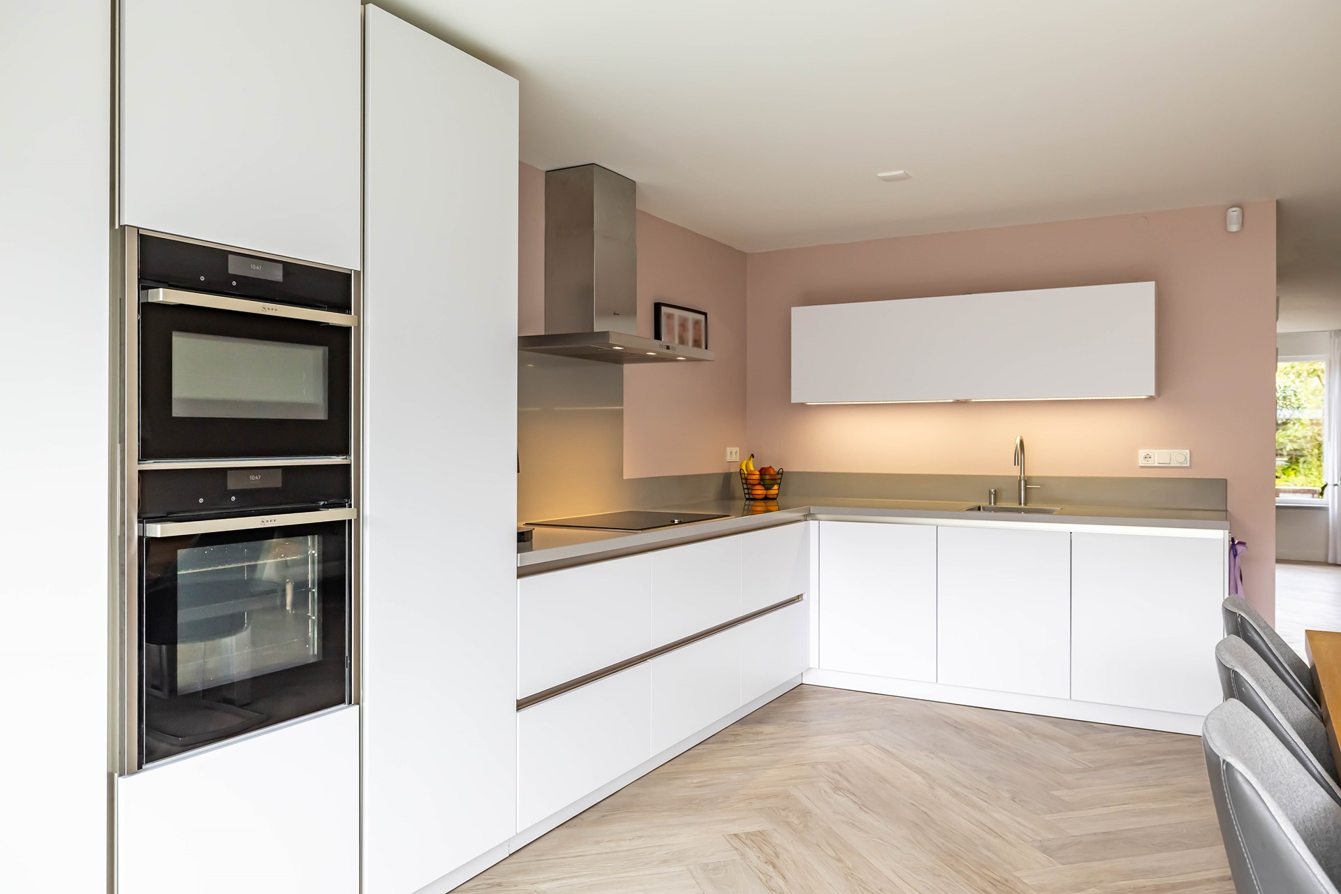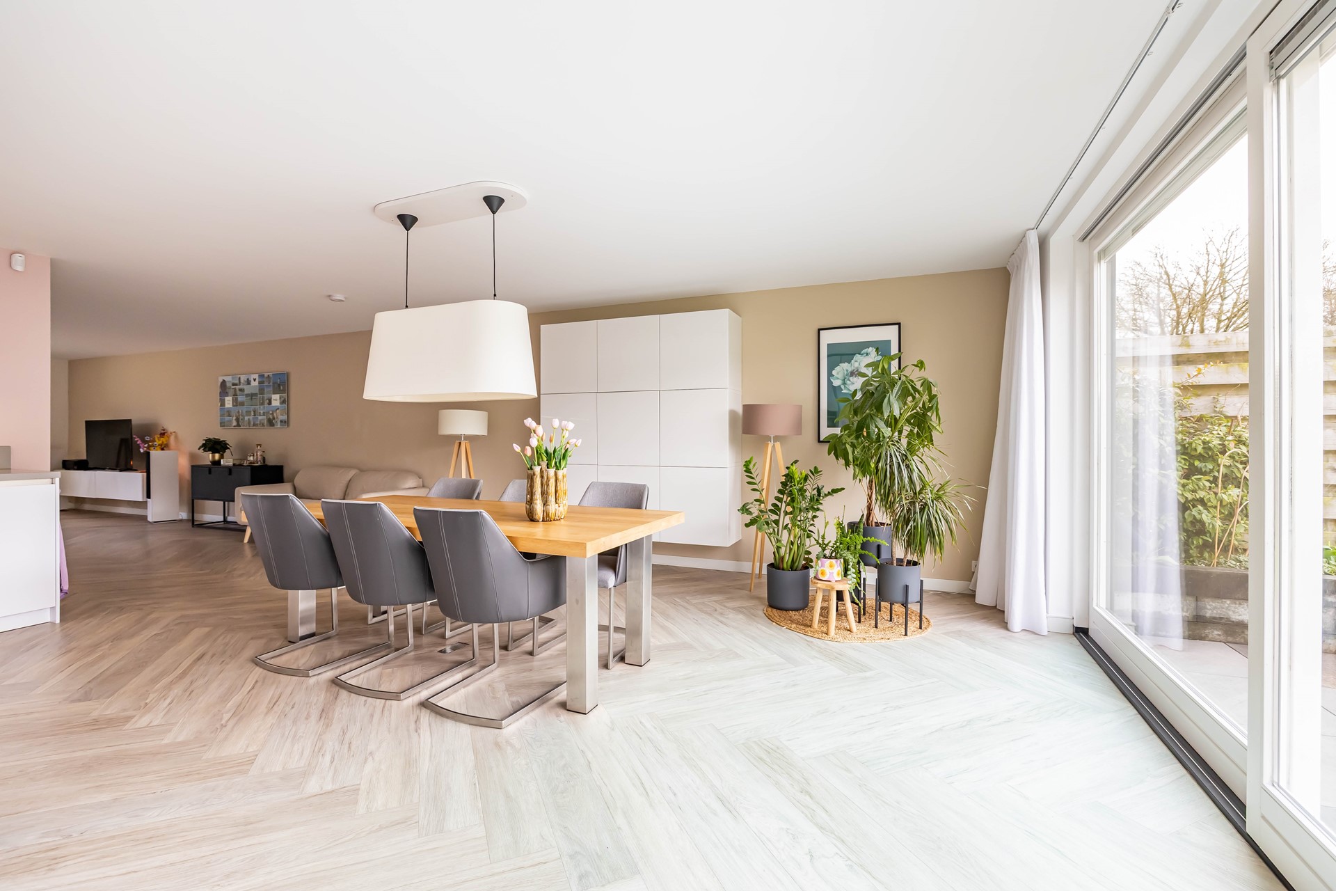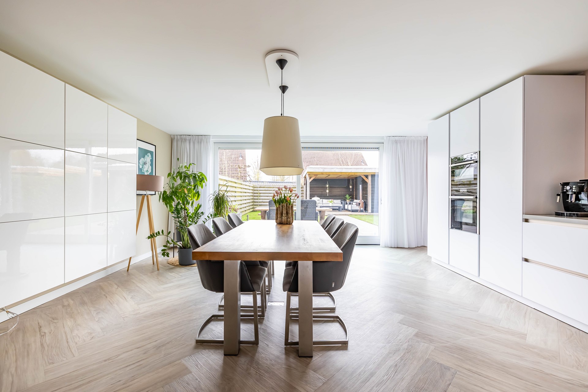 Stel je voor: samen koken aan een luxueus keukenblok, borrelen aan de keukentafel en ondertussen uitkijken over de zonnige tuin. In deze ruime woonkeuken voelt elke maaltijd als een feestje, hoe eenvoudig het gerecht soms ook is. De keuken is voorzien van een Quooker en alle benodigde NEFF-inbouwapparatuur, waaronder: een stoomoven, combi-oven/magnetron, 5-pits inductiekookplaat, vaatwasser en hoge koelkast en separate hoge vriezer.