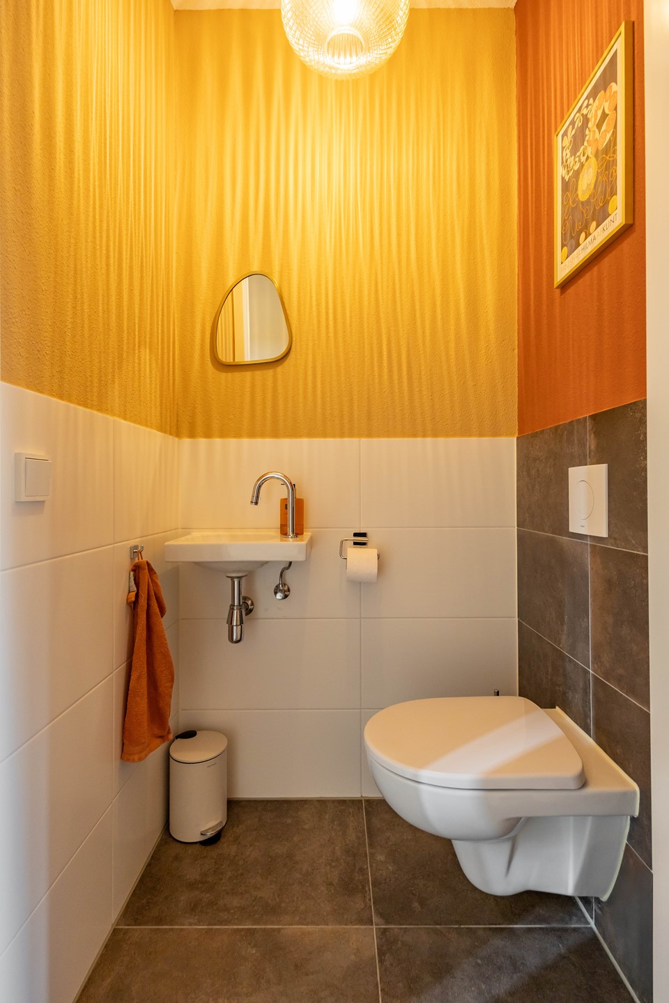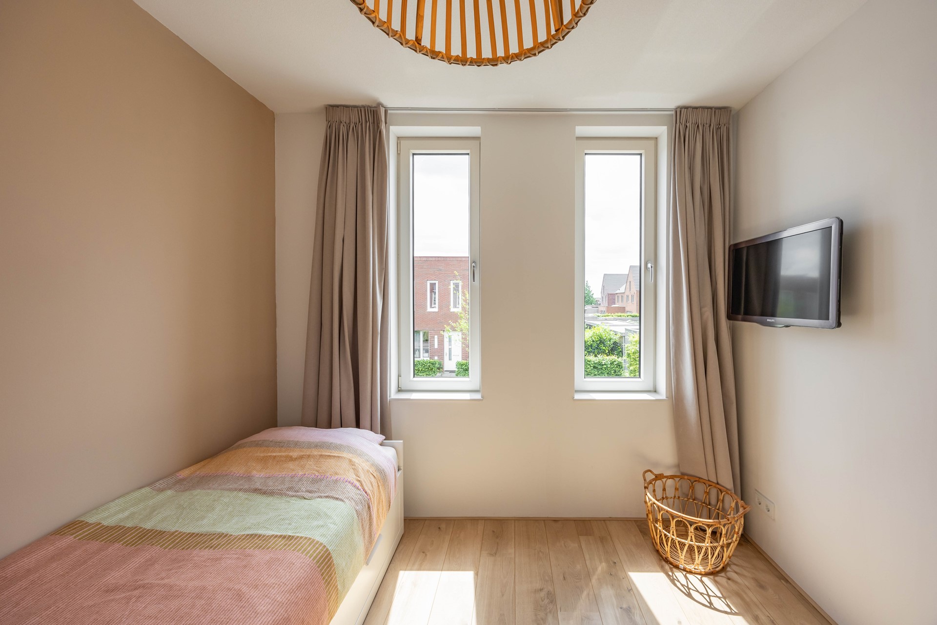 Op de verdieping zijn drie slaapkamers en de ruime badkamer. Deze is voorzien van een inloopdouche, tweepersoons wastafelmeubel en een tweede toilet. Op deze verdieping vind je verder de technische ruimte waar ook de aansluiting voor de wasmachine en de droger zich bevinden.