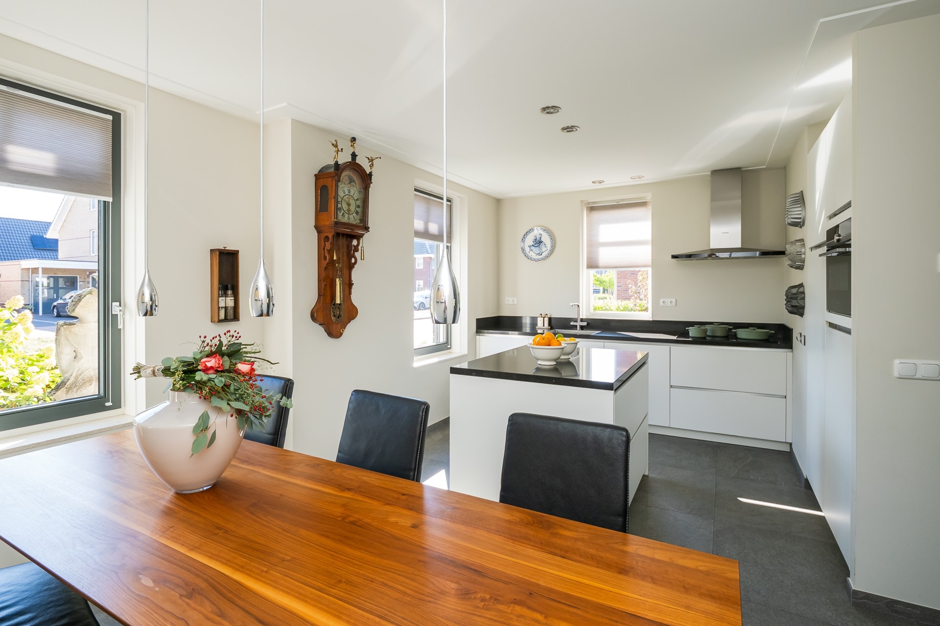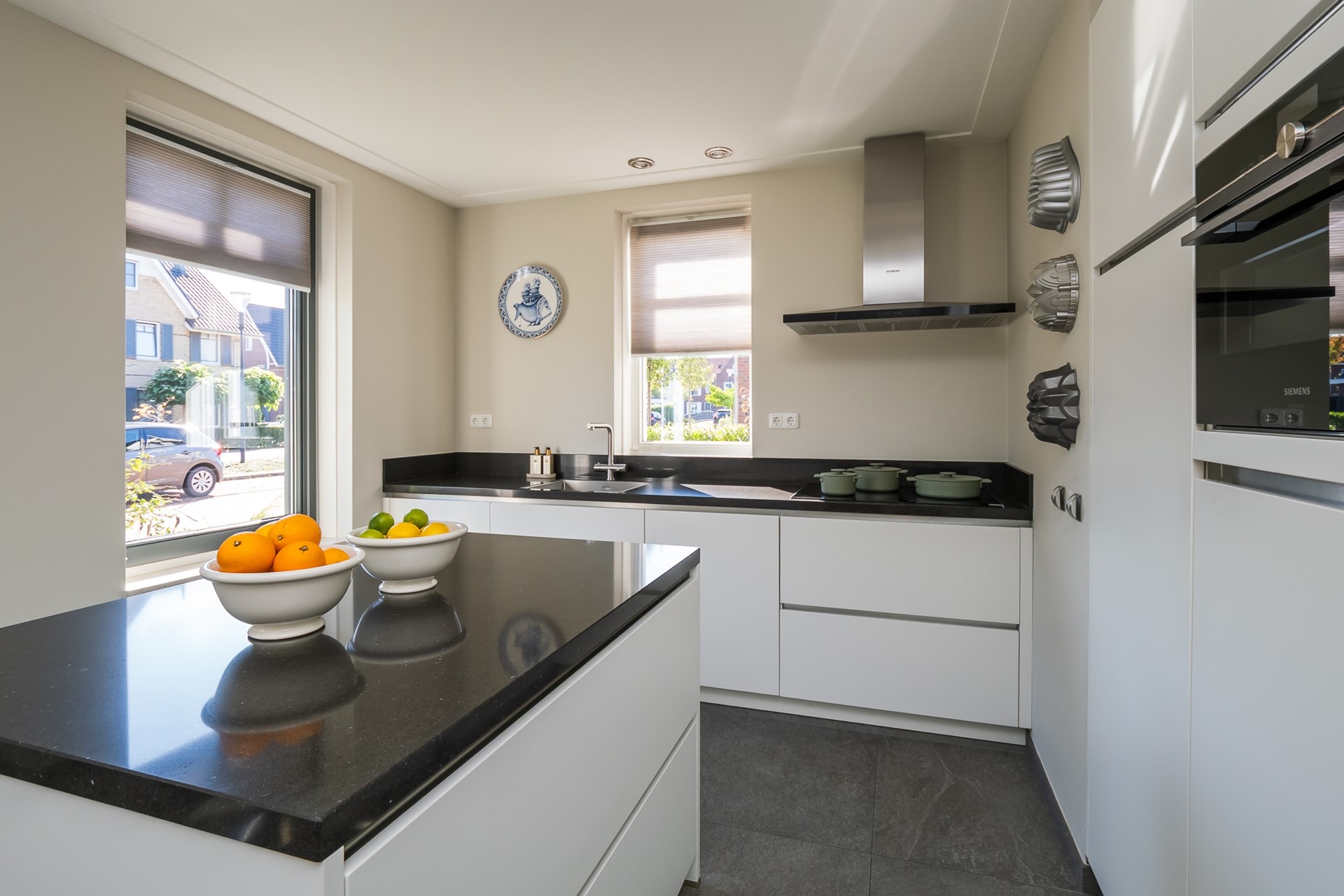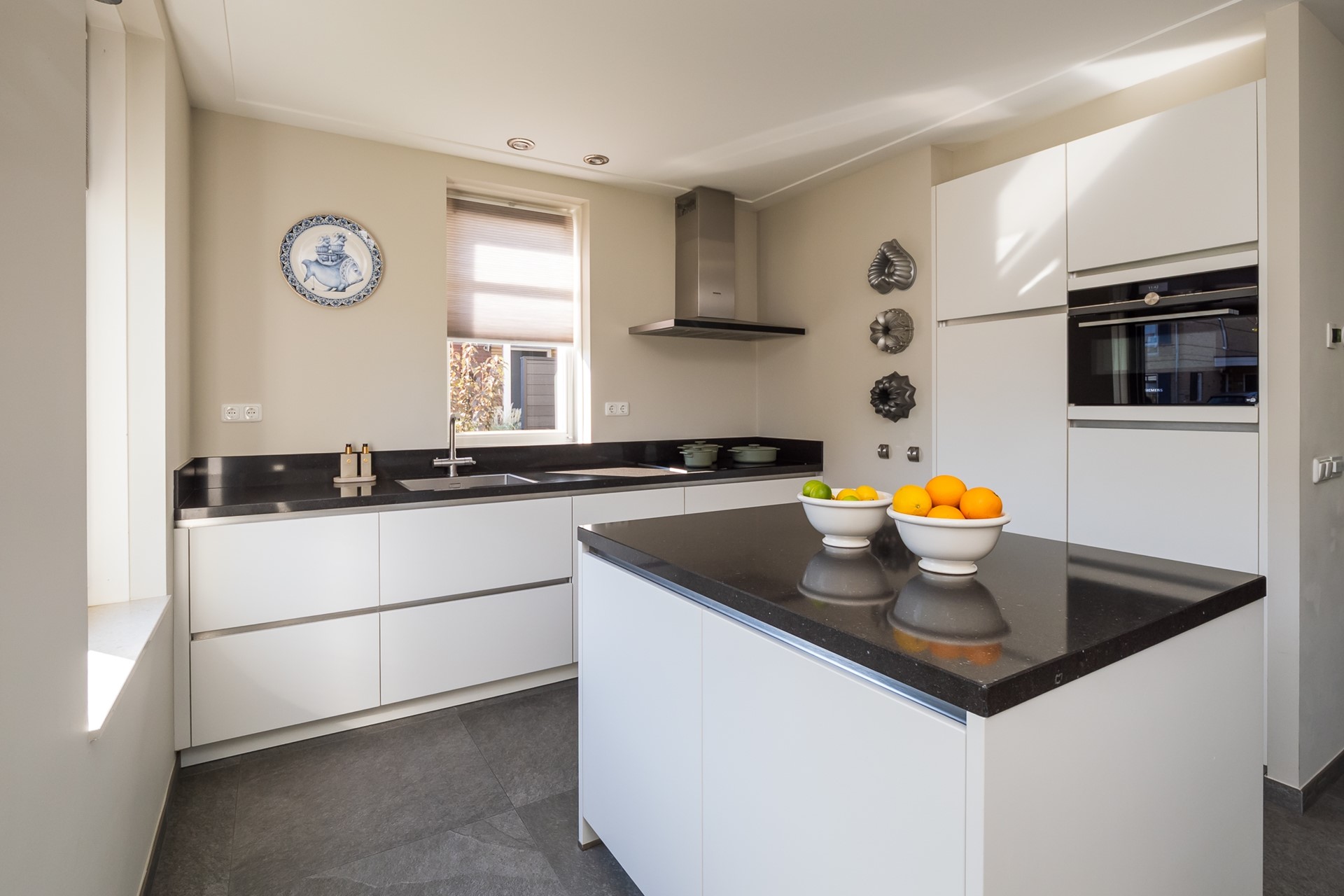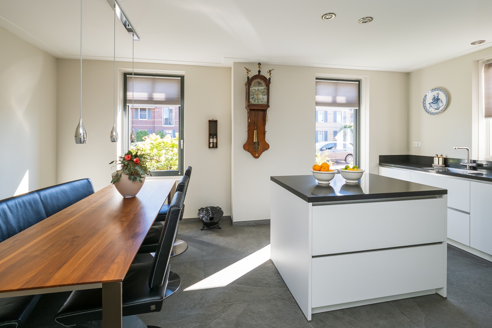Aan de voorzijde ligt de woonkeuken; een plek waar koken, eten en genieten vloeiend samengaan. De kwalitatieve keukenopstelling bestaat uit een wandopstelling met kastenwand en een vrijstaand eiland. De mat witte kastenfronten in combinatie met de composiet werkbladen en de "Siemens Studioline" apparatuur vormt een hoogwaardig geheel. De apparatuur bestaat uit een inductiekookplaat, afzuigschouw, combi-oven, vaatwasmachine, koelkast, vrieskast en een “Franke” kokend waterkraan. Dankzij het royale vloeroppervlak is er bovendien volop ruimte om een royale eethoek te plaatsen voor een gezellige maaltijd met het gezin of diners met vrienden.