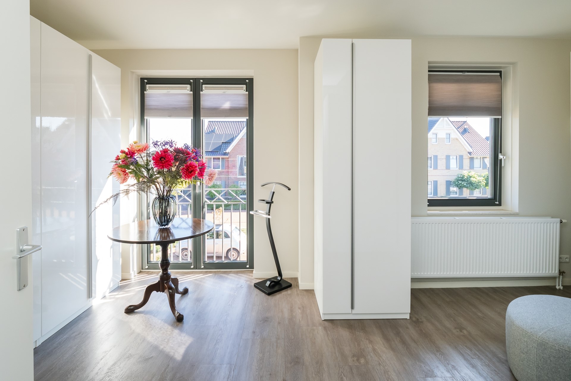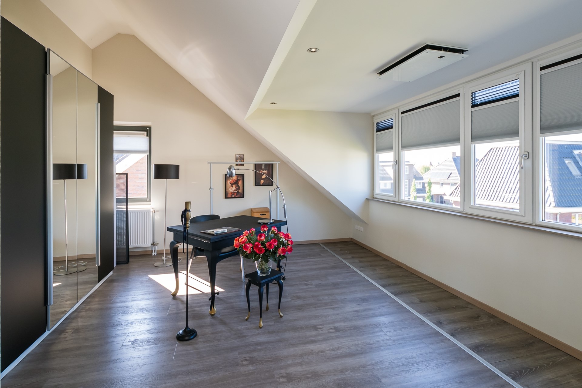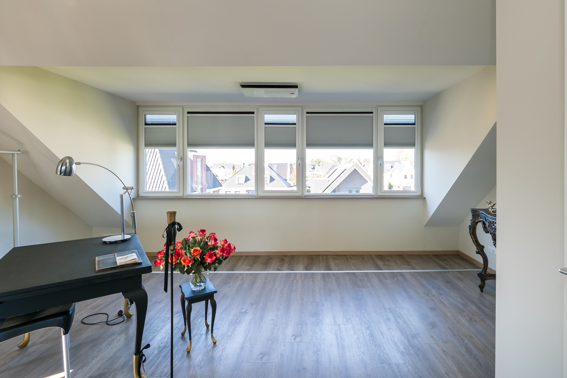 De ramen in de voor- en zijgevel zorgen voor een heldere lichtinval en bieden een prachtig uitzicht op de ruim opgezette woonomgeving met groenzone en woningen uit het hogere segment. De elektrische screens zorgen hierbij voor zoncomfort en privacy.