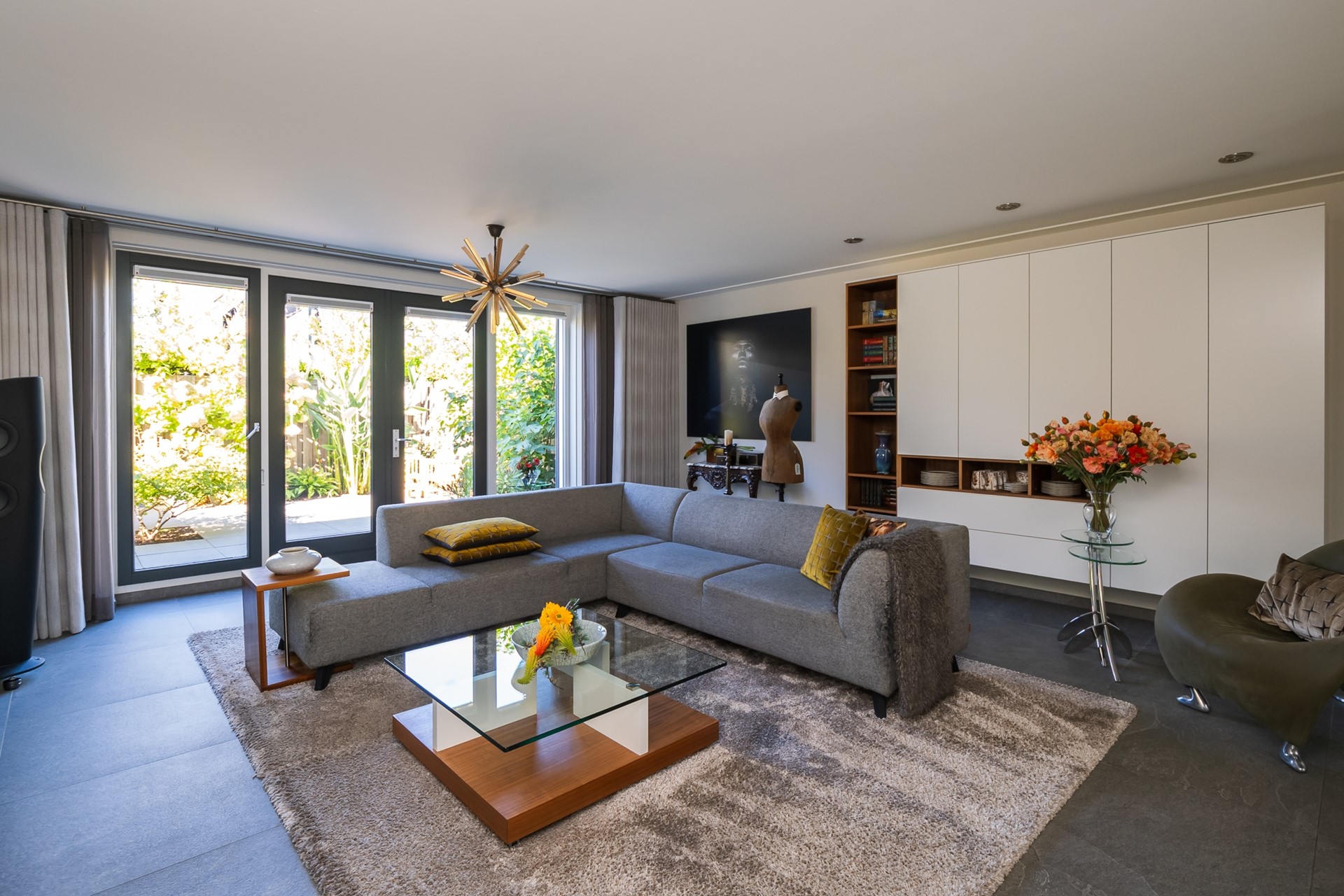 De imposante living is door de uitbouw nog royaler geworden en nodigt uit tot gezellig samenzijn. De brede glaspui met openslaande deuren zorgt voor een dynamische verbinding met de loungetuin. Overdag valt het licht royaal binnen en ’s avonds voorziet het speelse lichtplan in de juiste sfeer. De dubbele wavegordijnen, deels inbetween en deels verduisterend, zijn stijlvol en praktisch - deze zijn ter overname.
