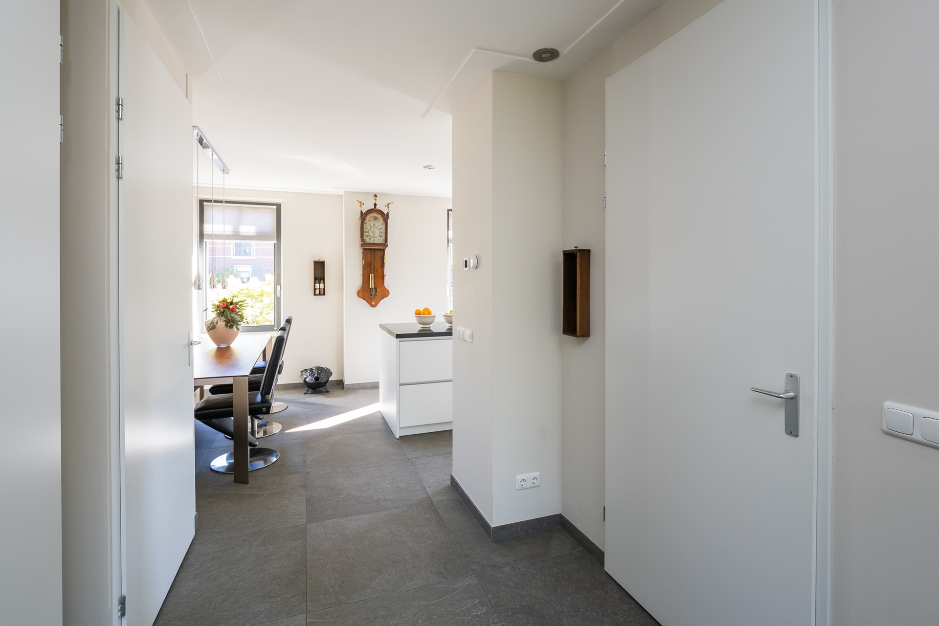 Een paneeldeur opent naar het riante woongedeelte, dat is verdeeld in een living en een woonkeuken.