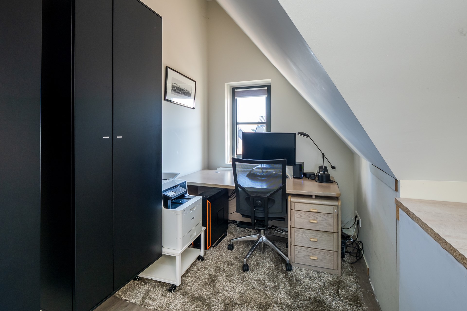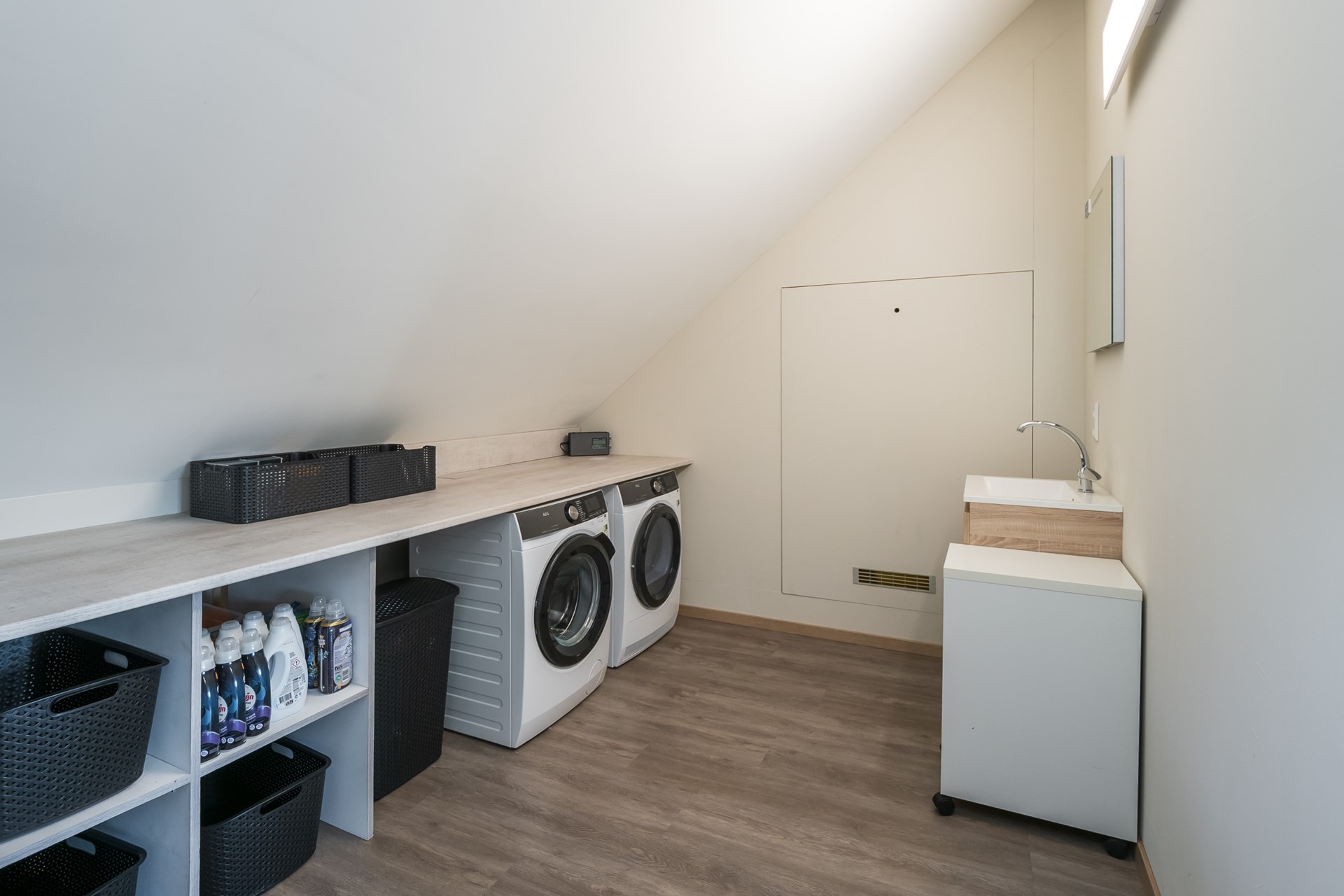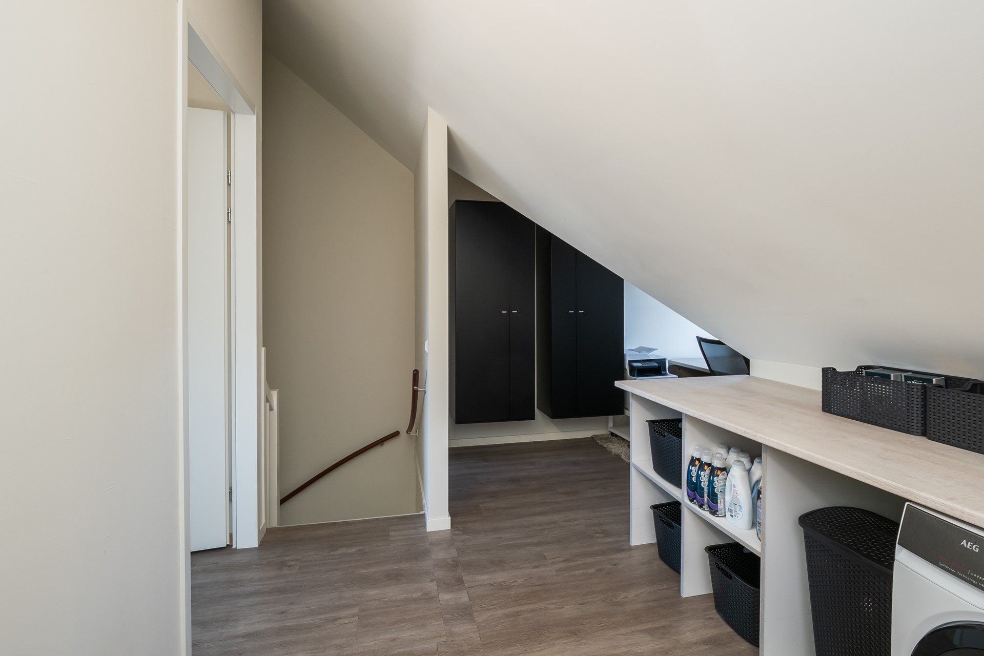 De tweede verdieping biedt verrassend veel ruimte en flexibiliteit. Allereerst betreed je hier een multifunctionele ruimte die momenteel dienstdoet als witgoedruimte en kantoor, maar die met gemak kan worden omgevormd tot een slaapkamer. In de witgoedruimte vind je de wasmachine-/drogeraansluiting en een wastafelmeubel met spiegel en verlichting. Achter het wegneembare paneel bevinden zich de installaties van de CV, mechanische ventilatie en zonnepanelen. Door de speelse dakvorm is aan de voorzijde een intieme nis ontstaan, die zich bij uitstek leent als kantoor-/werkhoek met een panoramisch uitzicht over de prachtige woonomgeving. Achter het knieschot is bovendien praktische bergruimte aanwezig.