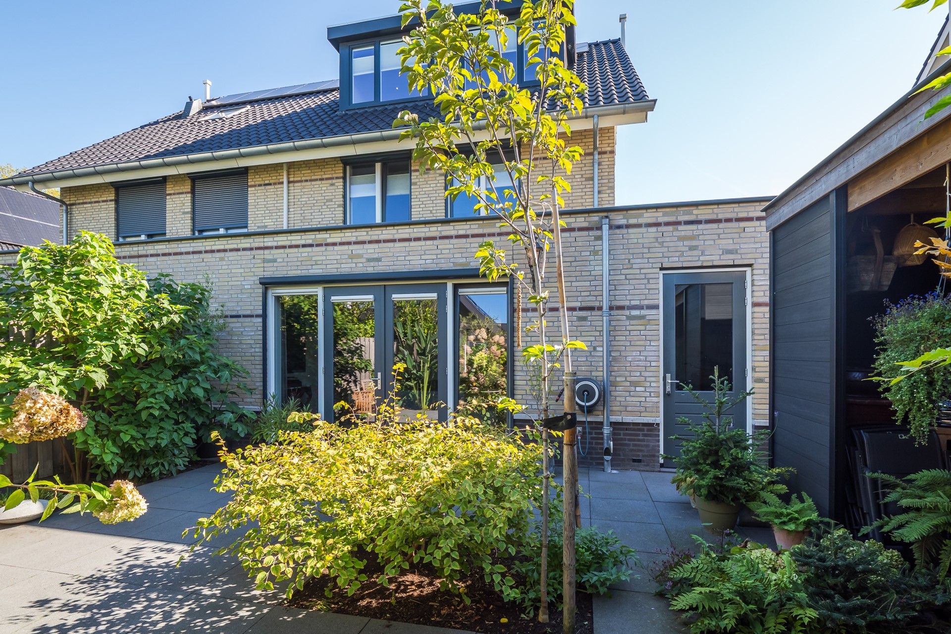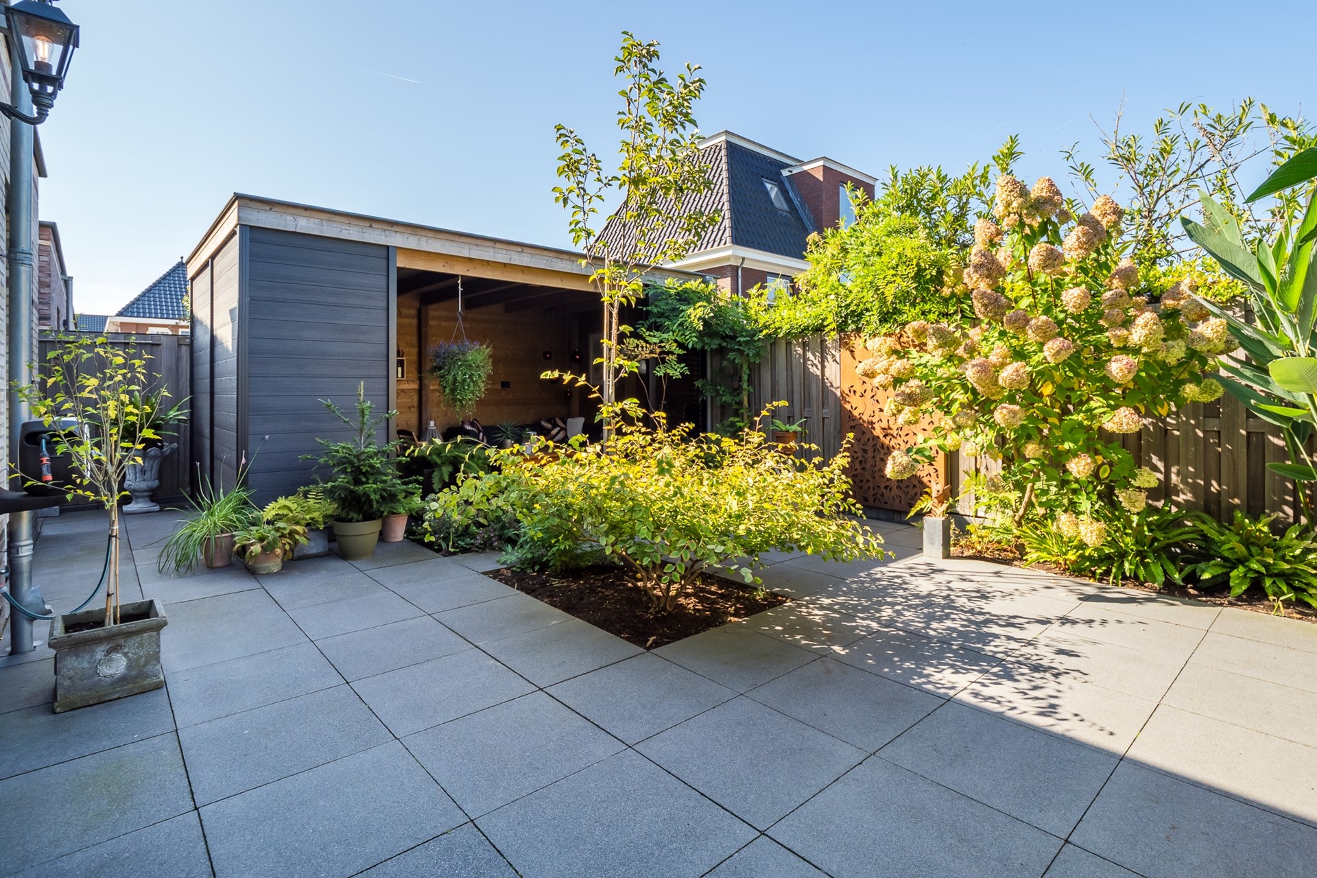 Achter de woning ligt de loungetuin die privacy, rust en groenbeleving moeiteloos combineert. De basis van groot formaat tegels is strak en modern, terwijl de speels ingerichte borders – rijk aan kleur en variatie – de tuin een levendige uitstraling geven. De veranda uit 2020 is het sfeervolle hart van dit buitenleven. De oriëntatie en het natuurlijke materiaalgebruik creëren een serene sfeer, waarin je vanzelf tot rust komt. Overdag zorgen shutters voor extra beschutting en 's avonds creëert de wandverlichting een sfeervolle ambiance. Dankzij de aanwezige stopcontacten is er volop ruimte voor extra comfort: denk aan een terrasverwarmer, buitenkeuken of andere elektrische gemakken. Kortom, hier beleef het buitenleven op zijn best; een plek waar je alle seizoenen profijt van hebt.