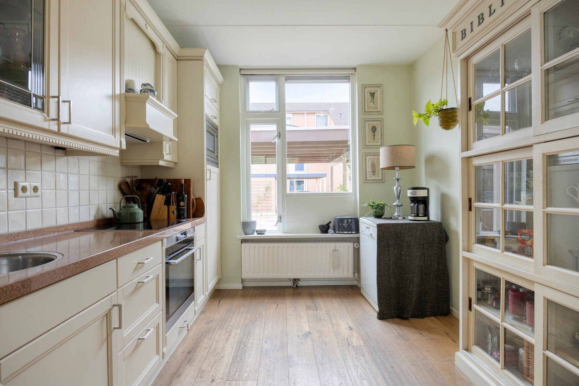 Via de hal stap je de woonkamer binnen; een heerlijke, lichte leefruimte met vrij uitzicht op de achtertuin. De strak gestuukte wanden, frisse kleuren en lichte eiken parketvloer zorgen samen voor een sfeervol geheel. Een plek waar je je direct thuis voelt. De open keuken aan de voorzijde is uitgevoerd in een lichte kleurstelling en voorzien van diverse inbouwapparatuur, zoals een hetelucht-/stoomoven, koelkast, magnetron en inductiekookplaat. De losse vaatwasser blijft achter.
