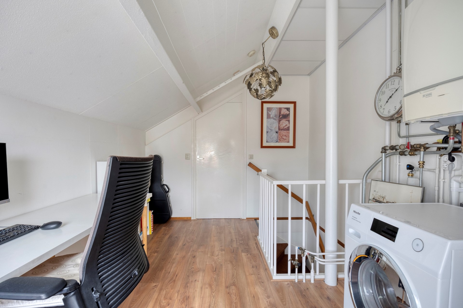 De tweede verdieping verrast met een grote vierde slaapkamer, volop licht en bergruimte. Op de overloop is plaats voor de wasmachine, cv-installatie én een werkplek; ideaal voor thuiswerken of studeren.