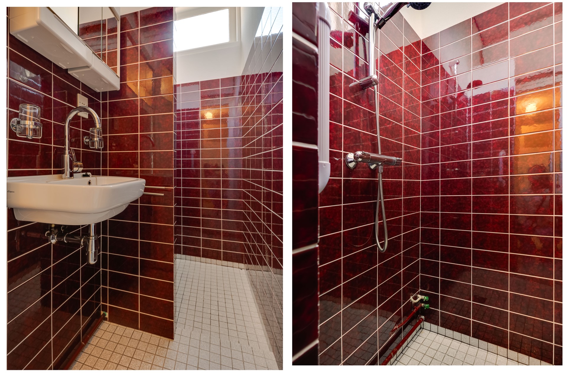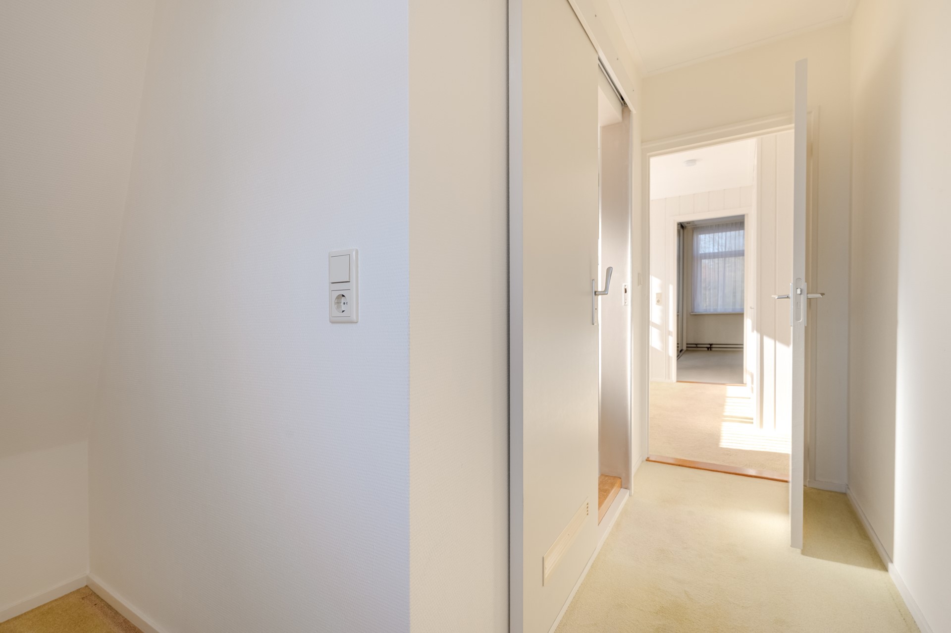 Overloop met deuren naar drie slaapkamers. Verder een badkamer met een douche met wastafel.