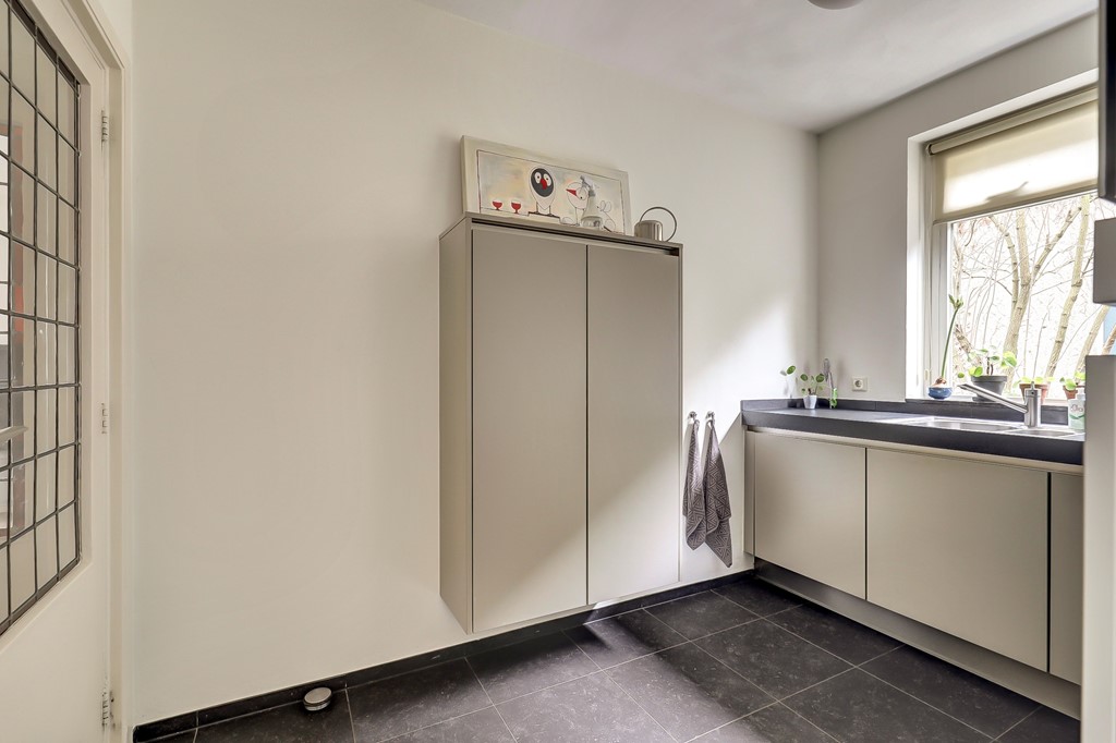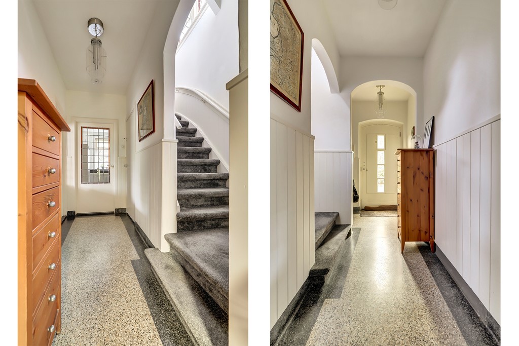 Bij binnenkomst wordt u direct verwelkomd door de fraaie trappartij, de granitovloer en de authentieke sfeer van het glas-in-lood. De begane grond is praktisch ingedeeld en voorzien van moderne gemakken: