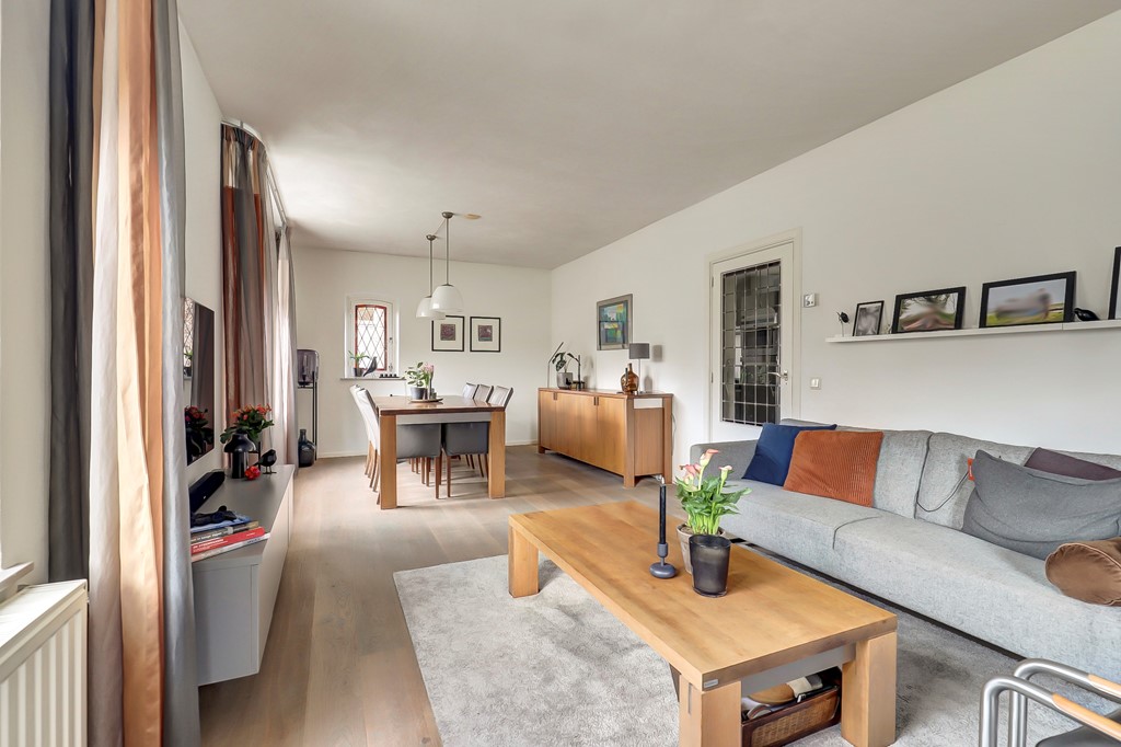 - Woonkamer: Een lichte ruimte met een eikenhouten vloer en een vrij uitzicht over de karakteristieke Heerbaan.
