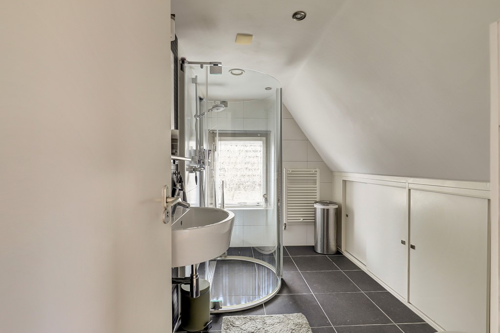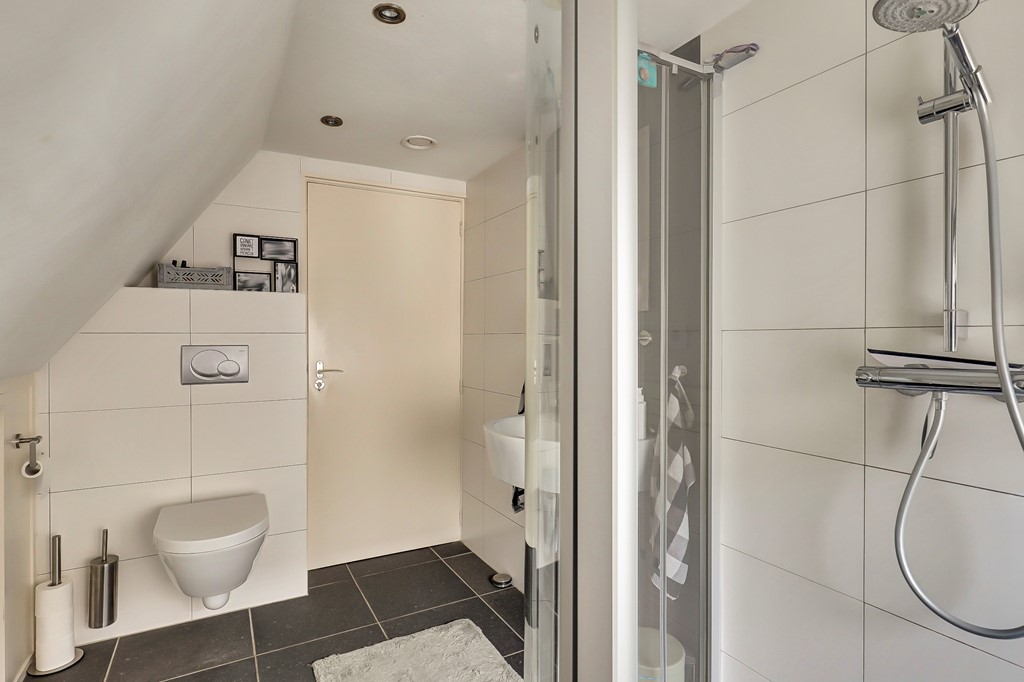 Op de verdieping bevinden zich twee slaapkamers en een nette badkamer. De badkamer is uitgerust met een douche, een tweede toilet, een wastafel en heerlijke vloerverwarming.