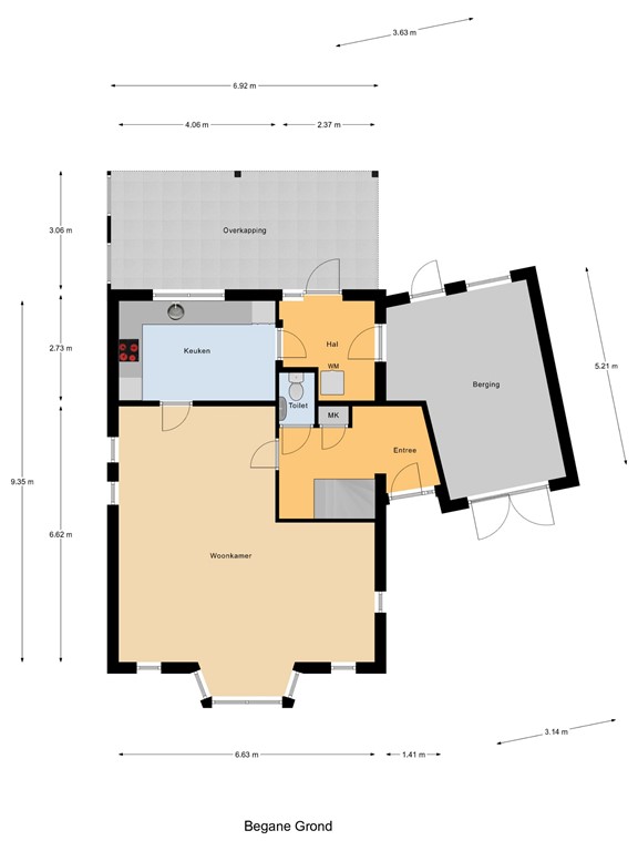 Entree, hal, toilet, meterkast, L-vormige woonkamer, woonkeuken, wasruimte, garage.