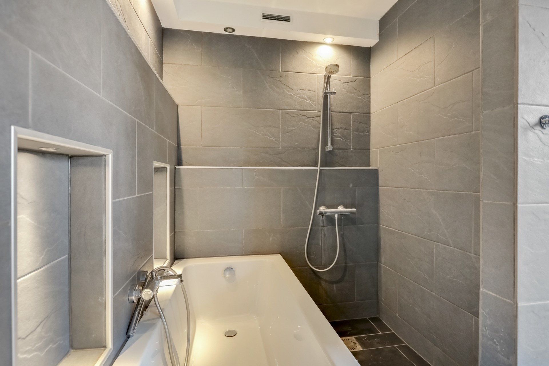 De badkamer op deze verdieping is reeds gemoderniseerd en van alle gemakken voorzien. Met een oppervlakte van 7 m² beschikt deze over een wastafelmeubel, inloopdouche, ligbad, tweede toilet en een balkondeur naar het dakterras (circa 7 m²).