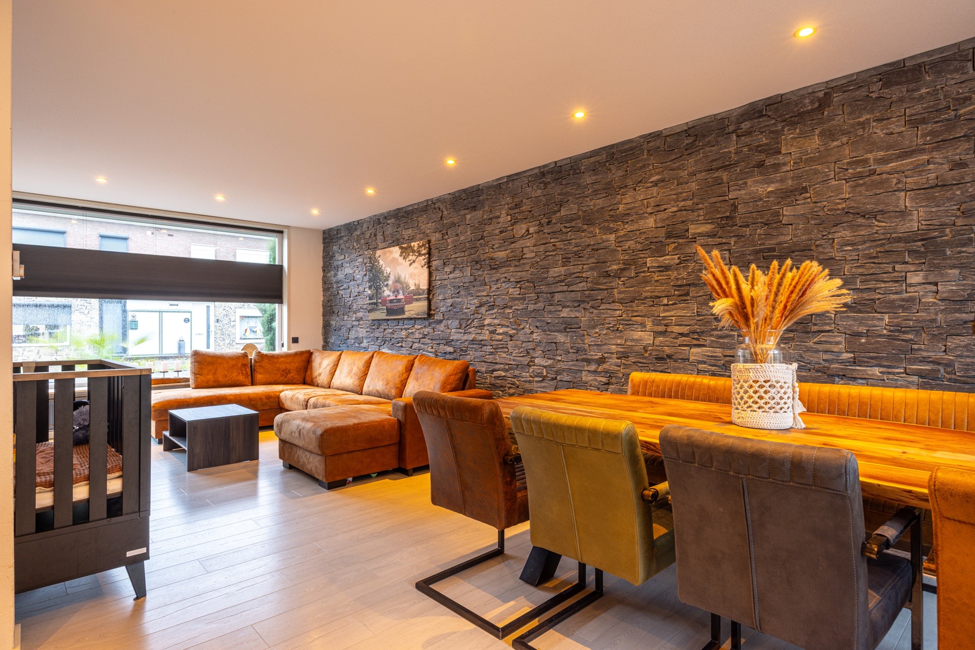De woonkamer biedt voldoende ruimte voor een royale zithoek en een eethoek. De indeling is praktisch en uitnodigend, waardoor dit een plek is waar je dagelijks comfortabel kunt wonen en ontspannen.
