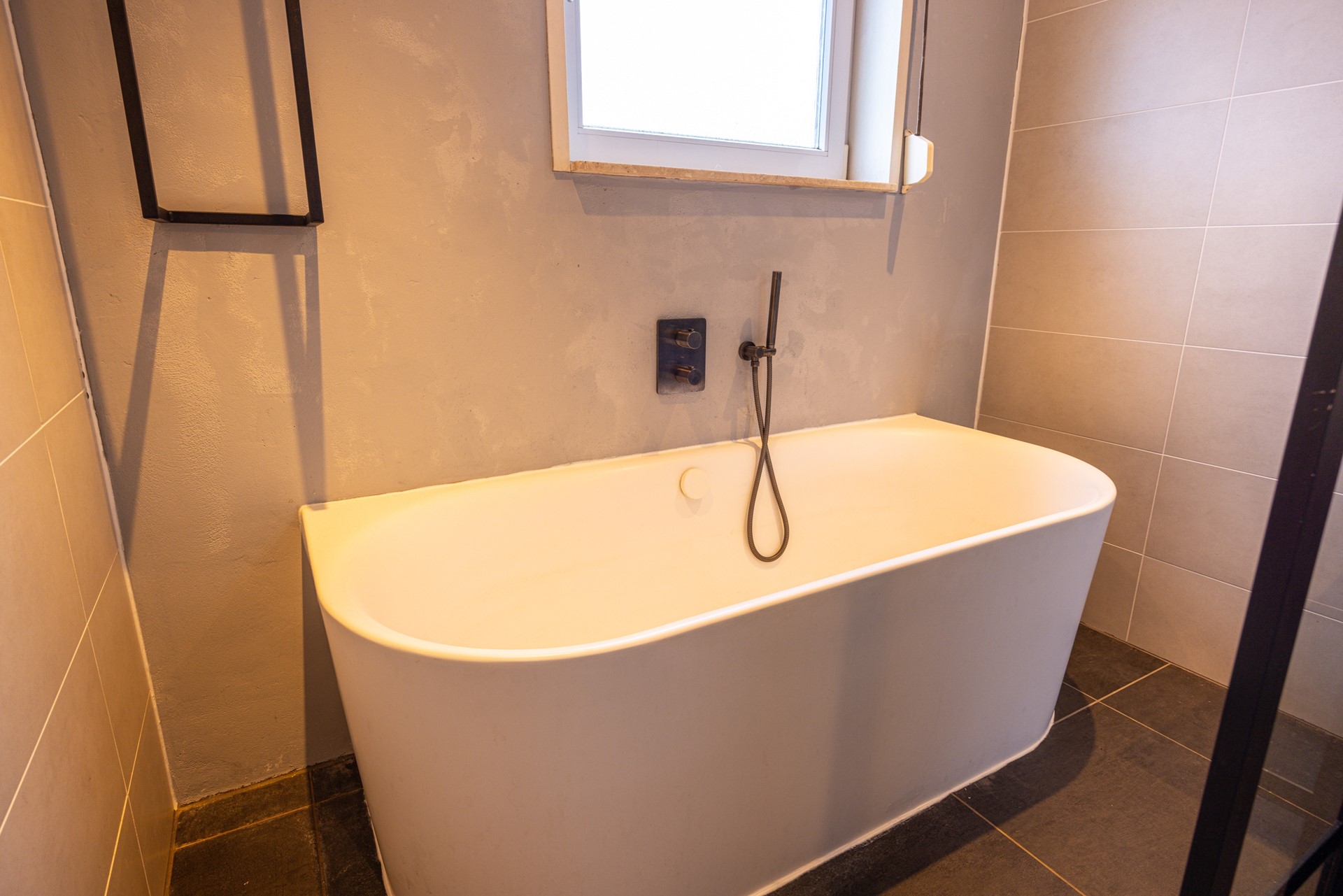 De badkamer is in 2021 vernieuwd en modern afgewerkt. De ruimte is compleet ingericht met zowel een inloopdouche als een ligbad, waardoor je kunt kiezen tussen snel douchen of ontspannen badderen. Het zwevende badkamermeubel met twee wasbakken en een spiegel met verlichting zorgt voor comfort in het dagelijks gebruik. Daarnaast is er een designradiator aanwezig voor extra warmte. Ook hier zijn kunststof kozijnen met dubbelglas en een rolluik aanwezig. Het geheel vormt een verzorgde en comfortabele badkamer die praktisch is ingericht en van alle gemakken is voorzien.