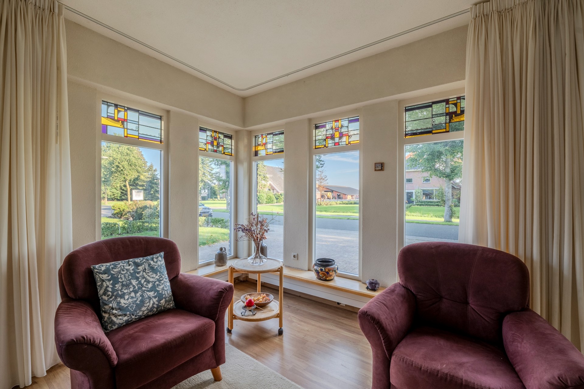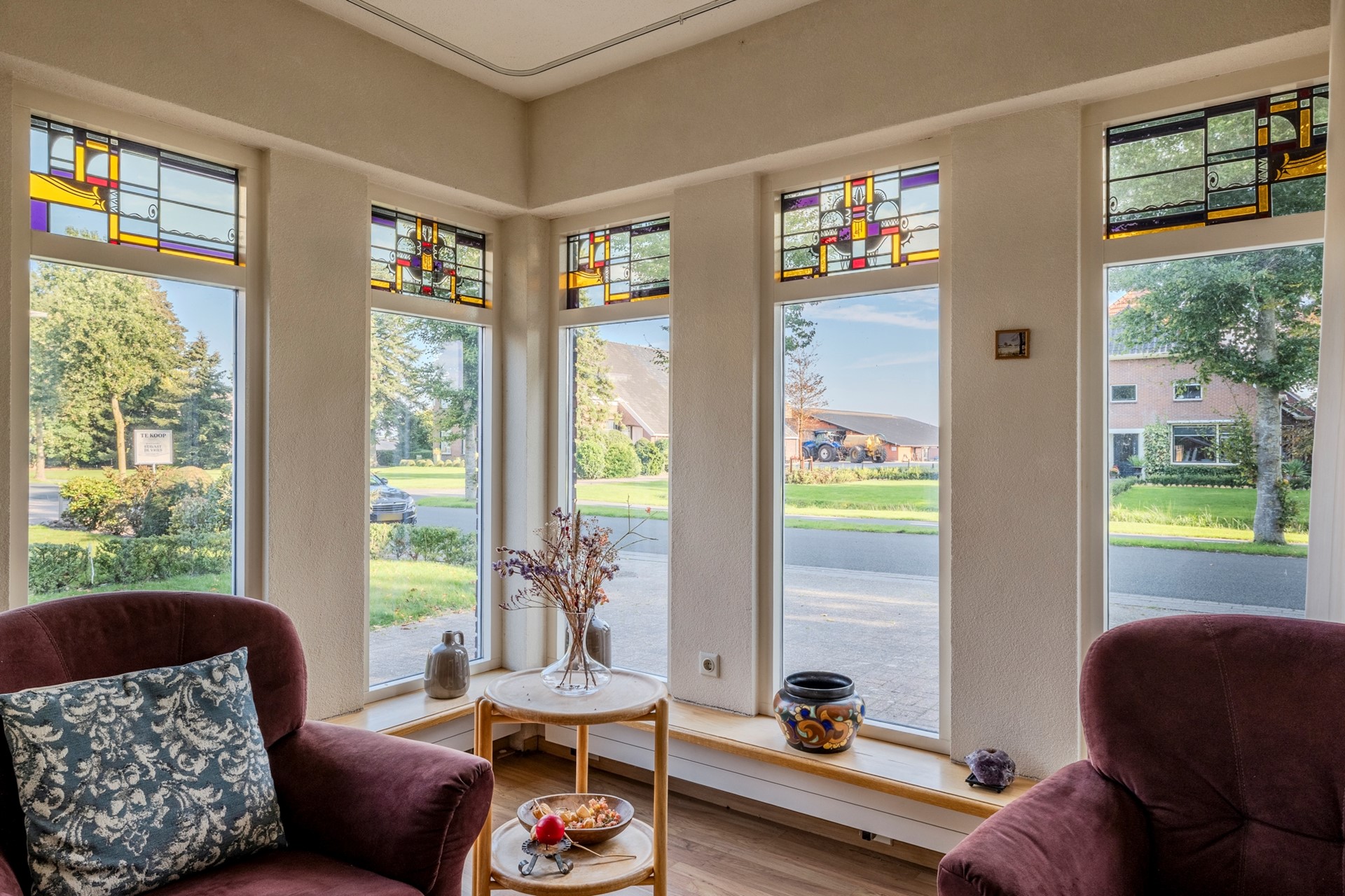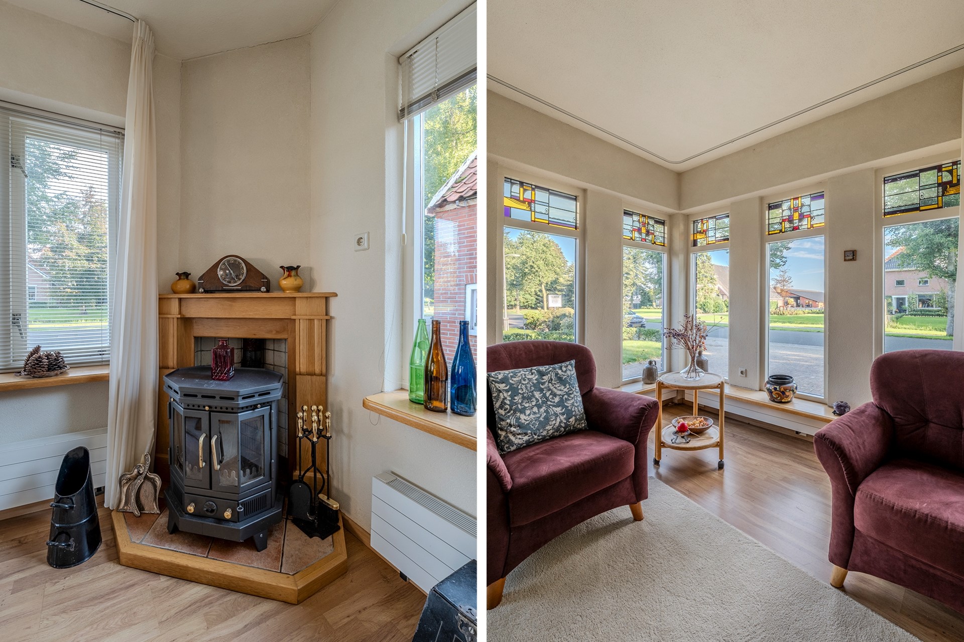 - Woonkamer (voor) met karakteristieke glas-in-loodraampjes en allesbrander