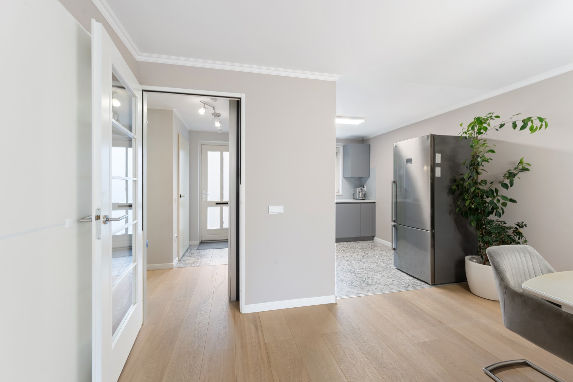 Entrance with hall, meter cupboard, and modern toilet with, bidet, and warm water. The spacious living room, with storage cupboard, was extended by 2.5 meters during construction. French doors provide access to the deep, well-kept backyard where you can enjoy the sun all day long. At the front, the modern open kitchen (2021) with tiles is equipped with built-in appliances such as a 5-burner gas hob, dishwasher, and oven. The living features a stylish oak wooden floor.