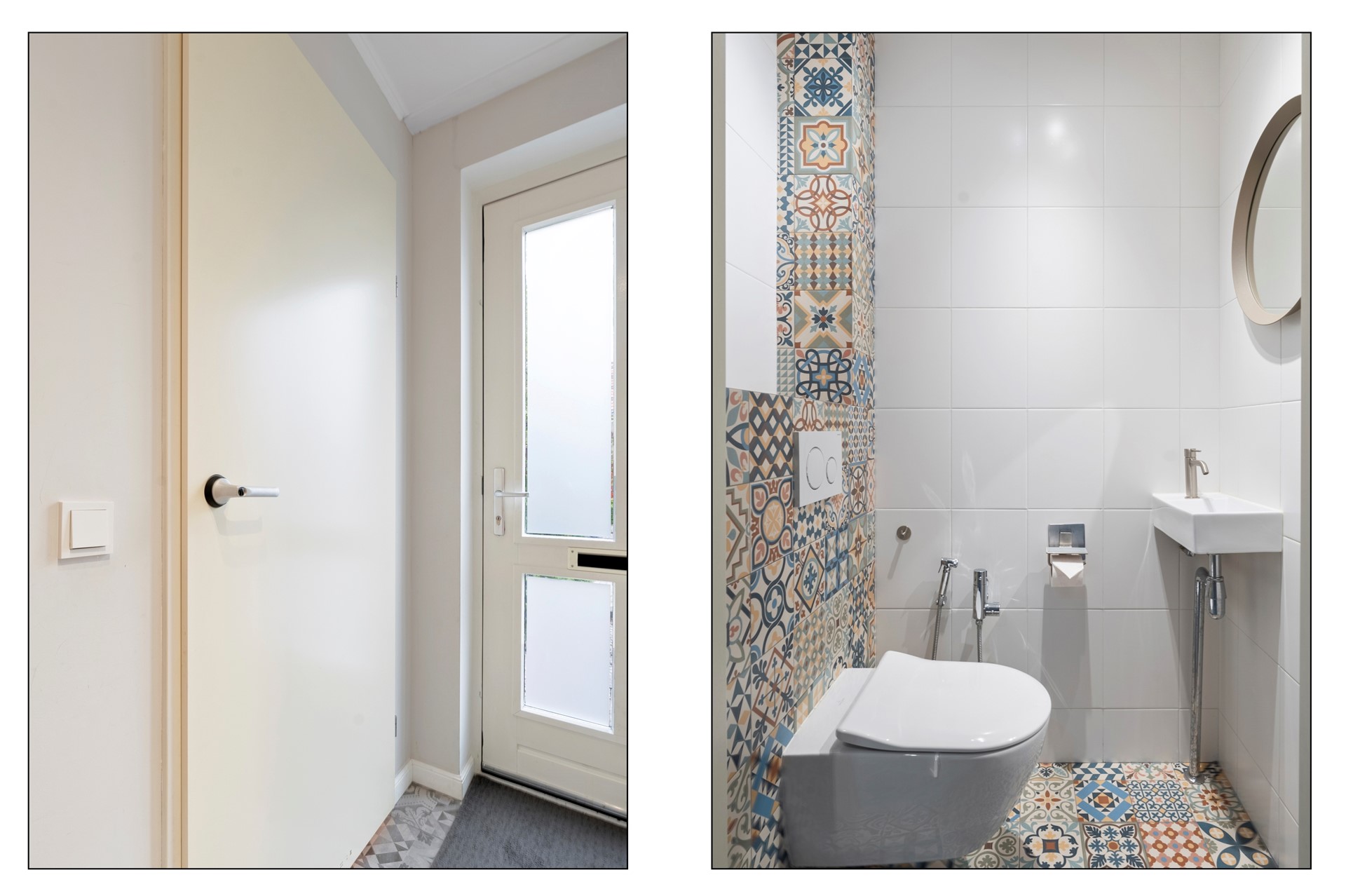 Entree met hal, meterkast en modern toilet, bidet en warm water. De royale woonkamer, voorzien van trapkast, is tijdens de bouw al 2,5 meter uitgebouwd. Openslaande deuren geven toegang tot de diepe en verzorgde achtertuin, waar je de hele dag door van de zon kunt genieten. Aan de voorzijde bevindt zich de moderne open keuken (2020) met inbouwapparatuur zoals een 5-pits gaskookplaat, vaatwasser en oven en tegelvloer afwerking. De woonkamer is afgewerkt met een sfeervolle eikenhouten vloer en de entree en toilet van een tegelvloer met vloerverwarming.