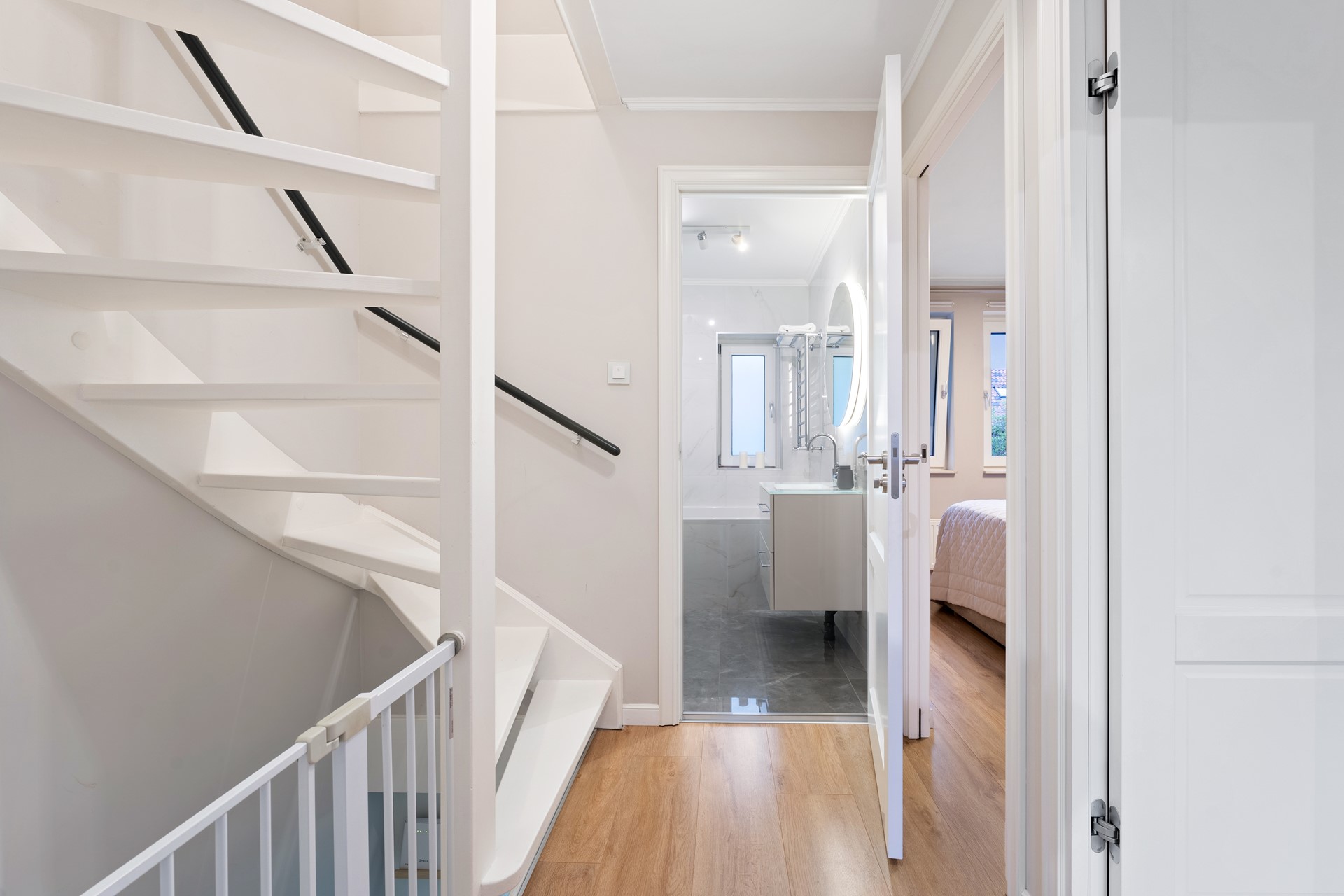 Overloop met drie lichte en ruime slaapkamers., waarvan een dienst doet als walk-in wardrobe. De luxe badkamer (2020) is voorzien van een wandcloset, ligbad/douche en een stijlvol wastafelmeubel.