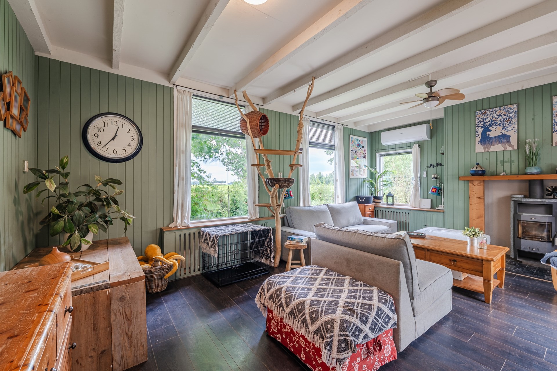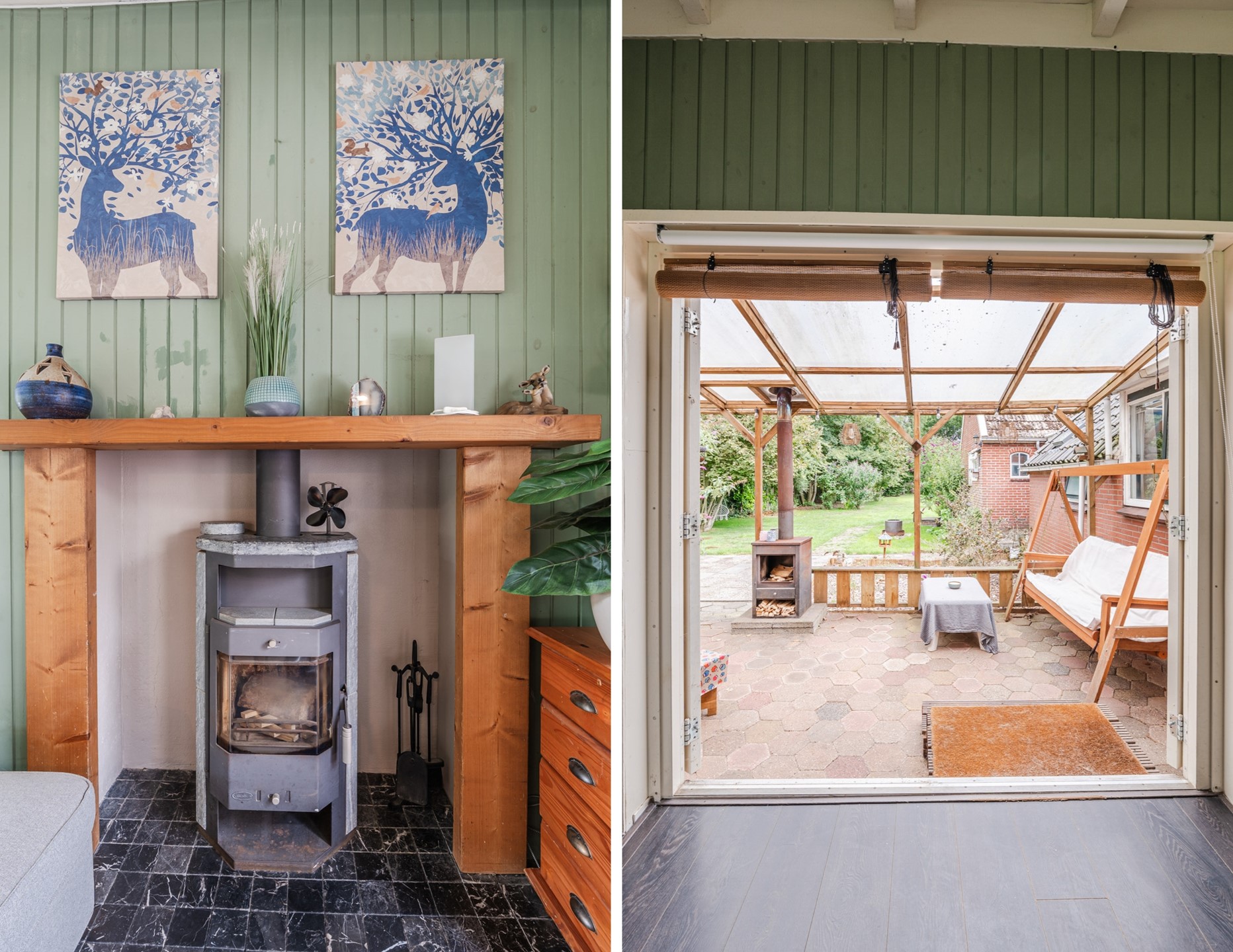 - Woonkamer (Voorzijde) met speksteen kachel, airco en openslaande deuren naar overkapping