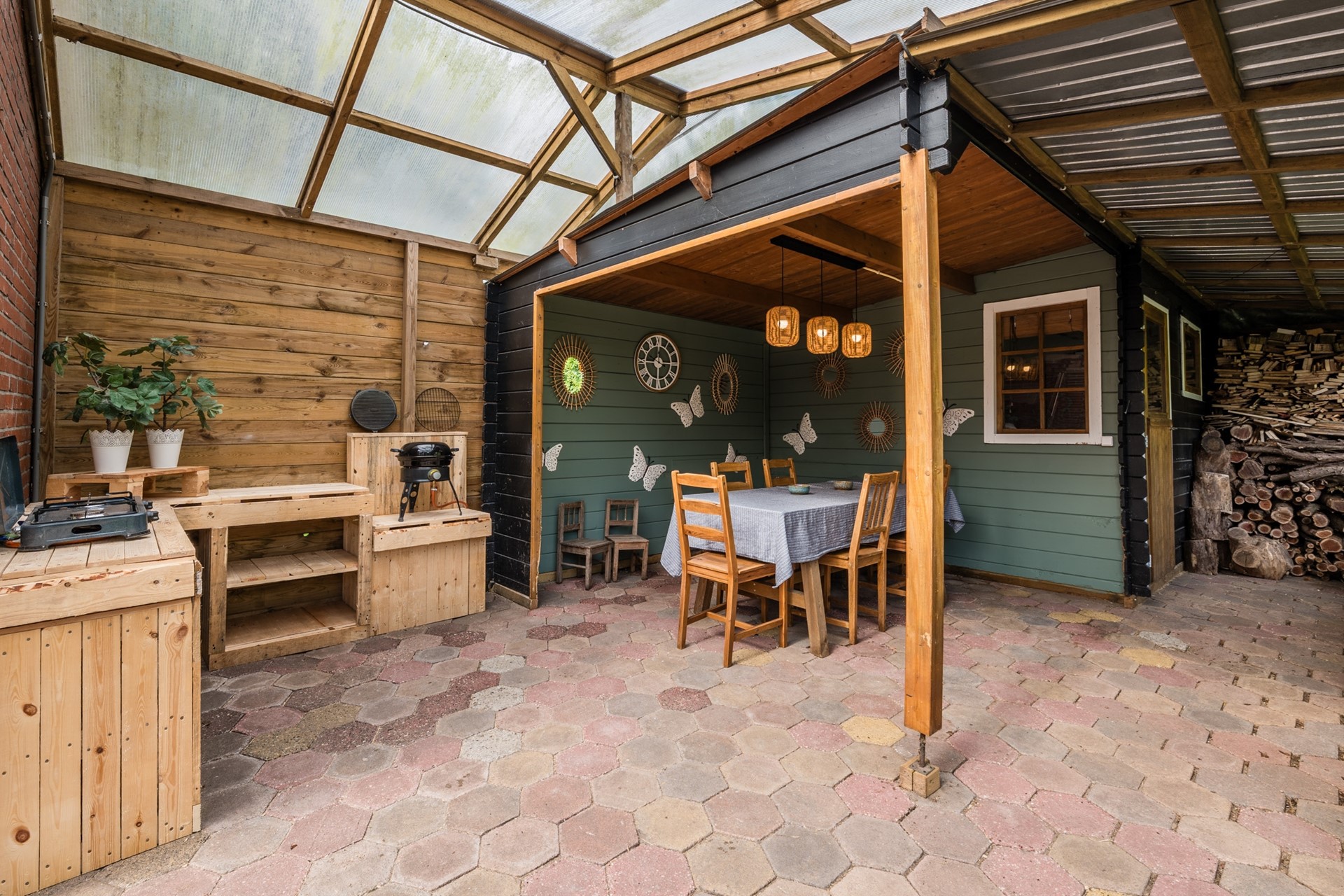 Als buitenmens kun je hier je geluk niet op. Met maar liefst 1.390 m2 grond om je heen leef je eigenlijk midden in het landschap, zonder directe buren die op je erf uitkijken. Je vind er een grote groene tuin, gezellig ingericht, met volop fruitbomen. Stel je voor: ontbijten onder overkapping, een gezellige barbecue, of gewoon een boekje lezen onder het bladerdak. Het leven buiten voelt hier als vanzelfsprekend.