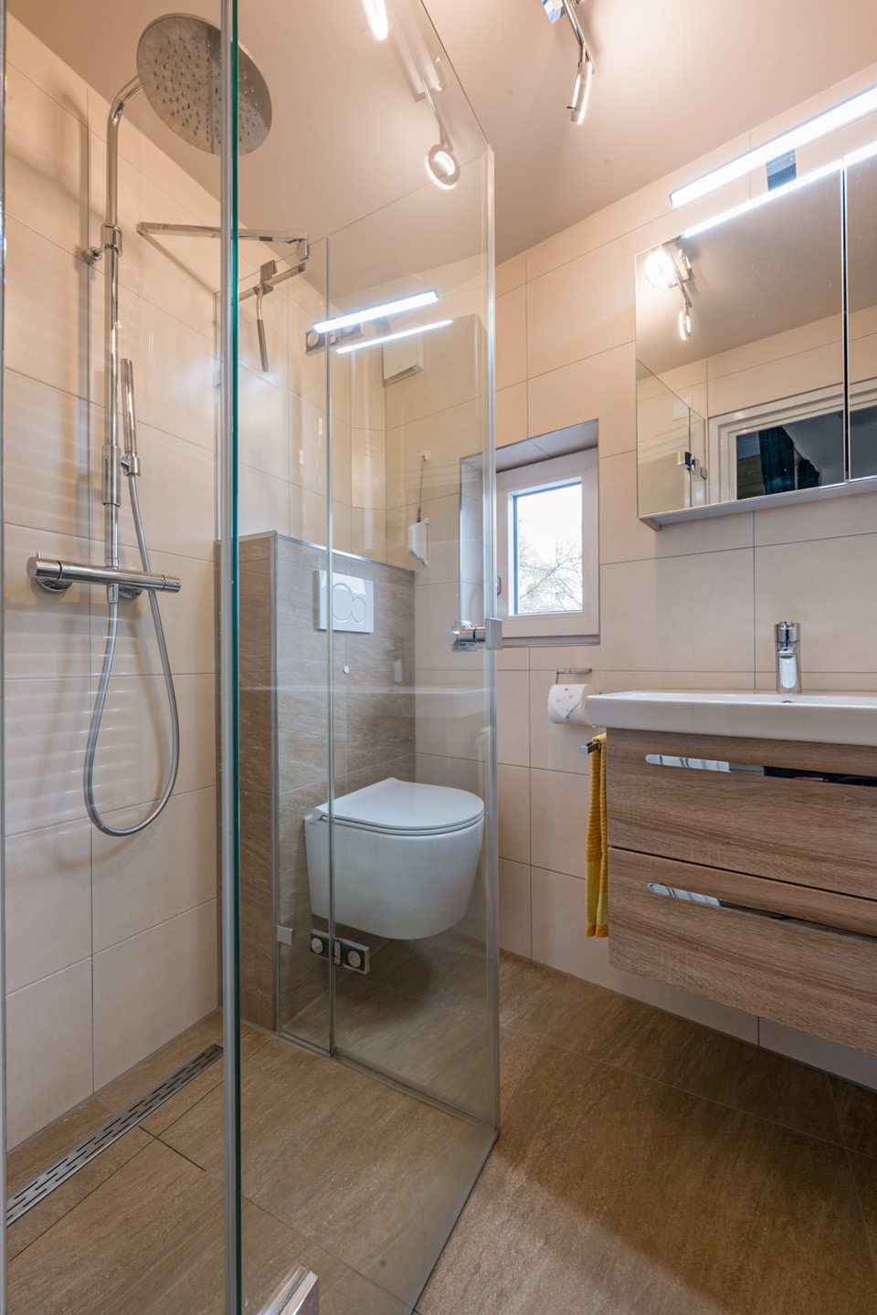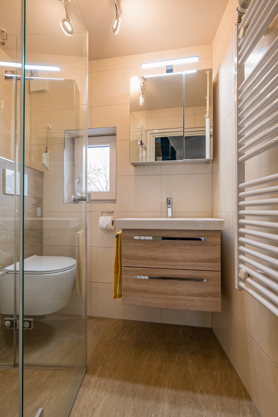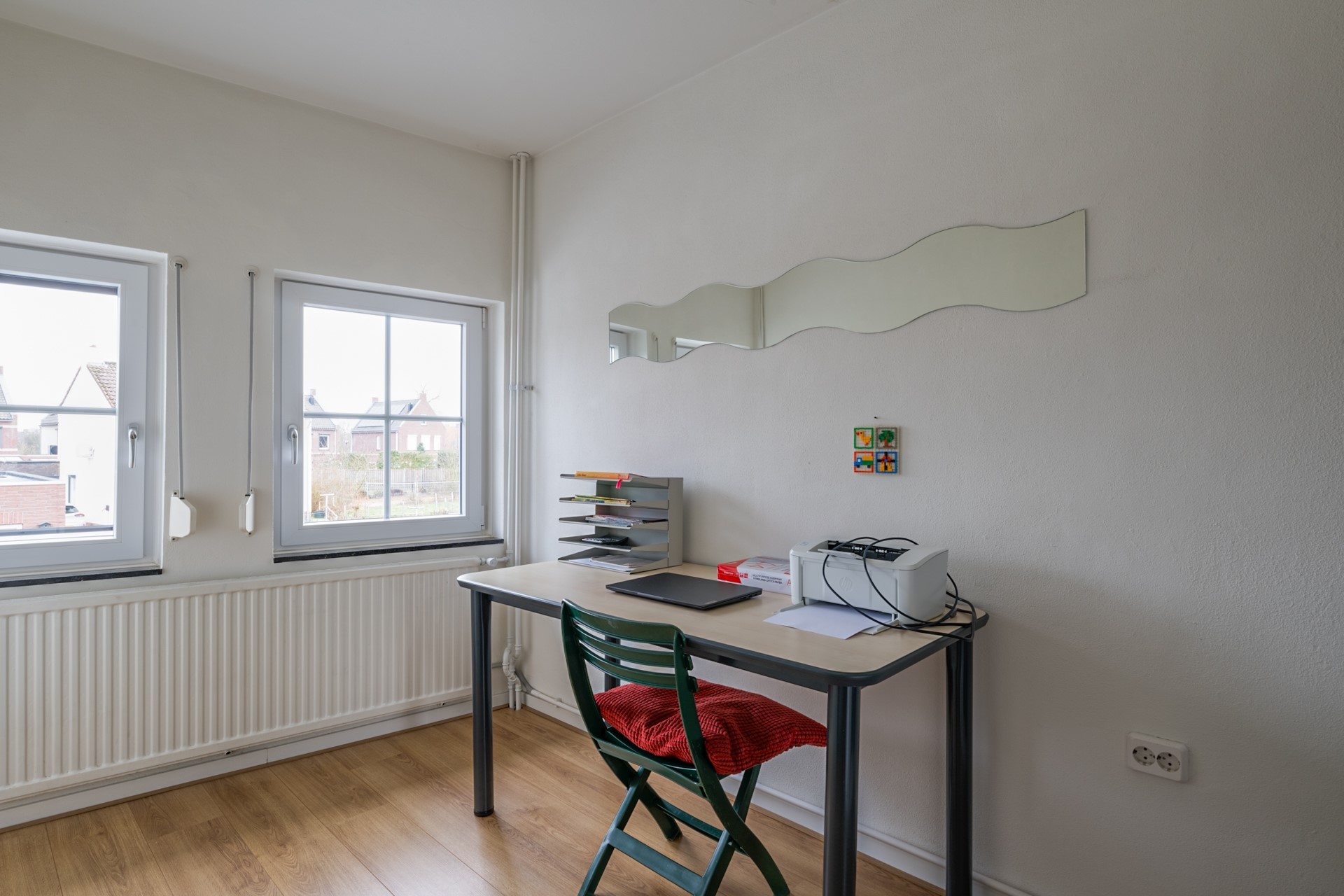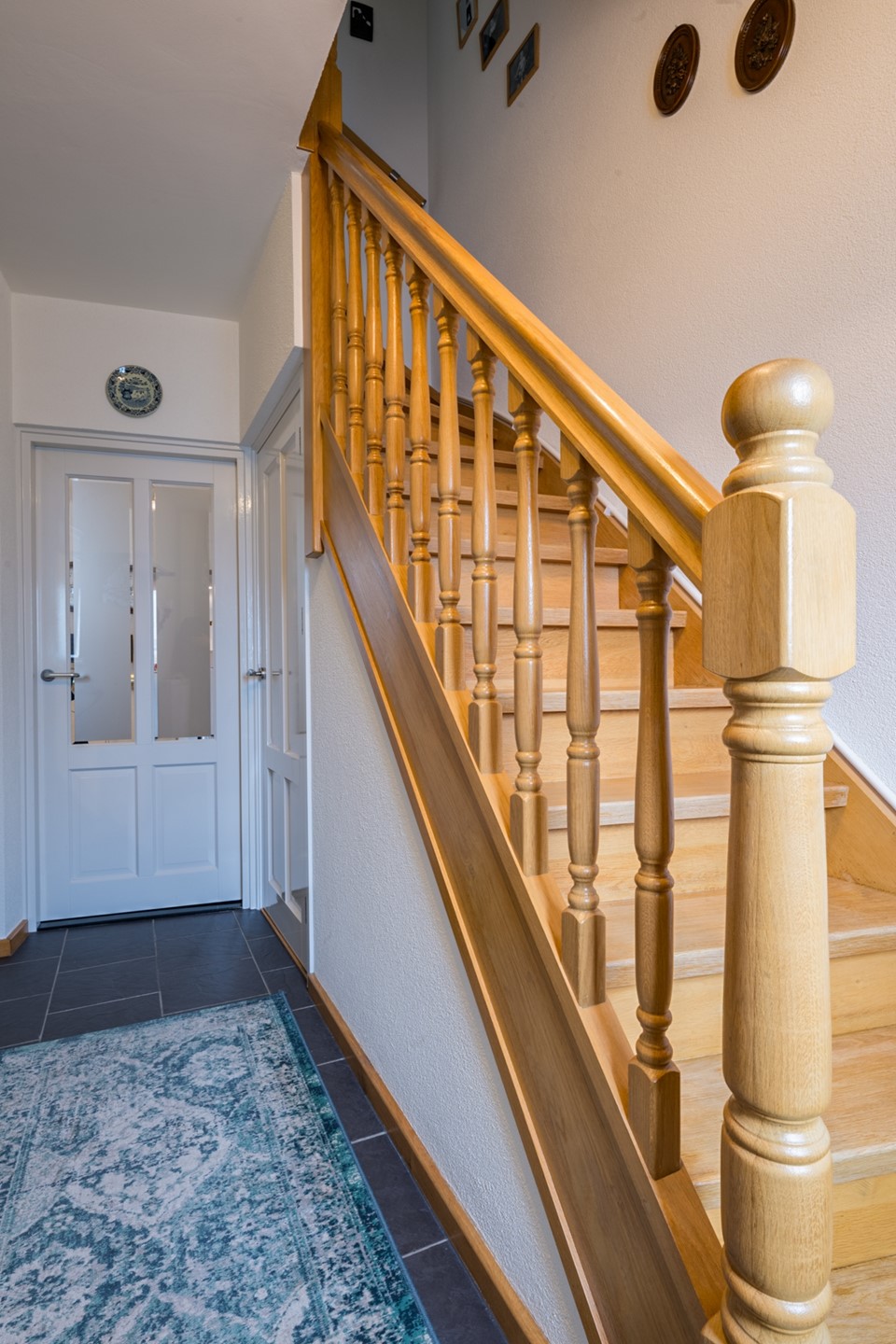 Via de eikenhouten trap bereikt u de eerste verdieping. De overloop is afgewerkt met een laminaatvloer en biedt toegang tot drie slaapkamers en de badkamer. Alle slaapkamers zijn voorzien van een laminaatvloer en genieten van prettig daglicht. Dankzij de aanwezige rolluiken kunt u de ruimtes naar wens verduisteren. De kamers zijn praktisch van formaat en flexibel in te delen, waardoor zij geschikt zijn als slaap-, kinder-, werk- of hobbykamer. Eén van de slaapkamers beschikt bovendien over een kleine muurkast, perfect voor extra bergruimte. De badkamer is verzorgd en compleet ingericht. Hier treft u een inloopdouche met regendouche en glazen douchewand, een badkamermeubel met wastafel en spiegel met verlichting, een zwevend closet en een designradiator. Ook hier is een rolluik aanwezig.